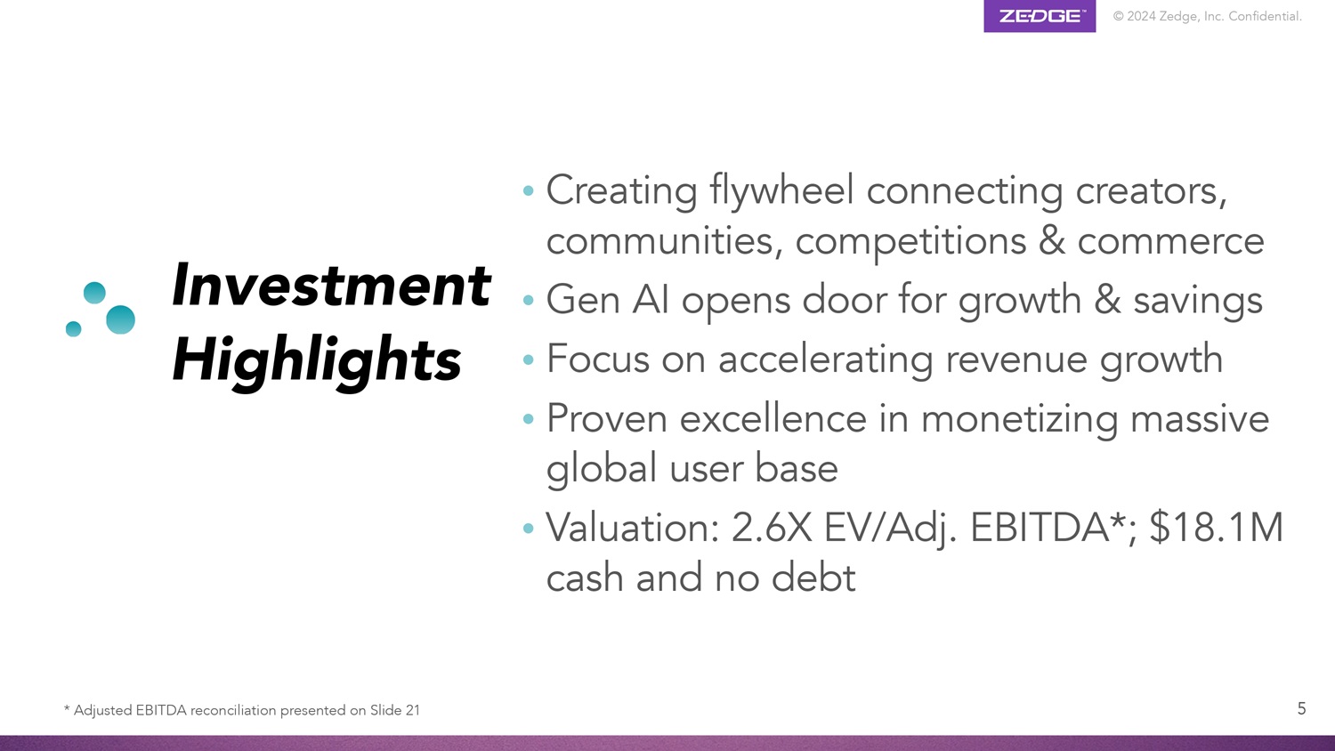 © 2024 Zedge, Inc. Confidential. Product Ecosystem GuruShots World’s leading photo game with 165M photos and 7.5M installs 4 Zedge Marketplace Marketplace for mobile phone personalization content with ~29M MAU Emojipedia #1 trusted search engine for all things emoji with ~10M MAU Portfolio of Category Leading Digital Brands