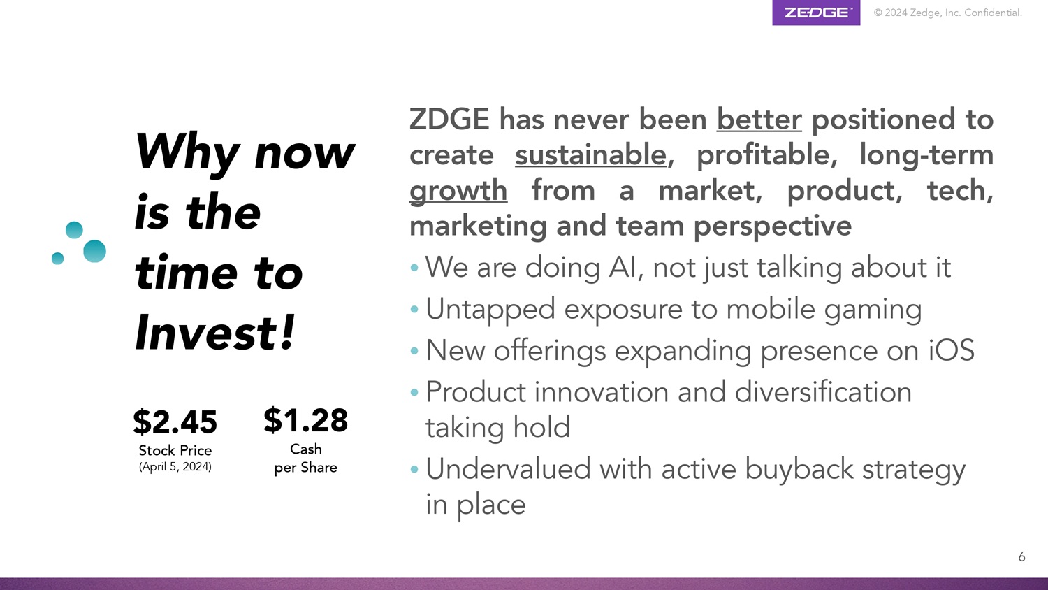 © 2024 Zedge, Inc. Confidential. • Creating flywheel connecting creators, communities, competitions & commerce • Gen AI opens door for growth & savings • Focus on accelerating revenue growth • Proven excellence in monetizing massive global user base • Valuation: 2.6X EV/Adj. EBITDA*; $18.1M cash and no debt 5 * Adjusted EBITDA reconciliation presented on Slide 21 Investment Highlights