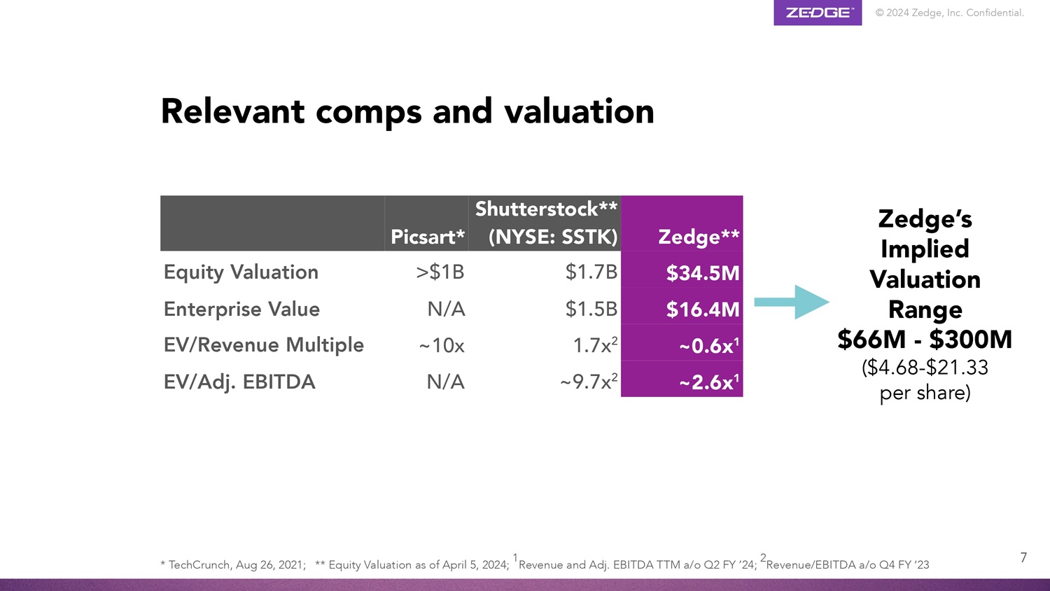 © 2024 Zedge, Inc. Confidential. 6 Why now is the time to Invest! ZDGE has never been better positioned to create sustainable , profitable, long - term growth from a market, product, tech, marketing and team perspective • We are doing AI, not just talking about it • Untapped exposure to mobile gaming • New offerings expanding presence on iOS • Product innovation and diversification taking hold • Undervalued with active buyback strategy in place $2.45 Stock Price (April 5, 2024) $1.28 Cash per Share