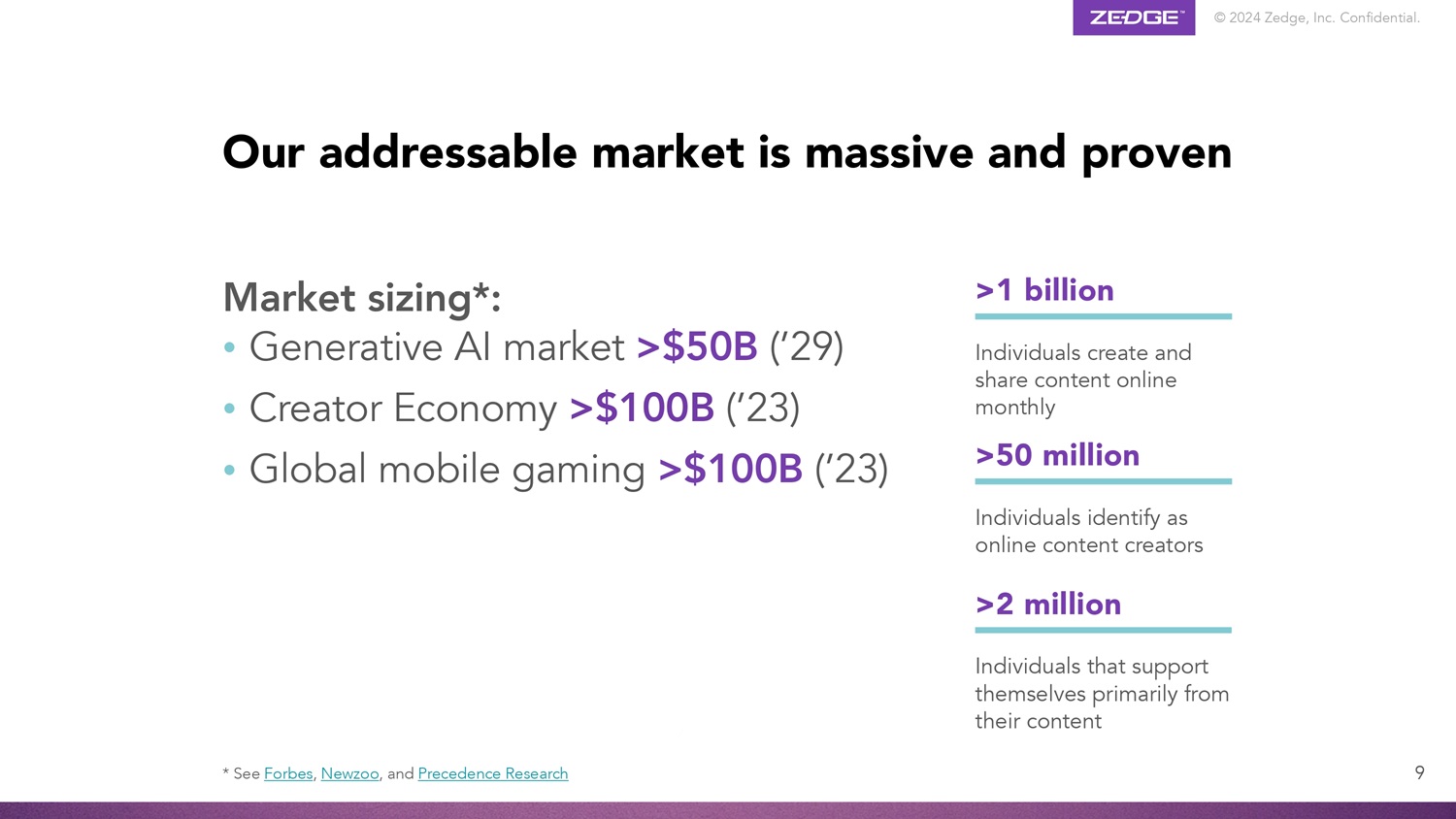 © 2024 Zedge, Inc. Confidential. 8 We’re all all about the 4 ‘C’s Marketing Games draw creators into a wide community with fun and friendly competitions COMPETITION AI tools enable all users to easily become creators CREATION Social features enable creators to share, connect, and compete in meaningful ways COMMUNITY Acquire Create Engage Monetize Zedge Premium marketplace and associated marketing funnels COMMERCE
