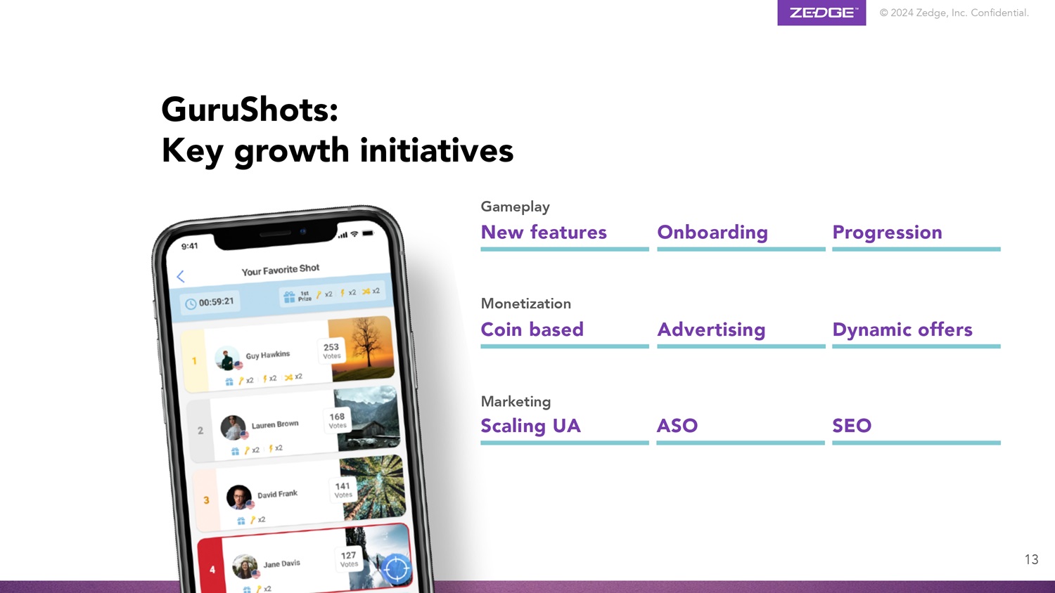 © 2024 Zedge, Inc. Confidential. Product Highlights Casual game genre Single player or team dynamic General 30 - 40M TAM 165M Photos in Catalogue Business Model Freemium with In - App Purchases Migrating to coin - based economy with advertising GuruShots: Leading, global, photo competition game 12
