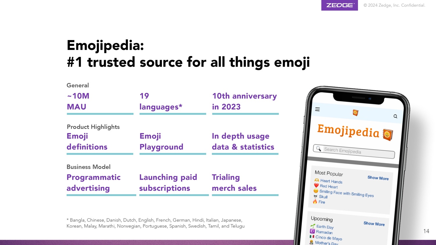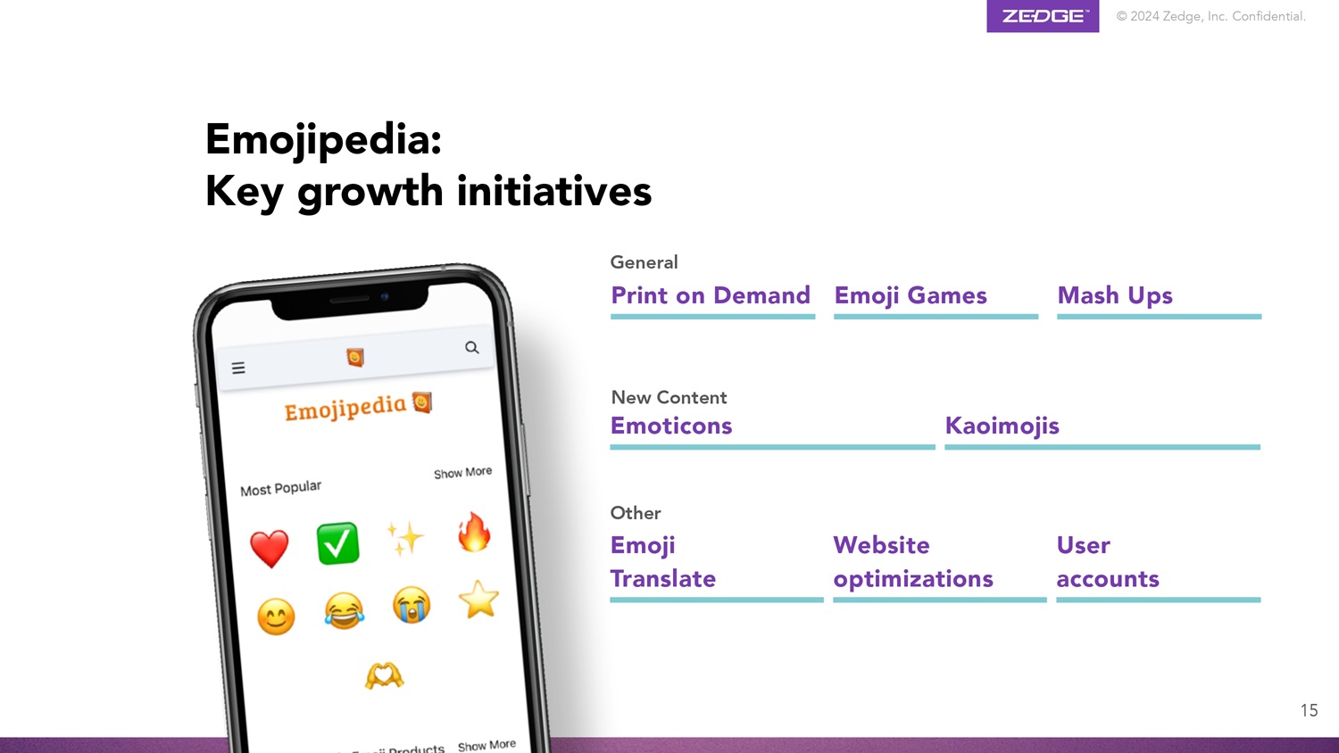 © 2024 Zedge, Inc. Confidential. User accounts Other Emoji Translate Website optimizations New Content Emoticons Kaoimojis General Print on Demand Emoji Games Mash Ups Emojipedia: Key growth initiatives 15