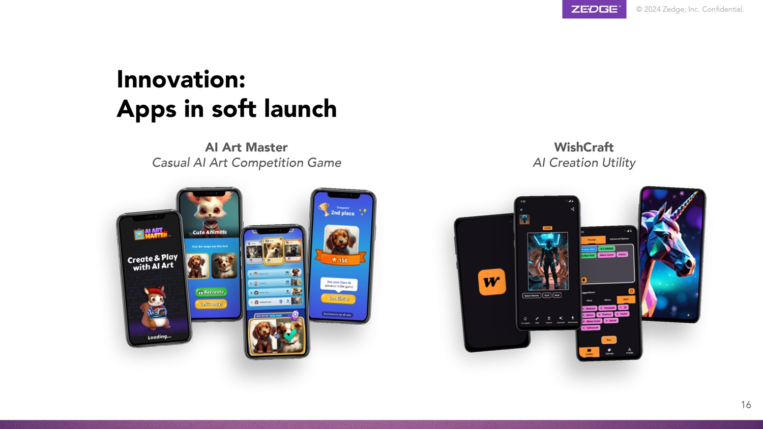 © 2024 Zedge, Inc. Confidential. Innovation: Apps in soft launch AI Art Master Casual AI Art Competition Game WishCraft AI Creation Utility 16