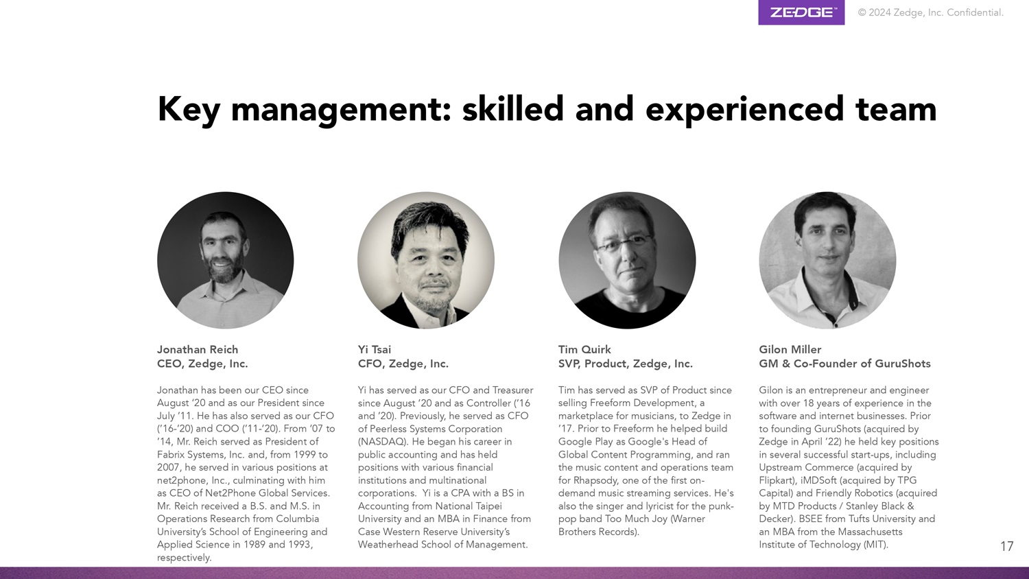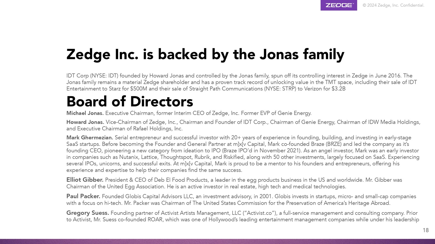 © 2024 Zedge, Inc. Confidential. 17 Jonathan Reich CEO, Zedge, Inc. Jonathan has been our CEO since August ‘20 and as our President since July ’11. He has also served as our CFO (’16 - ’20) and COO (’11 - ’20). From ’07 to ’14, Mr. Reich served as President of Fabrix Systems, Inc. and, from 1999 to 2007, he served in various positions at net2phone, Inc., culminating with him as CEO of Net2Phone Global Services. Mr. Reich received a B.S. and M.S. in Operations Research from Columbia University’s School of Engineering and Applied Science in 1989 and 1993, respectively. Yi Tsai CFO, Zedge, Inc. Yi has served as our CFO and Treasurer since August ’20 and as Controller (’16 and ’20). Previously, he served as CFO of Peerless Systems Corporation (NASDAQ). He began his career in public accounting and has held positions with various financial institutions and multinational corporations. Yi is a CPA with a BS in Accounting from National Taipei University and an MBA in Finance from Case Western Reserve University’s Weatherhead School of Management. Tim Quirk SVP, Product, Zedge, Inc. Tim has served as SVP of Product since selling Freeform Development, a marketplace for musicians, to Zedge in ’17. Prior to Freeform he helped build Google Play as Google's Head of Global Content Programming, and ran the music content and operations team for Rhapsody, one of the first on - demand music streaming services. He's also the singer and lyricist for the punk - pop band Too Much Joy (Warner Brothers Records). Key management: skilled and experienced team Gilon Miller GM & Co - Founder of GuruShots Gilon is an entrepreneur and engineer with over 18 years of experience in the software and internet businesses. Prior to founding GuruShots (acquired by Zedge in April ’22) he held key positions in several successful start - ups, including Upstream Commerce (acquired by Flipkart), iMDSoft (acquired by TPG Capital) and Friendly Robotics (acquired by MTD Products / Stanley Black & Decker). BSEE from Tufts University and an MBA from the Massachusetts Institute of Technology (MIT).