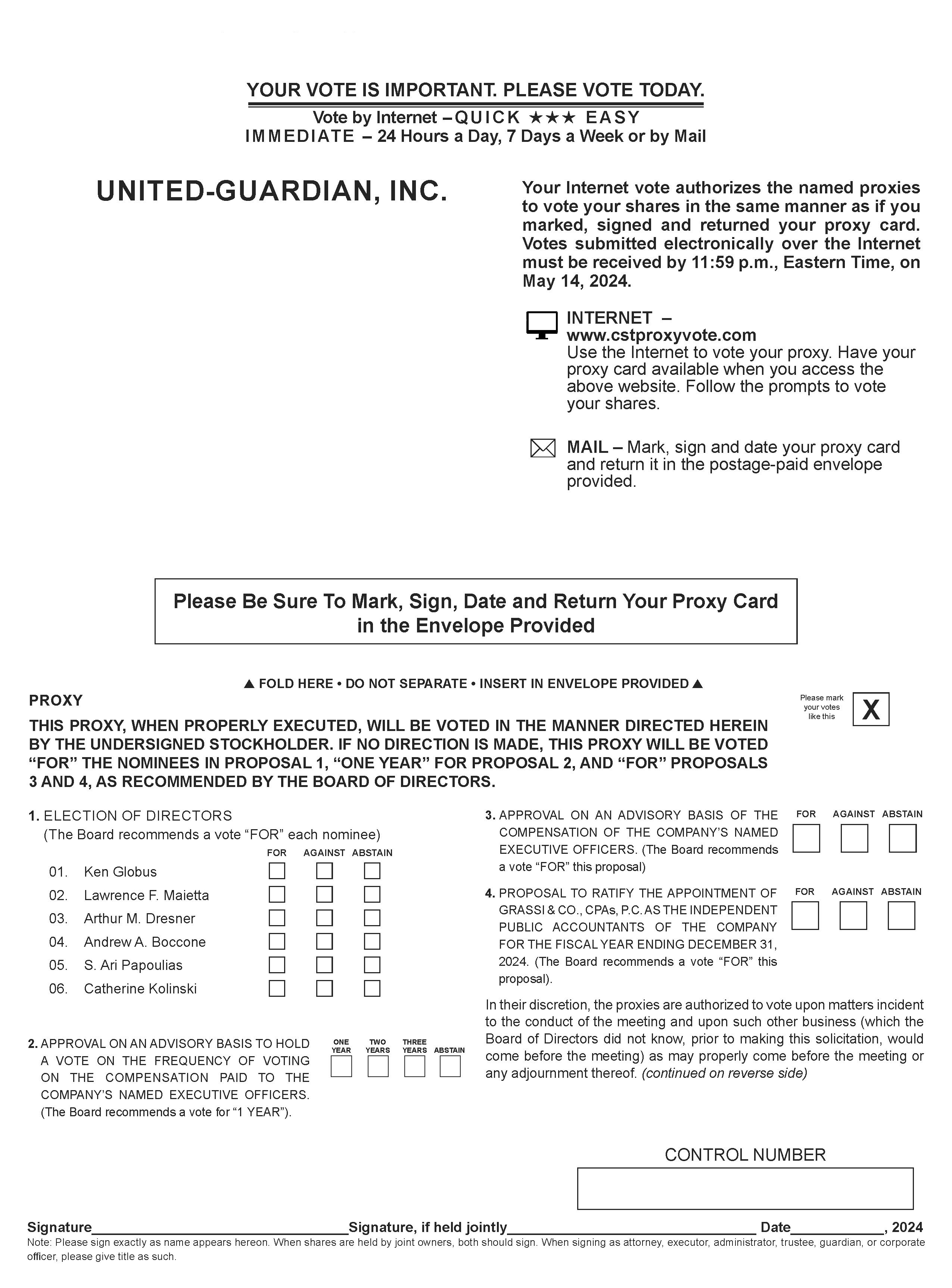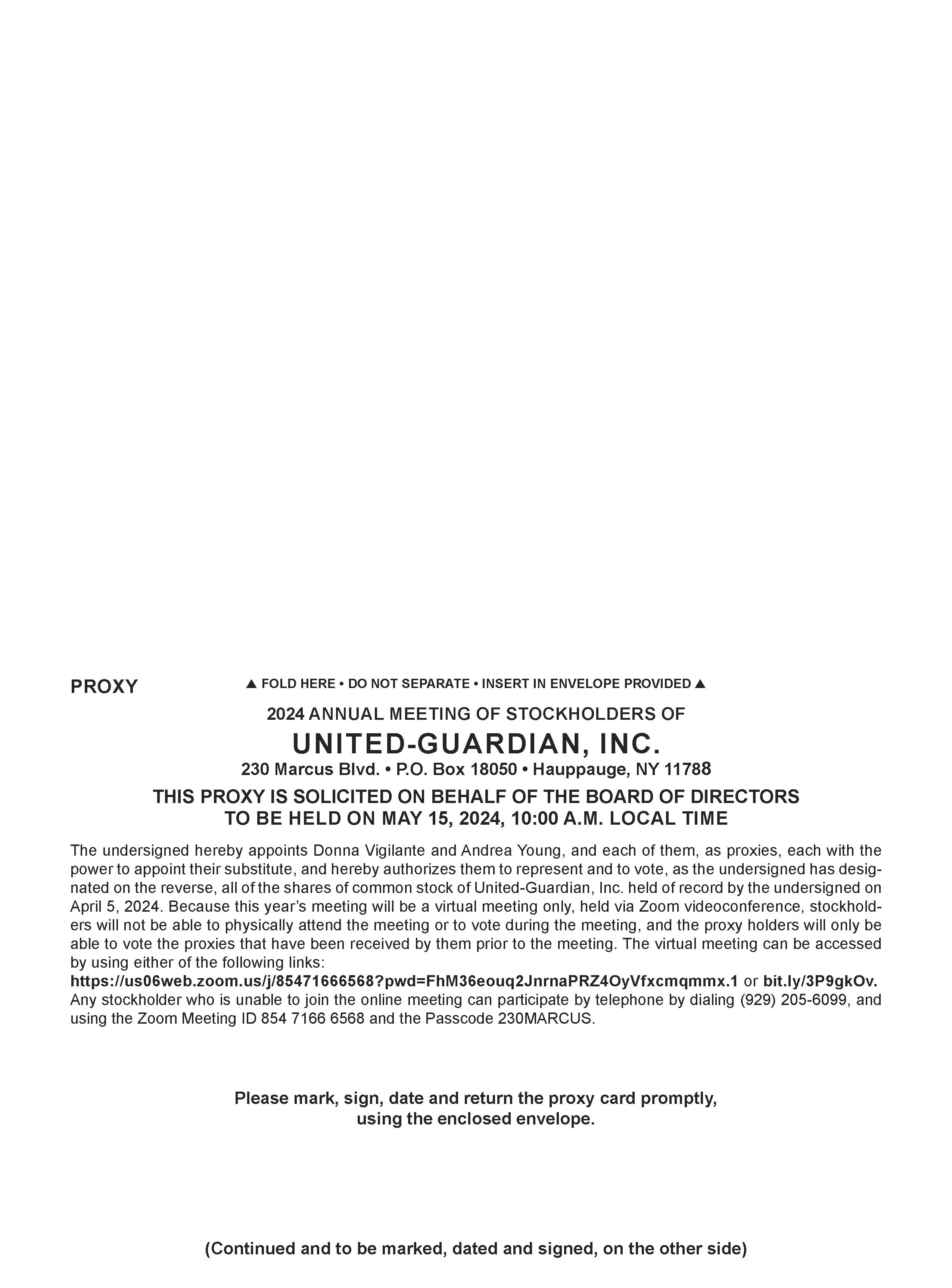 You are hereby notified that the 2024 annual meeting of stockholders (“Annual Meeting”) of UNITED-GUARDIAN, INC. (the “Company”), will be held on Wednesday, May 15, 2024 at 10:00 A.M. Eastern Time. The Annual Meeting will be a virtual meeting only and will be held via a Zoom videoconference. Stockholders will not be able to physically attend the meeting.