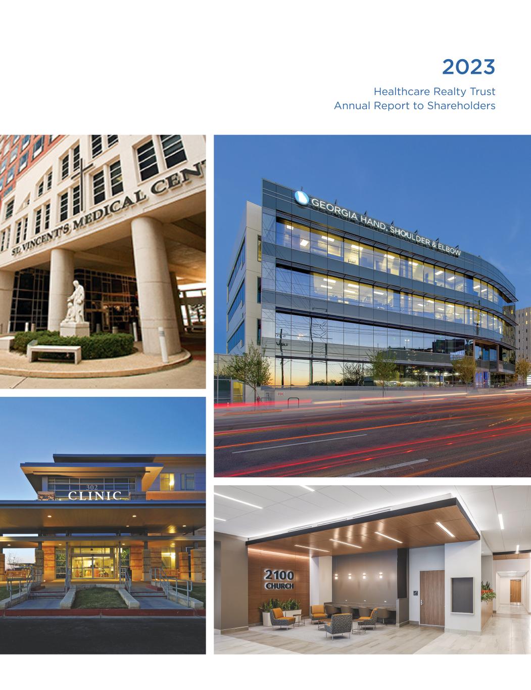 Letter to Shareholders 2023 marked Healthcare Realty’s first full year operating as the largest pure-play medical outpatient building (MOB) REIT in the country following the closing of the transformative merger with HTA in July 2022. Steady progress was made throughout the year amid challenging macroeconomic conditions. Moving into 2023, we achieved our targeted annual synergies of $35 million well ahead of schedule. By the end of January 2023, we completed the final phase of asset sales to fund the $1.1 billion cash portion of the merger consideration. In hindsight, the sub-5% cap rate pricing achieved on these collective transactions was remarkable given the rapidly rising interest rate environment and tight financing conditions. Optimism for moderating inflation and interest rates early in 2023 reversed in the second half of the year. Stubborn inflation well into the summer months postponed the Fed’s expected shift to lower interest rates. Negative sentiment peaked in late October as the 10-year US treasury yield nearly touched 5%, up more than 170 basis points from early in the year. Matching the Fed’s last rate hike in July, key short- term borrowing rates elevated to more than 5% where they have remained since. Market sentiment improved notably in November as inflation softened and the Fed shifted its tone to when, not if, rates would move lower. Despite these difficult circumstances, 2023 was a productive year focused on completing the merger integration and setting the table for Healthcare Realty’s growth potential in the years ahead. We also boosted our original property disposition volume to fund ongoing capital obligations and repay debt. The fundamentals of the MOB sector remained stable in 2023. The aging U.S. population and increasing utilization of physician services bode well for long- term demand for outpatient space. The financial profile of healthcare providers strengthened considerably in 2023. After weathering high labor costs in 2022, providers cost pressures eased. Combined with steadily improving patient volumes, provider profitability improved steadily throughout the year. Higher- than-average inflation over multiple years and rising financing costs caused new construction to rapidly decelerate. Tightening supply of quality outpatient inventory pushed occupancy higher across the sector and increased the potential for higher rent growth. These market fundamentals, combined with Healthcare Realty’s expanded scale and concentrated clusters, provide a strong foundation to capture outsized rent and occupancy gains in the years ahead. OPERATIONAL MOMENTUM Healthcare Realty’s market scale and relationships have begun to produce significant gains in our leasing velocity. In 2023, we achieved a record volume of signed new and renewal leases across the portfolio. Our leasing team executed 817 renewal leases for the year, totaling 4.2 million square feet, and 449 new leases, totaling approximately 1.5 million square feet. We expect the strong pace of new signed leases in 2023 to fuel occupancy gains in 2024. Our leasing team has done an exceptional job of generating momentum by forging strong relationships with our broker and health system partners across the portfolio. We were especially pleased to see leasing volumes accelerate at the legacy HTA multi-tenant assets. These properties experienced declining occupancy before and immediately following the merger. The legacy HTA multi-tenant properties comprise approximately half of the combined multi-tenant portfolio, and just over 61% of our new leases signed during 2023 were at legacy HTA buildings. Importantly, our 2023 Kingsley tenant survey showed meaningful improvements in satisfaction scores across the legacy HTA properties compared to a pre-merger survey in early 2022. As we continue our sharp focus on improving the speed and quality of customer service, we’re confident we can improve retention levels and lift multi-tenant occupancy from the current mid- 80% level to the 90% range in the coming years. Accelerated leasing volumes throughout 2023 produced a gain in multi-tenant occupancy of more than 50 basis points in the fourth quarter. Notably, legacy HTA multi-tenant occupancy improved more than 80 basis points. These gains contributed to fourth quarter NOI growth of 3.3% year-over-year for all multi-tenant properties. NOI growth also benefited from moderating operating expenses which grew 4.3% year-over-year