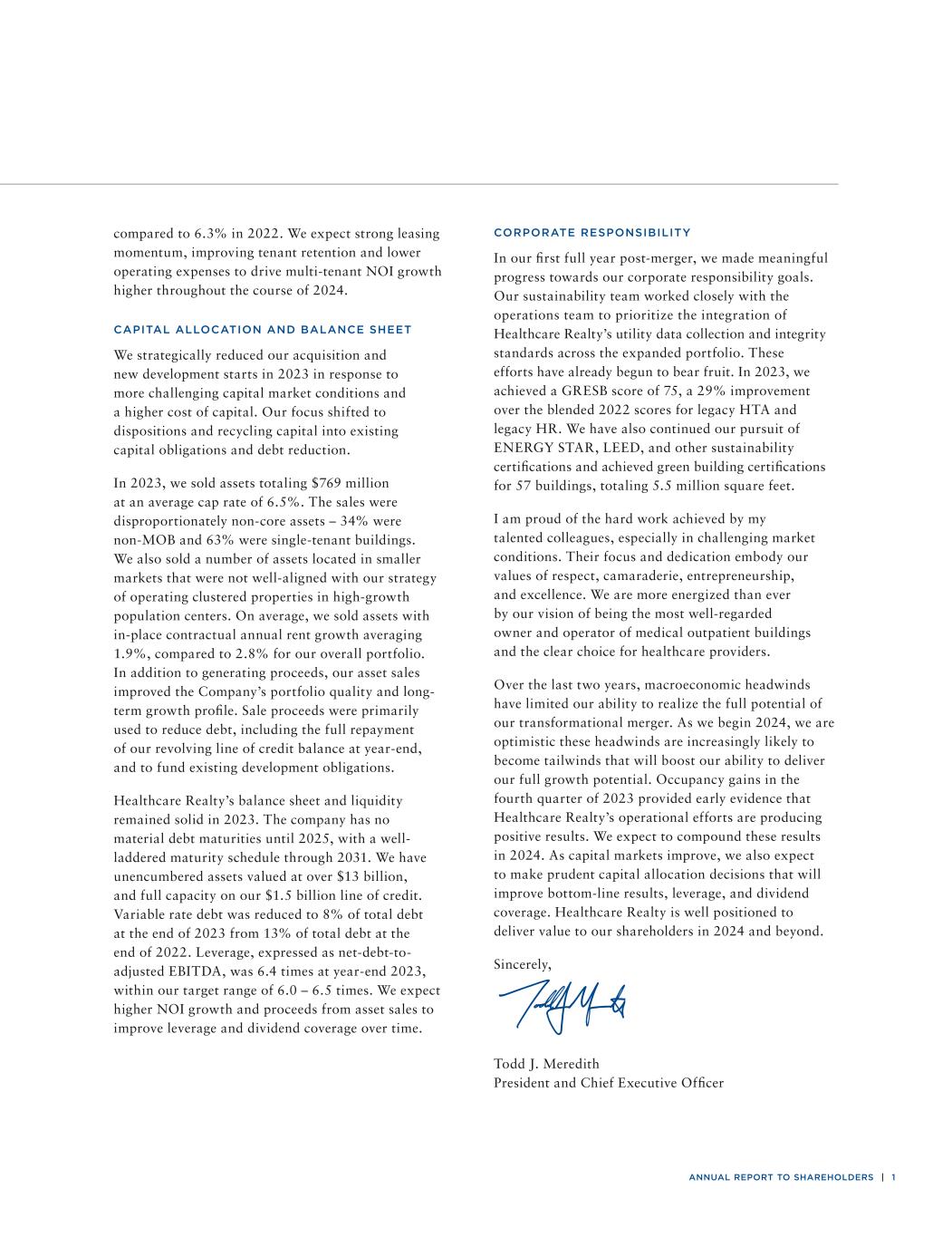 ANNUAL REPORT TO SHAREHOLDERS | 1 compared to 6.3% in 2022. We expect strong leasing momentum, improving tenant retention and lower operating expenses to drive multi-tenant NOI growth higher throughout the course of 2024. CAPITAL ALLOCATION AND BALANCE SHEET We strategically reduced our acquisition and new development starts in 2023 in response to more challenging capital market conditions and a higher cost of capital. Our focus shifted to dispositions and recycling capital into existing capital obligations and debt reduction. In 2023, we sold assets totaling $769 million at an average cap rate of 6.5%. The sales were disproportionately non-core assets – 34% were non-MOB and 63% were single-tenant buildings. We also sold a number of assets located in smaller markets that were not well-aligned with our strategy of operating clustered properties in high-growth population centers. On average, we sold assets with in-place contractual annual rent growth averaging 1.9%, compared to 2.8% for our overall portfolio. In addition to generating proceeds, our asset sales improved the Company’s portfolio quality and long- term growth profile. Sale proceeds were primarily used to reduce debt, including the full repayment of our revolving line of credit balance at year-end, and to fund existing development obligations. Healthcare Realty’s balance sheet and liquidity remained solid in 2023. The company has no material debt maturities until 2025, with a well- laddered maturity schedule through 2031. We have unencumbered assets valued at over $13 billion, and full capacity on our $1.5 billion line of credit. Variable rate debt was reduced to 8% of total debt at the end of 2023 from 13% of total debt at the end of 2022. Leverage, expressed as net-debt-to- adjusted EBITDA, was 6.4 times at year-end 2023, within our target range of 6.0 – 6.5 times. We expect higher NOI growth and proceeds from asset sales to improve leverage and dividend coverage over time. CORPORATE RESPONSIBILITY In our first full year post-merger, we made meaningful progress towards our corporate responsibility goals. Our sustainability team worked closely with the operations team to prioritize the integration of Healthcare Realty’s utility data collection and integrity standards across the expanded portfolio. These efforts have already begun to bear fruit. In 2023, we achieved a GRESB score of 75, a 29% improvement over the blended 2022 scores for legacy HTA and legacy HR. We have also continued our pursuit of ENERGY STAR, LEED, and other sustainability certifications and achieved green building certifications for 57 buildings, totaling 5.5 million square feet. I am proud of the hard work achieved by my talented colleagues, especially in challenging market conditions. Their focus and dedication embody our values of respect, camaraderie, entrepreneurship, and excellence. We are more energized than ever by our vision of being the most well-regarded owner and operator of medical outpatient buildings and the clear choice for healthcare providers. Over the last two years, macroeconomic headwinds have limited our ability to realize the full potential of our transformational merger. As we begin 2024, we are optimistic these headwinds are increasingly likely to become tailwinds that will boost our ability to deliver our full growth potential. Occupancy gains in the fourth quarter of 2023 provided early evidence that Healthcare Realty’s operational efforts are producing positive results. We expect to compound these results in 2024. As capital markets improve, we also expect to make prudent capital allocation decisions that will improve bottom-line results, leverage, and dividend coverage. Healthcare Realty is well positioned to deliver value to our shareholders in 2024 and beyond. Sincerely, Todd J. Meredith President and Chief Executive Officer