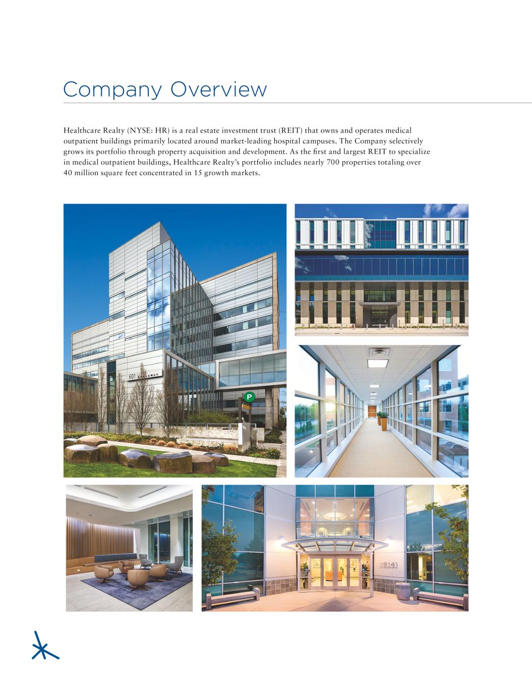 Company Overview Healthcare Realty (NYSE: HR) is a real estate investment trust (REIT) that owns and operates medical outpatient buildings primarily located around market-leading hospital campuses. The Company selectively grows its portfolio through property acquisition and development. As the first and largest REIT to specialize in medical outpatient buildings, Healthcare Realty’s portfolio includes nearly 700 properties totaling over 40 million square feet concentrated in 15 growth markets.