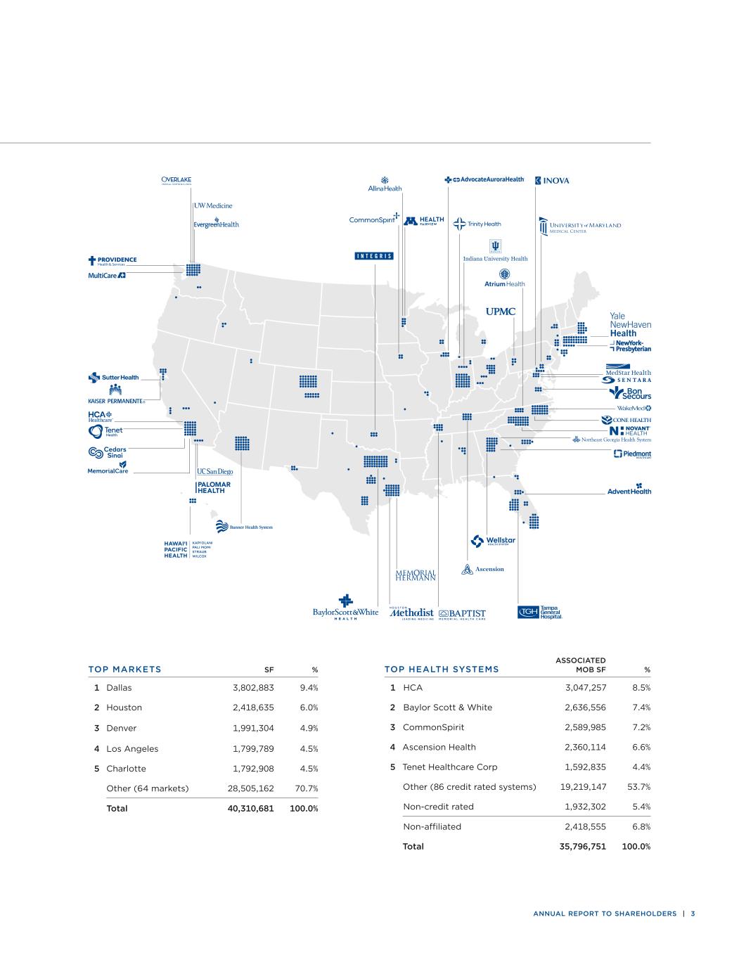 ANNUAL REPORT TO SHAREHOLDERS | 3 TOP HEALTH SYSTEMS ASSOCIATED MOB SF % 1 HCA 3,047,257 8.5% 2 Baylor Scott & White 2,636,556 7.4% 3 CommonSpirit 2,589,985 7.2% 4 Ascension Health 2,360,114 6.6% 5 Tenet Healthcare Corp 1,592,835 4.4% Other (86 credit rated systems) 19,219,147 53.7% Non-credit rated 1,932,302 5.4% Non-affiliated 2,418,555 6.8% Total 35,796,751 100.0% TOP MARKETS SF % 1 Dallas 3,802,883 9.4% 2 Houston 2,418,635 6.0% 3 Denver 1,991,304 4.9% 4 Los Angeles 1,799,789 4.5% 5 Charlotte 1,792,908 4.5% Other (64 markets) 28,505,162 70.7% Total 40,310,681 100.0%