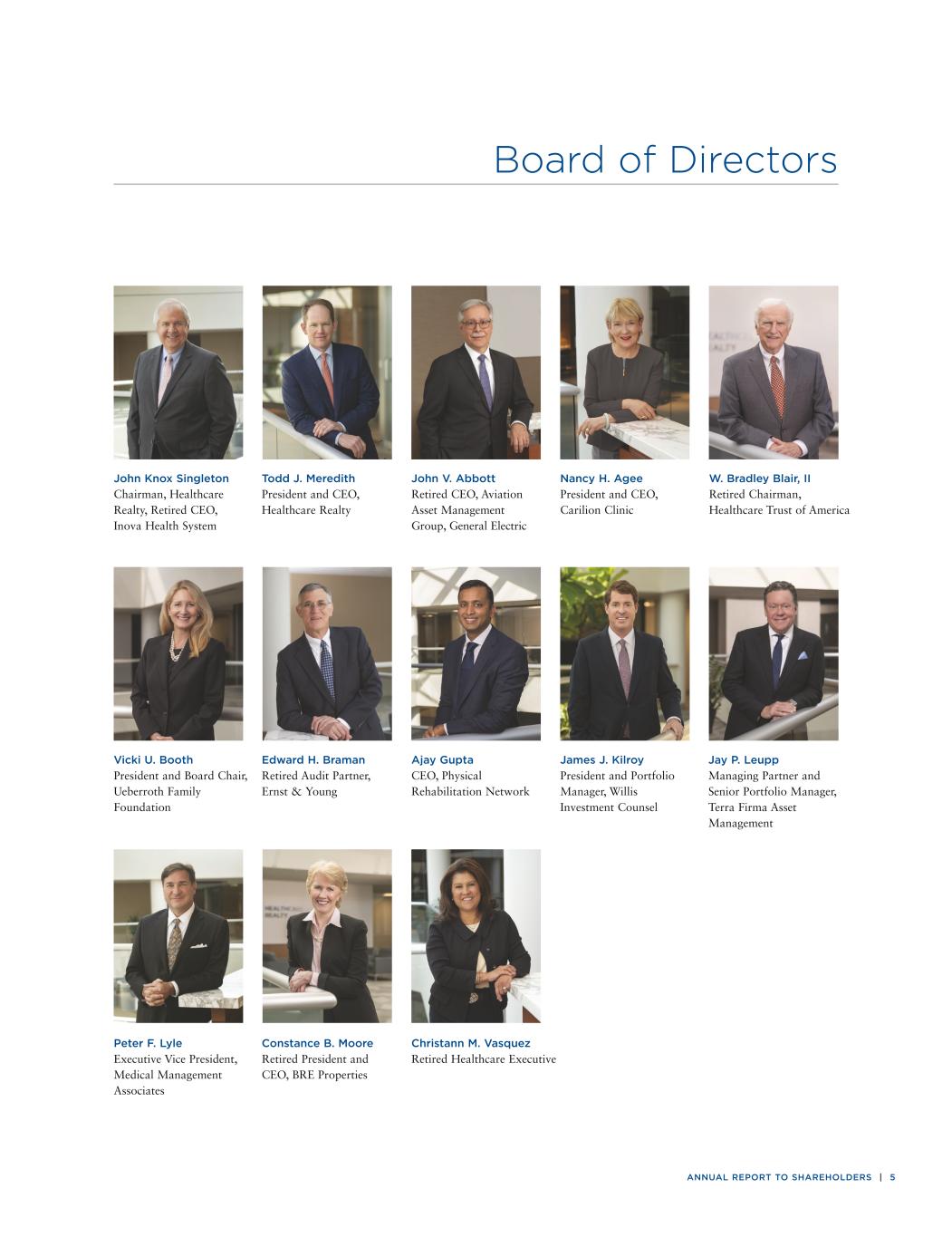 ANNUAL REPORT TO SHAREHOLDERS | 5 John Knox Singleton Chairman, Healthcare Realty, Retired CEO, Inova Health System Todd J. Meredith President and CEO, Healthcare Realty John V. Abbott Retired CEO, Aviation Asset Management Group, General Electric Nancy H. Agee President and CEO, Carilion Clinic W. Bradley Blair, II Retired Chairman, Healthcare Trust of America Edward H. Braman Retired Audit Partner, Ernst & Young Constance B. Moore Retired President and CEO, BRE Properties Ajay Gupta CEO, Physical Rehabilitation Network Christann M. Vasquez Retired Healthcare Executive Vicki U. Booth President and Board Chair, Ueberroth Family Foundation Peter F. Lyle Executive Vice President, Medical Management Associates James J. Kilroy President and Portfolio Manager, Willis Investment Counsel Jay P. Leupp Managing Partner and Senior Portfolio Manager, Terra Firma Asset Management Board of Directors