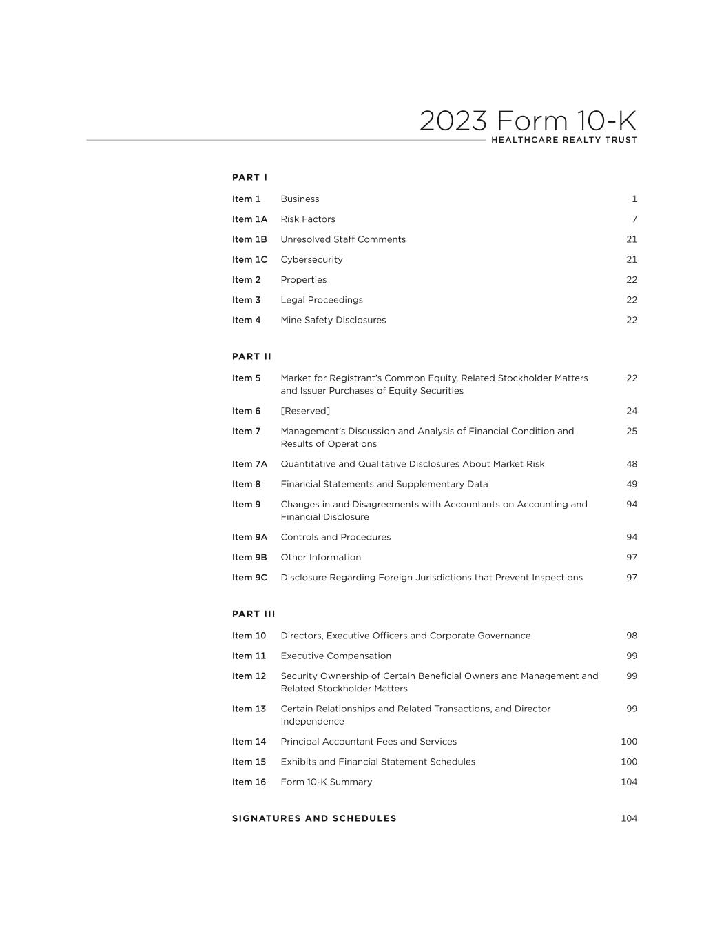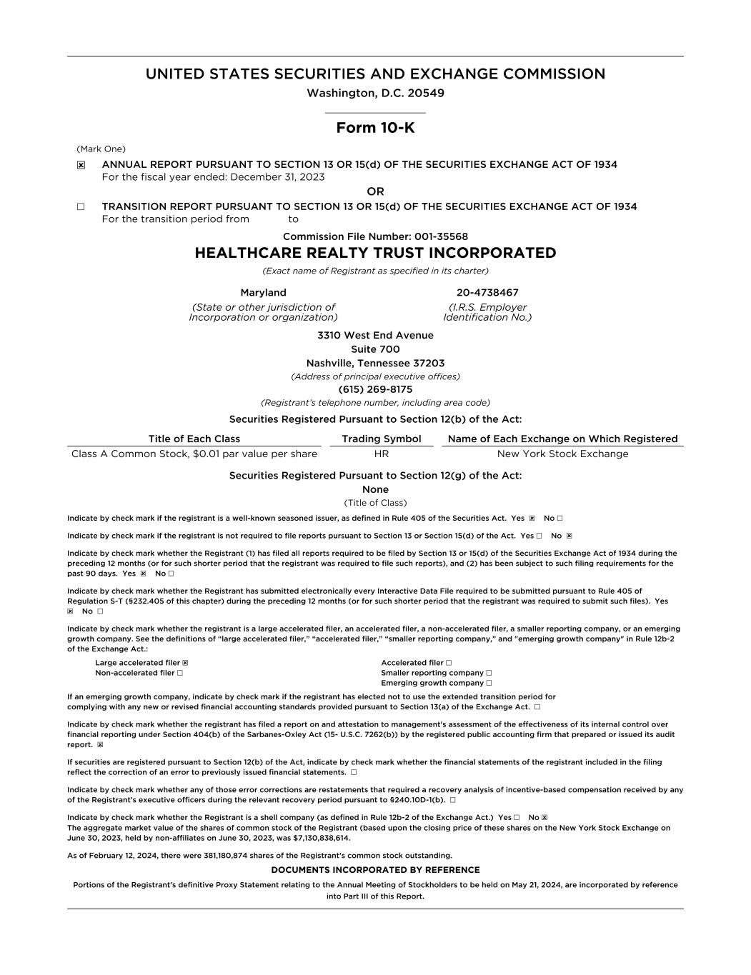 UNITED STATES SECURITIES AND EXCHANGE COMMISSION Washington, D.C. 20549 _______________ Form 10-K (Mark One) ☒ ANNUAL REPORT PURSUANT TO SECTION 13 OR 15(d) OF THE SECURITIES EXCHANGE ACT OF 1934 For the fiscal year ended: December 31, 2023 OR ☐ TRANSITION REPORT PURSUANT TO SECTION 13 OR 15(d) OF THE SECURITIES EXCHANGE ACT OF 1934 For the transition period from to Commission File Number: 001-35568 HEALTHCARE REALTY TRUST INCORPORATED (Exact name of Registrant as specified in its charter) Maryland 20-4738467 (State or other jurisdiction of Incorporation or organization) (I.R.S. Employer Identification No.) 3310 West End Avenue Suite 700 Nashville, Tennessee 37203 (Address of principal executive offices) (615) 269-8175 (Registrant’s telephone number, including area code) Securities Registered Pursuant to Section 12(b) of the Act: Title of Each Class Trading Symbol Name of Each Exchange on Which Registered Class A Common Stock, $0.01 par value per share HR New York Stock Exchange Securities Registered Pursuant to Section 12(g) of the Act: None (Title of Class) Indicate by check mark if the registrant is a well-known seasoned issuer, as defined in Rule 405 of the Securities Act. Yes ☒ No ☐ Indicate by check mark if the registrant is not required to file reports pursuant to Section 13 or Section 15(d) of the Act. Yes ☐ No ☒ Indicate by check mark whether the Registrant (1) has filed all reports required to be filed by Section 13 or 15(d) of the Securities Exchange Act of 1934 during the preceding 12 months (or for such shorter period that the registrant was required to file such reports), and (2) has been subject to such filing requirements for the past 90 days. Yes ☒ No ☐ Indicate by check mark whether the Registrant has submitted electronically every Interactive Data File required to be submitted pursuant to Rule 405 of Regulation S-T (§232.405 of this chapter) during the preceding 12 months (or for such shorter period that the registrant was required to submit such files). Yes ☒ No ☐ Indicate by check mark whether the registrant is a large accelerated filer, an accelerated filer, a non-accelerated filer, a smaller reporting company, or an emerging growth company. See the definitions of “large accelerated filer,” “accelerated filer,” “smaller reporting company,” and "emerging growth company" in Rule 12b-2 of the Exchange Act.: Large accelerated filer ☒ Accelerated filer ☐ Non-accelerated filer ☐ Smaller reporting company ☐ Emerging growth company ☐ If an emerging growth company, indicate by check mark if the registrant has elected not to use the extended transition period for complying with any new or revised financial accounting standards provided pursuant to Section 13(a) of the Exchange Act. ☐ Indicate by check mark whether the registrant has filed a report on and attestation to management's assessment of the effectiveness of its internal control over financial reporting under Section 404(b) of the Sarbanes-Oxley Act (15- U.S.C. 7262(b)) by the registered public accounting firm that prepared or issued its audit report. ☒ If securities are registered pursuant to Section 12(b) of the Act, indicate by check mark whether the financial statements of the registrant included in the filing reflect the correction of an error to previously issued financial statements. ☐ Indicate by check mark whether any of those error corrections are restatements that required a recovery analysis of incentive-based compensation received by any of the Registrant’s executive officers during the relevant recovery period pursuant to §240.10D-1(b). ☐ Indicate by check mark whether the Registrant is a shell company (as defined in Rule 12b-2 of the Exchange Act.) Yes ☐ No ☒ The aggregate market value of the shares of common stock of the Registrant (based upon the closing price of these shares on the New York Stock Exchange on June 30, 2023, held by non-affiliates on June 30, 2023, was $7,130,838,614. As of February 12, 2024, there were 381,180,874 shares of the Registrant’s common stock outstanding. DOCUMENTS INCORPORATED BY REFERENCE Portions of the Registrant’s definitive Proxy Statement relating to the Annual Meeting of Stockholders to be held on May 21, 2024, are incorporated by reference into Part III of this Report.