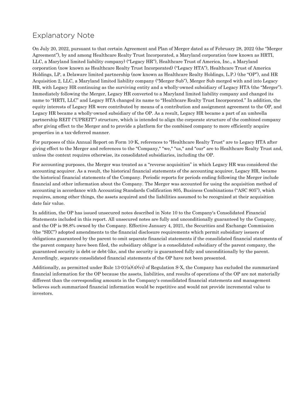 Explanatory Note On July 20, 2022, pursuant to that certain Agreement and Plan of Merger dated as of February 28, 2022 (the “Merger Agreement”), by and among Healthcare Realty Trust Incorporated, a Maryland corporation (now known as HRTI, LLC, a Maryland limited liability company) (“Legacy HR”), Healthcare Trust of America, Inc., a Maryland corporation (now known as Healthcare Realty Trust Incorporated) (“Legacy HTA”), Healthcare Trust of America Holdings, LP, a Delaware limited partnership (now known as Healthcare Realty Holdings, L.P.) (the “OP”), and HR Acquisition 2, LLC, a Maryland limited liability company (“Merger Sub”), Merger Sub merged with and into Legacy HR, with Legacy HR continuing as the surviving entity and a wholly-owned subsidiary of Legacy HTA (the “Merger”). Immediately following the Merger, Legacy HR converted to a Maryland limited liability company and changed its name to “HRTI, LLC” and Legacy HTA changed its name to “Healthcare Realty Trust Incorporated.” In addition, the equity interests of Legacy HR were contributed by means of a contribution and assignment agreement to the OP, and Legacy HR became a wholly-owned subsidiary of the OP. As a result, Legacy HR became a part of an umbrella partnership REIT (“UPREIT”) structure, which is intended to align the corporate structure of the combined company after giving effect to the Merger and to provide a platform for the combined company to more efficiently acquire properties in a tax-deferred manner. For purposes of this Annual Report on Form 10-K, references to "Healthcare Realty Trust" are to Legacy HTA after giving effect to the Merger and references to the "Company," "we," "us," and "our" are to Healthcare Realty Trust and, unless the context requires otherwise, its consolidated subsidiaries, including the OP. For accounting purposes, the Merger was treated as a “reverse acquisition” in which Legacy HR was considered the accounting acquirer. As a result, the historical financial statements of the accounting acquirer, Legacy HR, became the historical financial statements of the Company. Periodic reports for periods ending following the Merger include financial and other information about the Company. The Merger was accounted for using the acquisition method of accounting in accordance with Accounting Standards Codification 805, Business Combinations (“ASC 805”), which requires, among other things, the assets acquired and the liabilities assumed to be recognized at their acquisition date fair value. In addition, the OP has issued unsecured notes described in Note 10 to the Company's Consolidated Financial Statements included in this report. All unsecured notes are fully and unconditionally guaranteed by the Company, and the OP is 98.8% owned by the Company. Effective January 4, 2021, the Securities and Exchange Commission (the “SEC”) adopted amendments to the financial disclosure requirements which permit subsidiary issuers of obligations guaranteed by the parent to omit separate financial statements if the consolidated financial statements of the parent company have been filed, the subsidiary obligor is a consolidated subsidiary of the parent company, the guaranteed security is debt or debt-like, and the security is guaranteed fully and unconditionally by the parent. Accordingly, separate consolidated financial statements of the OP have not been presented. Additionally, as permitted under Rule 13-01(a)(4)(vi) of Regulation S-X, the Company has excluded the summarized financial information for the OP because the assets, liabilities, and results of operations of the OP are not materially different than the corresponding amounts in the Company's consolidated financial statements and management believes such summarized financial information would be repetitive and would not provide incremental value to investors.