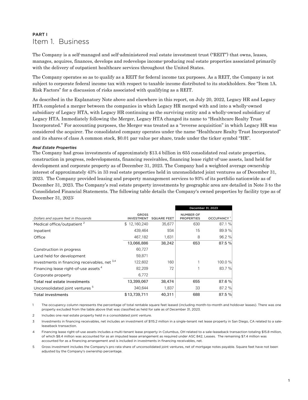 PART I Item 1. Business The Company is a self-managed and self-administered real estate investment trust (“REIT”) that owns, leases, manages, acquires, finances, develops and redevelops income-producing real estate properties associated primarily with the delivery of outpatient healthcare services throughout the United States. The Company operates so as to qualify as a REIT for federal income tax purposes. As a REIT, the Company is not subject to corporate federal income tax with respect to taxable income distributed to its stockholders. See “Item 1A. Risk Factors” for a discussion of risks associated with qualifying as a REIT. As described in the Explanatory Note above and elsewhere in this report, on July 20, 2022, Legacy HR and Legacy HTA completed a merger between the companies in which Legacy HR merged with and into a wholly-owned subsidiary of Legacy HTA, with Legacy HR continuing as the surviving entity and a wholly-owned subsidiary of Legacy HTA. Immediately following the Merger, Legacy HTA changed its name to “Healthcare Realty Trust Incorporated.” For accounting purposes, the Merger was treated as a “reverse acquisition” in which Legacy HR was considered the acquirer. The consolidated company operates under the name “Healthcare Realty Trust Incorporated” and its shares of class A common stock, $0.01 par value per share, trade under the ticker symbol “HR”. Real Estate Properties The Company had gross investments of approximately $13.4 billion in 655 consolidated real estate properties, construction in progress, redevelopments, financing receivables, financing lease right-of-use assets, land held for development and corporate property as of December 31, 2023. The Company had a weighted average ownership interest of approximately 43% in 33 real estate properties held in unconsolidated joint ventures as of December 31, 2023. The Company provided leasing and property management services to 93% of its portfolio nationwide as of December 31, 2023. The Company’s real estate property investments by geographic area are detailed in Note 3 to the Consolidated Financial Statements. The following table details the Company's owned properties by facility type as of December 31, 2023: December 31, 2023 Dollars and square feet in thousands GROSS INVESTMENT SQUARE FEET NUMBER OF PROPERTIES OCCUPANCY 1 Medical office/outpatient 2 $ 12,160,240 35,677 630 87.1 % Inpatient 439,464 934 15 89.9 % Office 467,182 1,631 8 96.2 % 13,066,886 38,242 653 87.5 % Construction in progress 60,727 Land held for development 59,871 Investments in financing receivables, net 3,4 122,602 160 1 100.0 % Financing lease right-of-use assets 4 82,209 72 1 83.7 % Corporate property 6,772 Total real estate investments 13,399,067 38,474 655 87.6 % Unconsolidated joint ventures 5 340,644 1,837 33 87.2 % Total investments $ 13,739,711 40,311 688 87.5 % 1 The occupancy column represents the percentage of total rentable square feet leased (including month-to-month and holdover leases). There was one property excluded from the table above that was classified as held for sale as of December 31, 2023. 2 Includes one real estate property held in a consolidated joint venture. 3 Investments in financing receivables, net includes an investment of $115.2 million in a single-tenant net lease property in San Diego, CA related to a sale- leaseback transaction. 4 Financing lease right-of-use assets includes a multi-tenant lease property in Columbus, OH related to a sale-leaseback transaction totaling $15.8 million, of which $8.4 million was accounted for as an imputed lease arrangement as required under ASC 842, Leases. The remaining $7.4 million was accounted for as a financing arrangement and is included in investments in financing receivables, net. 5 Gross investment includes the Company's pro rata share of unconsolidated joint ventures, net of mortgage notes payable. Square feet have not been adjusted by the Company's ownership percentage. 1