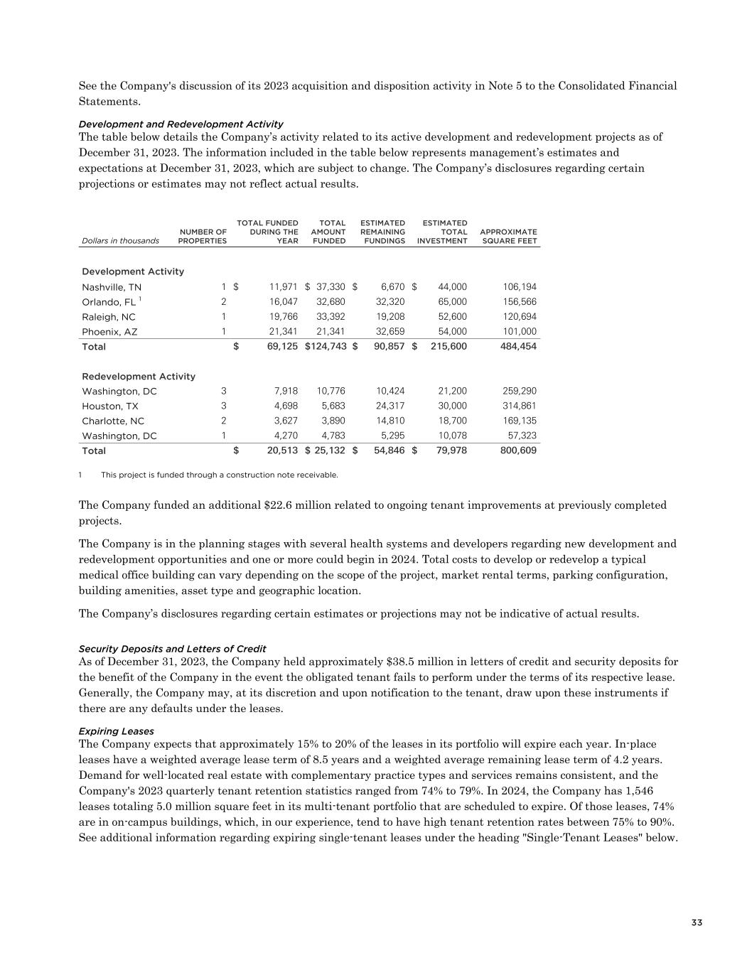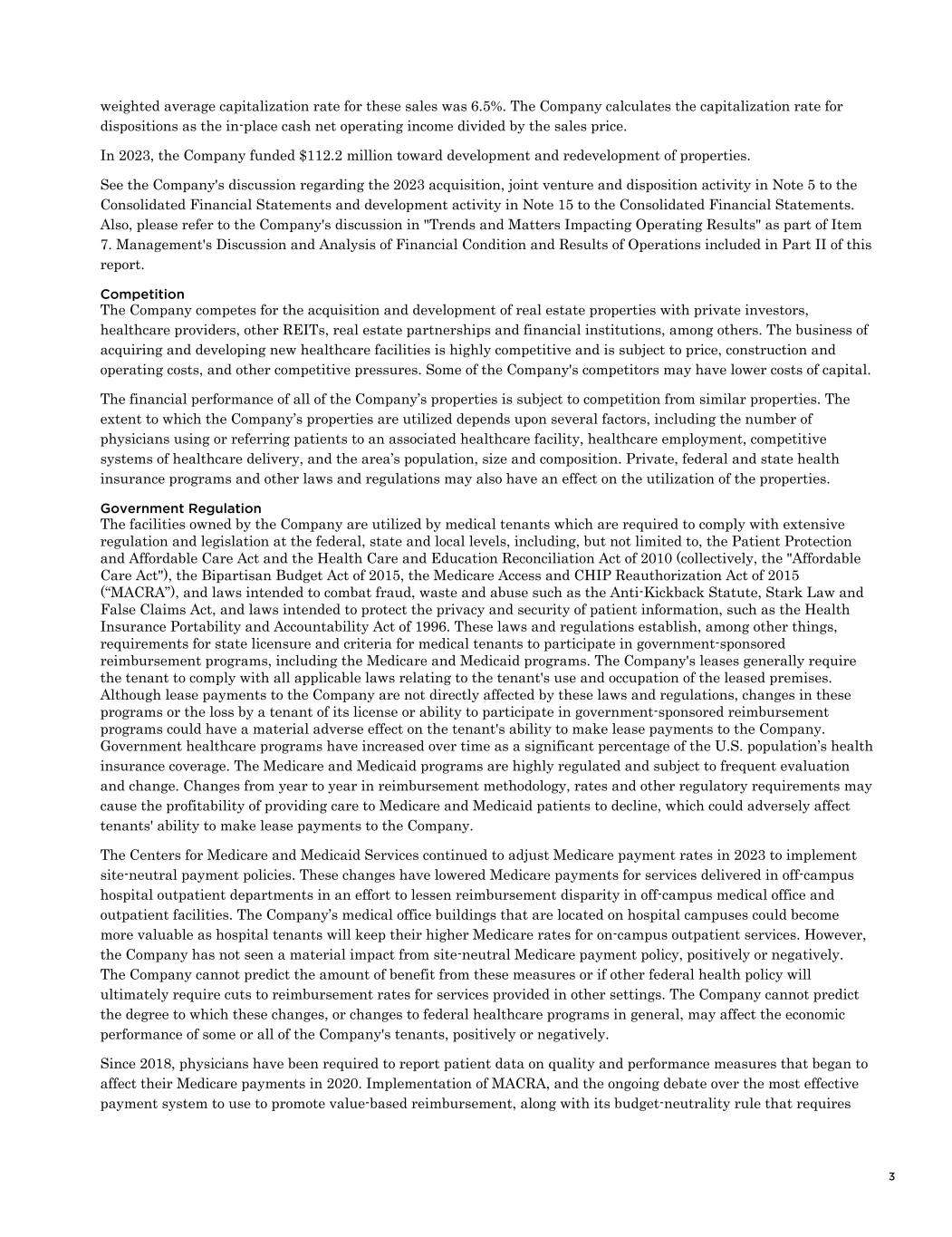 Financial Concentrations The Company’s real estate portfolio is leased to a diverse tenant base. For the year ended December 31, 2023, the Company did not have any tenants that accounted for 10% or more of the Company’s consolidated revenues. See Note 3 to the Consolidated Financial Statements for additional information regarding the Company's gross investments by geographic market. Expiring Leases As of December 31, 2023, the weighted average remaining years to expiration pursuant to the Company’s leases was approximately 4.2 years, with expirations through 2052. The table below details the Company’s lease expirations as of December 31, 2023, excluding the Company's unconsolidated joint ventures, financing receivables, assets held for sale and right-of-use assets. EXPIRATION YEAR NUMBER OF LEASES LEASED SQUARE FEET PERCENTAGE OF LEASED SQUARE FEET 2024 (1) 1,610 6,081,500 18.2 % 2025 1,096 4,567,388 13.6 % 2026 1,061 4,086,806 12.2 % 2027 856 4,216,127 12.6 % 2028 835 3,732,888 11.1 % 2029 402 2,051,552 6.1 % 2030 367 2,531,991 7.6 % 2031 252 1,198,077 3.6 % 2032 295 2,139,548 6.4 % 2033 203 1,123,683 3.4 % Thereafter 203 1,750,005 5.2 % 7,180 33,479,565 100.0 % 1 Includes 189 leases totaling 397,188 square feet that expired prior to December 31, 2023, and were on month-to-month terms. See "Trends and Matters Impacting Operating Results" as part of Management's Discussion and Analysis of Financial Condition and Results of Operations included in Part II, Item 7 of this report for additional information regarding the Company's leases and leasing efforts. Liquidity The Company believes that its liquidity and sources of capital are adequate to satisfy its cash requirements. The Company expects to meet its liquidity needs through cash on hand, cash flows from operations, property dispositions, equity and debt issuances in the public or private markets and borrowings under commercial credit facilities. Business Strategy The Company owns and operates properties that facilitate the delivery of healthcare services in primarily outpatient settings. To execute its strategy, the Company engages in a broad spectrum of integrated services including leasing, management, acquisition, financing, development and redevelopment of such properties. The Company seeks to generate stable, growing income and lower the long-term risk profile of its portfolio of properties by focusing on facilities primarily located on or near the campuses of acute care hospitals associated with leading health systems. The Company seeks to reduce financial and operational risk by owning properties in high-growth markets with a broad tenant mix that includes over 30 physician specialties, as well as surgery, imaging, cancer, and diagnostic centers. 2023 Investment Activity In 2023, the Company acquired two medical office buildings. The total purchase price of the acquisitions was $43.0 million and the weighted average capitalization rate for these investments was 6.5%. The Company disposed of 39 properties in 2023 for sales prices totaling $787.0 million, including a regional corporate office and one property contributed into a joint venture in which the Company maintains a non-controlling interest. These transactions yielded net cash proceeds of $687.6 million, net of $36.9 million of closing costs and related adjustments, $58.7 million in Company financed notes and $3.8 million of retained joint venture interests. The weighted average capitalization rate for these sales was 6.5%. The Company calculates the capitalization rate for dispositions as the in-place cash net operating income divided by the sales price. In 2023, the Company funded $112.2 million toward development and redevelopment of properties. See the Company's discussion regarding the 2023 acquisition, joint venture and disposition activity in Note 5 to the Consolidated Financial Statements and development activity in Note 15 to the Consolidated Financial Statements. Also, please refer to the Company's discussion in "Trends and Matters Impacting Operating Results" as part of Item 7. Management's Discussion and Analysis of Financial Condition and Results of Operations included in Part II of this report. Competition The Company competes for the acquisition and development of real estate properties with private investors, healthcare providers, other REITs, real estate partnerships and financial institutions, among others. The business of acquiring and developing new healthcare facilities is highly competitive and is subject to price, construction and operating costs, and other competitive pressures. Some of the Company's competitors may have lower costs of capital. The financial performance of all of the Company’s properties is subject to competition from similar properties. The extent to which the Company’s properties are utilized depends upon several factors, including the number of physicians using or referring patients to an associated healthcare facility, healthcare employment, competitive systems of healthcare delivery, and the area’s population, size and composition. Private, federal and state health insurance programs and other laws and regulations may also have an effect on the utilization of the properties. Government Regulation The facilities owned by the Company are utilized by medical tenants which are required to comply with extensive regulation and legislation at the federal, state and local levels, including, but not limited to, the Patient Protection and Affordable Care Act and the Health Care and Education Reconciliation Act of 2010 (collectively, the "Affordable Care Act"), the Bipartisan Budget Act of 2015, the Medicare Access and CHIP Reauthorization Act of 2015 (“MACRA”), and laws intended to combat fraud, waste and abuse such as the Anti-Kickback Statute, Stark Law and False Claims Act, and laws intended to protect the privacy and security of patient information, such as the Health Insurance Portability and Accountability Act of 