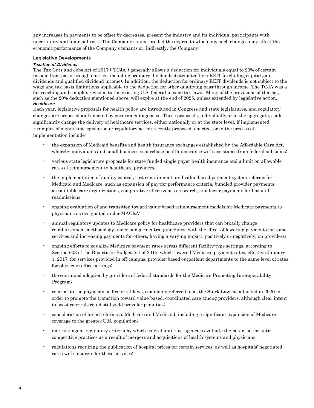 any increases in payments to be offset by decreases, present the industry and its individual participants with uncertainty and financial risk. The Company cannot predict the degree to which any such changes may affect the economic performance of the Company's tenants or, indirectly, the Company. Legislative Developments Taxation of Dividends The Tax Cuts and Jobs Act of 2017 (“TCJA”) generally allows a deduction for individuals equal to 20% of certain income from pass-through entities, including ordinary dividends distributed by a REIT (excluding capital gain dividends and qualified dividend income). In addition, the deduction for ordinary REIT dividends is not subject to the wage and tax basis limitations applicable to the deduction for other qualifying pass-through income. The TCJA was a far-reaching and complex revision to the existing U.S. federal income tax laws. Many of the provisions of this act, such as the 20% deduction mentioned above, will expire at the end of 2025, unless extended by legislative action. Healthcare Each year, legislative proposals for health policy are introduced in Congress and state legislatures, and regulatory changes are proposed and enacted by government agencies. These proposals, individually or in the aggregate, could significantly change the delivery of healthcare services, either nationally or at the state level, if implemented. Examples of significant legislation or regulatory action recently proposed, enacted, or in the process of implementation include: • the expansion of Medicaid benefits and health insurance exchanges established by the Affordable Care Act, whereby individuals and small businesses purchase health insurance with assistance from federal subsidies; • various state legislature proposals for state-funded single-payer health insurance and a limit on allowable rates of reimbursement to healthcare providers; • the implementation of quality control, cost containment, and value-based payment system reforms for Medicaid and Medicare, such as expansion of pay-for-performance criteria, bundled provider payments, accountable care organizations, comparative effectiveness research, and lower payments for hospital readmissions; • ongoing evaluation of and transition toward value-based reimbursement models for Medicare payments to physicians as designated under MACRA; • annual regulatory updates to Medicare policy for healthcare providers that can broadly change reimbursement methodology under budget-neutral guidelines, with the effect of lowering payments for some services and increasing payments for others, having a varying impact, positively or negatively, on providers; • ongoing efforts to equalize Medicare payment rates across different facility-type settings, according to Section 603 of the Bipartisan Budget Act of 2015, which lowered Medicare payment rates, effective January 1, 2017, for services provided in off-campus, provider-based outpatient departments to the same level of rates for physician office settings; • the continued adoption by providers of federal standards for the Medicare Promoting Interoperability Program; • reforms to the physician self-referral laws, commonly referred to as the Stark Law, as adjusted in 2020 in order to promote the transition toward value-based, coordinated care among providers, although clear intent to boost referrals could still yield provider penalties; • consideration of broad reforms to Medicare and Medicaid, including a significant expansion of Medicare coverage to the greater U.S. population; • more stringent regulatory criteria by which federal antitrust agencies evaluate the potential for anti- competitive practices as a result of mergers and acquisitions of health systems and physicians; • regulations requiring the publication of hospital prices for certain services, as well as hospitals’ negotiated rates with insurers for these services; 4