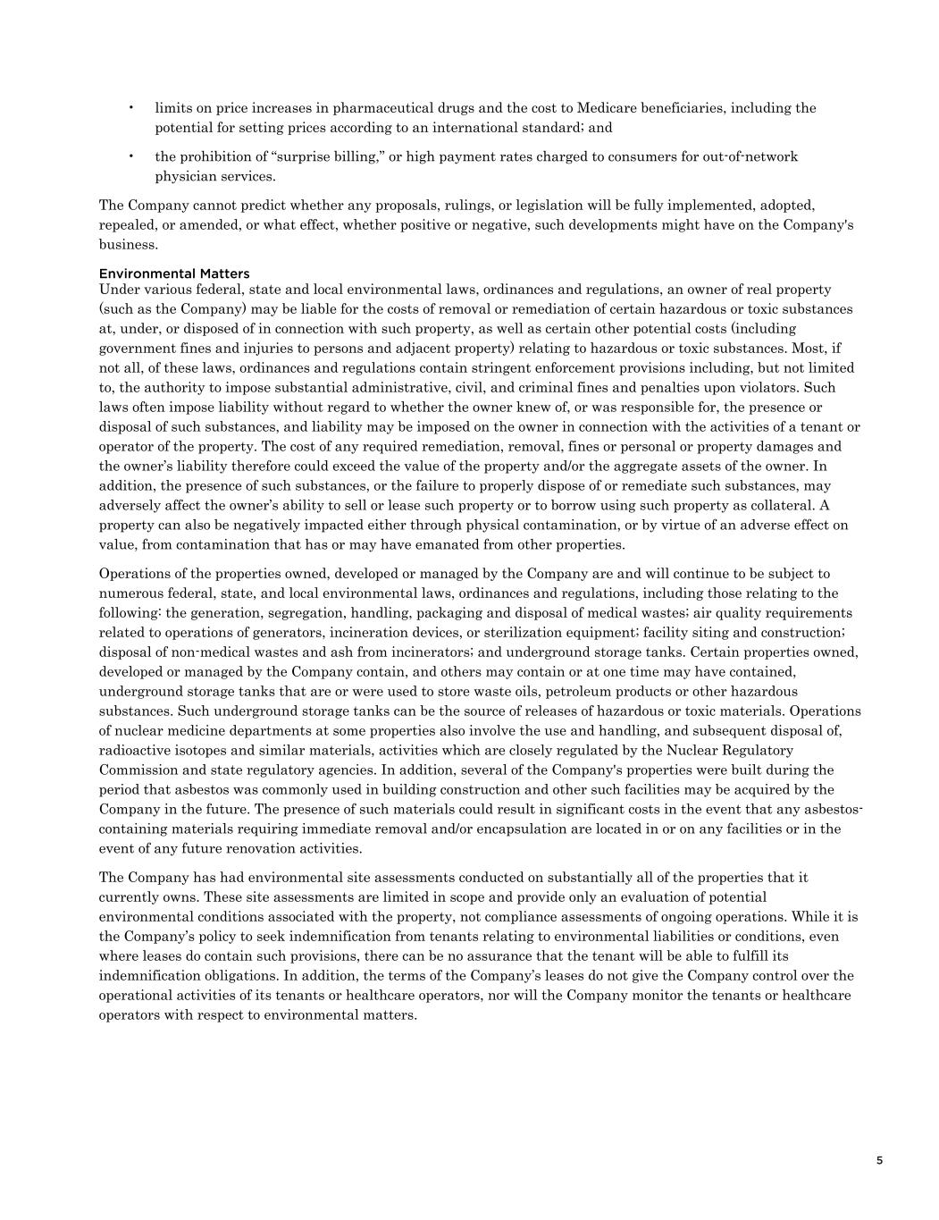 any increases in payments to be offset by decreases, present the industry and its individual participants with uncertainty and financial risk. The Company cannot predict the degree to which any such changes may affect the economic performance of the Company's tenants or, indirectly, the Company. Legislative Developments Taxation of Dividends The Tax Cuts and Jobs Act of 2017 (“TCJA”) generally allows a deduction for individuals equal to 20% of certain income from pass-through entities, including ordinary dividends distributed by a REIT (excluding capital gain dividends and qualified dividend income). In addition, the deduction for ordinary REIT dividends is not subject to the wage and tax basis limitations applicable to the deduction for other qualifying pass-through income. The TCJA was a far-reaching and complex revision to the existing U.S. federal income tax laws. Many of the provisions of this act, such as the 20% deduction mentioned above, will expire at the end of 2025, unless extended by legislative action. Healthcare Each year, legislative proposals for health policy are introduced in Congress and state legislatures, and regulatory changes are proposed and enacted by government agencies. These proposals, individually or in the aggregate, could significantly change the delivery of healthcare services, either nationally or at the state level, if implemented. Examples of significant legislation or regulatory action recently proposed, enacted, or in the process of implementation include: • the expansion of Medicaid benefits and health insurance exchanges established by the Affordable Care Act, whereby individuals and small businesses purchase health insurance with assistance from federal subsidies; • various state legislature proposals for state-funded single-payer health insurance and a limit on allowable rates of reimbursement to healthcare providers; • the implementation of quality control, cost containment, and value-based payment system reforms for Medicaid and Medicare, such as expansion of pay-for-performance criteria, bundled provider payments, accountable care organizations, comparative effectiveness research, and lower payments for hospital readmissions; • ongoing evaluation of and transition toward value-based reimbursement models for Medicare payments to physicians as designated under MACRA; • annual regulatory updates to Medicare policy for healthcare providers that can broadly change reimbursement methodology under budget-neutral guidelines, with the effect of lowering payments for some services and increasing payments for others, having a varying impact, positively or negatively, on providers; • ongoing efforts to equalize Medicare payment rates across different facility-type settings, according to Section 603 of the Bipartisan Budget Act of 2015, which lowered Medicare payment rates, effective January 1, 2017, for services provided in off-campus, provider-based outpatient departments to the same level of rates for physician office settings; • the continued adoption by providers of federal standards for the Medicare Promoting Interoperability Program; • reforms to the physician self-referral laws, commonly referred to as the Stark Law, as adjusted in 2020 in order to promote the transition toward value-based, coordinated care among providers, although clear intent to boost referrals could still yield provider penalties; • consideration of broad reforms to Medicare and Medicaid, including a significant expansion of Medicare coverage to the greater U.S. population; • more stringent regulatory criteria by which federal antitrust agencies evaluate the potential for anti- competitive practices as a result of mergers and acquisitions of health systems and physicians; • regulations requiring the publication of hospital prices for certain services, as well as hospitals’ negotiated rates with insurers for these services; • limits on price increases in pharmaceutical drugs and the cost to Medicare beneficiaries, including the potential for setting prices according to an international standard; and • the prohibition of “surprise billing,” or high payment rates charged to consumers for out-of-network physician services. The Company cannot predict whether any proposals, rulings, or legislation will be fully implemented, adopted, repealed, or amended, or what effect, whether positive or negative, such developments might have on the Company's business. Environmental Matters Under various federal, state and local environmental laws, ordinances and regulations, an owner of real property (such as the Company) may be liable for the costs of removal or remediation of certain hazardous or toxic substances at, under, or disposed of in connection with such property, as well as certain other potential costs (including government fines and injuries to persons and adjacent property) relating to hazardous or toxic substances. Most, if not all, of these laws, ordinances and regulations contain stringent enforcement provisions including, but not limited to, the authority to impose substantial administrative, civil, and criminal fines and penalties upon violators. Such laws often impose liability without regard to whether the owner knew of, or was responsible for, the presence or disposal of such substances, and liability may be imposed on the owner in connection with the activities of a tenant or operator of the property. The cost of any required remediation, removal, fines or personal or property damages and the owner’s liability therefore could exceed the value of the property and/or the aggregate assets of the owner. In addition, the presence of such substances, or the failure to properly dispose of or remediate such substances, may adversely affect the owner’s ability to sell or lease such property or to borrow using such property as collateral. A property can also be negatively impacted either through physical contamination, or by virtue of an adverse 
