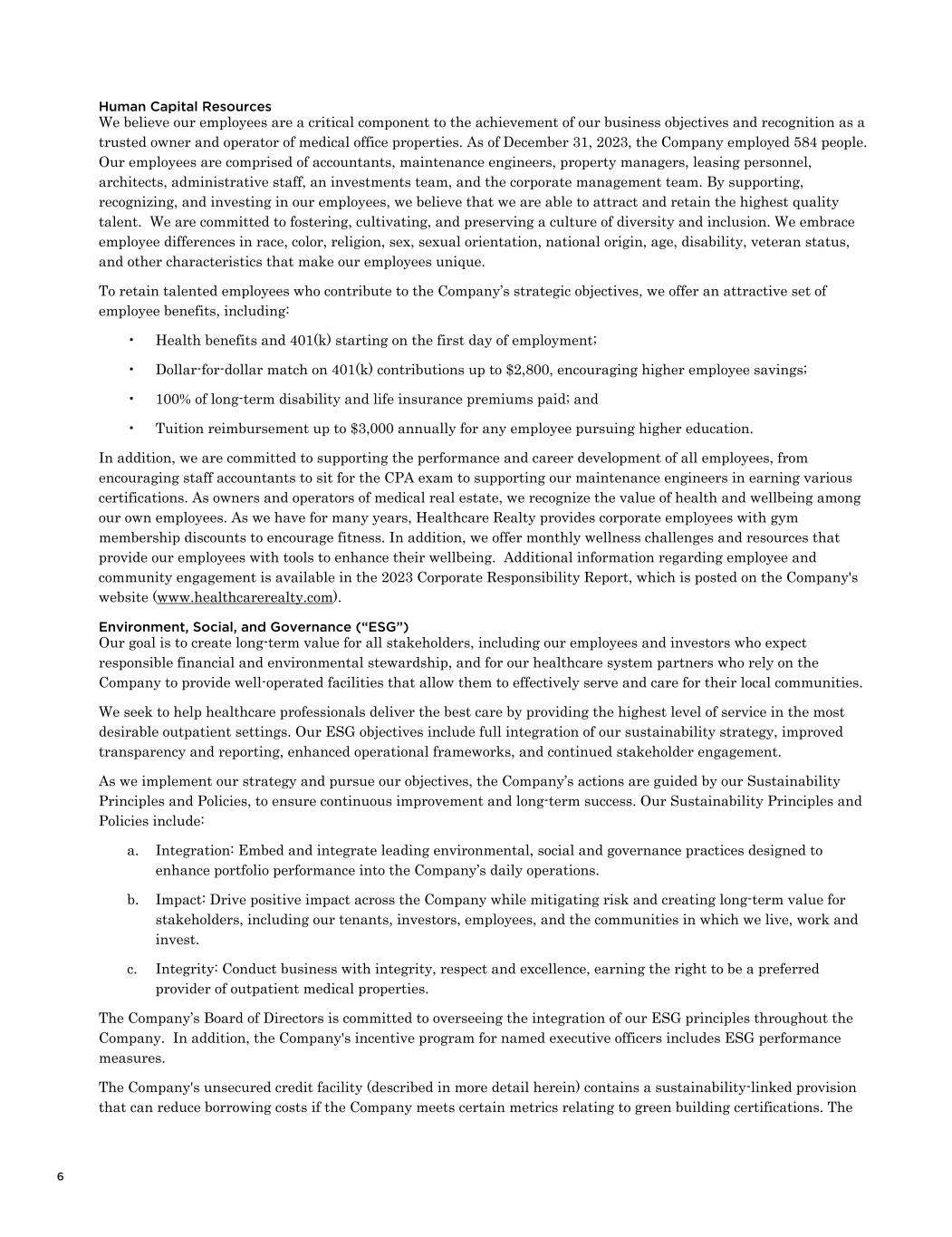 Human Capital Resources We believe our employees are a critical component to the achievement of our business objectives and recognition as a trusted owner and operator of medical office properties. As of December 31, 2023, the Company employed 584 people. Our employees are comprised of accountants, maintenance engineers, property managers, leasing personnel, architects, administrative staff, an investments team, and the corporate management team. By supporting, recognizing, and investing in our employees, we believe that we are able to attract and retain the highest quality talent. We are committed to fostering, cultivating, and preserving a culture of diversity and inclusion. We embrace employee differences in race, color, religion, sex, sexual orientation, national origin, age, disability, veteran status, and other characteristics that make our employees unique. To retain talented employees who contribute to the Company’s strategic objectives, we offer an attractive set of employee benefits, including: • Health benefits and 401(k) starting on the first day of employment; • Dollar-for-dollar match on 401(k) contributions up to $2,800, encouraging higher employee savings; • 100% of long-term disability and life insurance premiums paid; and • Tuition reimbursement up to $3,000 annually for any employee pursuing higher education. In addition, we are committed to supporting the performance and career development of all employees, from encouraging staff accountants to sit for the CPA exam to supporting our maintenance engineers in earning various certifications. As owners and operators of medical real estate, we recognize the value of health and wellbeing among our own employees. As we have for many years, Healthcare Realty provides corporate employees with gym membership discounts to encourage fitness. In addition, we offer monthly wellness challenges and resources that provide our employees with tools to enhance their wellbeing. Additional information regarding employee and community engagement is available in the 2023 Corporate Responsibility Report, which is posted on the Company's website (www.healthcarerealty.com). Environment, Social, and Governance (“ESG”) Our goal is to create long-term value for all stakeholders, including our employees and investors who expect responsible financial and environmental stewardship, and for our healthcare system partners who rely on the Company to provide well-operated facilities that allow them to effectively serve and care for their local communities. We seek to help healthcare professionals deliver the best care by providing the highest level of service in the most desirable outpatient settings. Our ESG objectives include full integration of our sustainability strategy, improved transparency and reporting, enhanced operational frameworks, and continued stakeholder engagement. As we implement our strategy and pursue our objectives, the Company’s actions are guided by our Sustainability Principles and Policies, to ensure continuous improvement and long-term success. Our Sustainability Principles and Policies include: a. Integration: Embed and integrate leading environmental, social and governance practices designed to enhance portfolio performance into the Company’s daily operations. b. Impact: Drive positive impact across the Company while mitigating risk and creating long-term value for stakeholders, including our tenants, investors, employees, and the communities in which we live, work and invest. c. Integrity: Conduct business with integrity, respect and excellence, earning the right to be a preferred provider of outpatient medical properties. The Company’s Board of Directors is committed to overseeing the integration of our ESG principles throughout the Company. In addition, the Company's incentive program for named executive officers includes ESG performance measures. The Company's unsecured credit facility (described in more detail herein) contains a sustainability-linked provision that can reduce borrowing costs if the Company meets certain metrics relating to green building certifications. The 6