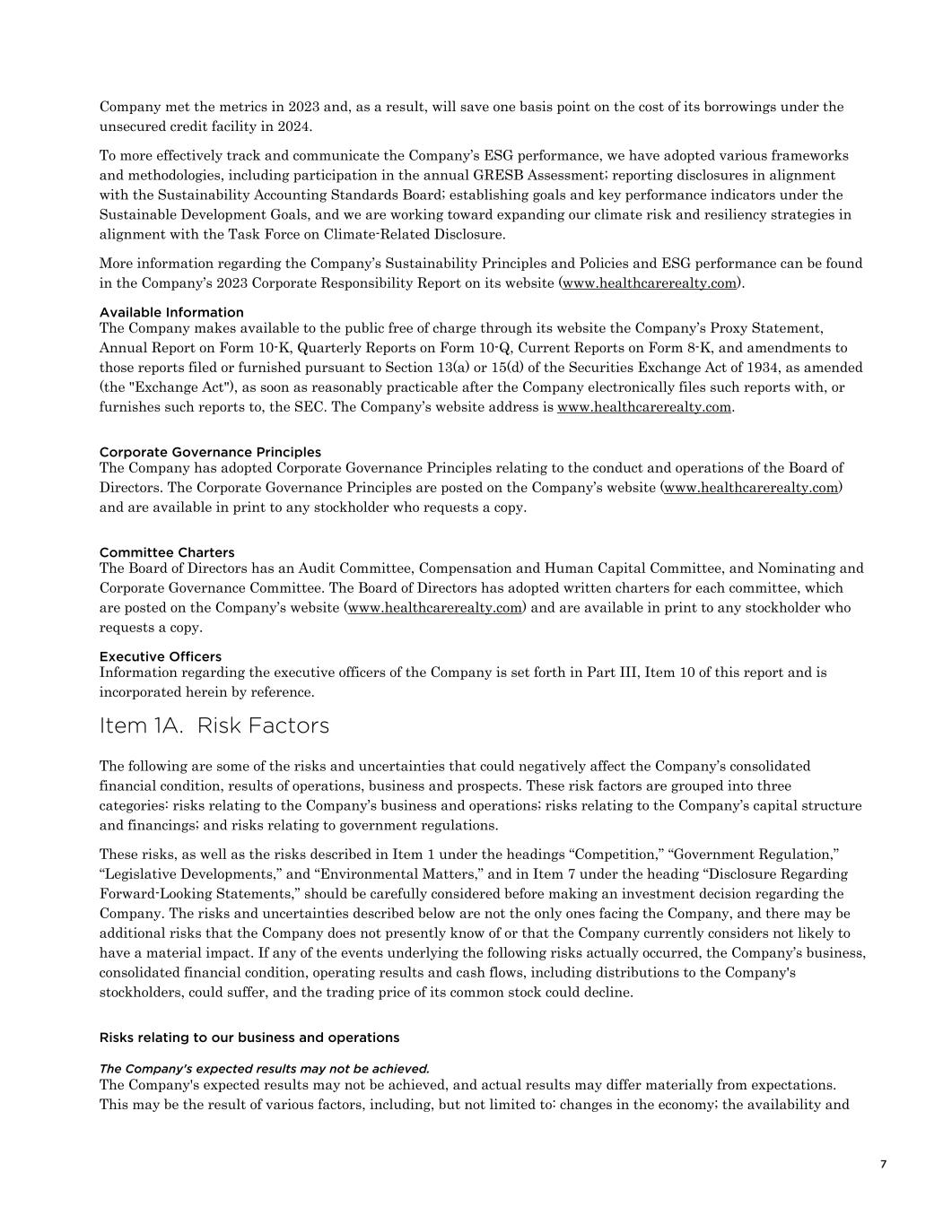 • Pandemics, such as COVID-19, and measures intended to prevent their spread or mitigate their severity could have a material adverse effect on the Company's business, results of operations, cash flows and financial condition. Risks relating to our capital structure and financings • The Company has incurred significant debt obligations and may incur additional debt and increase leverage in the future; • Covenants in the Company’s debt instruments limit its operational flexibility, and a breach of these covenants could materially affect the Company’s consolidated financial condition and results of operations; • If lenders under the Unsecured Credit Facility fail to meet their funding commitments, the Company’s operations and consolidated financial position would be negatively impacted; • The unavailability of equity and debt capital, volatility in the credit markets, increases in interest rates, or changes in the Company’s debt ratings could have an adverse effect on the Company’s ability to meet its debt payments, make dividend payments to stockholders or engage in acquisition and development activity; • Increases in interest rates could have a material adverse effect on the Company's cost of capital; • The Company's swap agreements may not effectively reduce its exposure to changes in interest rates; • The Company has entered into joint venture agreements that limit its flexibility with respect to jointly owned properties and expects to enter into additional such agreements in the future; • The U.S. federal income tax treatment of the cash that the Company might receive from cash settlement of a forward equity agreement is unclear and could jeopardize the Company's ability to meet the REIT qualification requirements; and • In case of our bankruptcy or insolvency, any forward equity agreements will automatically terminate, and the Company would not receive the expected proceeds from any forward sale of shares of its common stock. Risks relating to government regulations • The Company's property taxes could increase due to reassessment or property tax rate changes; • Trends in the healthcare service industry may negatively affect the demand for the Company’s properties, lease revenues and the values of its investments; • The costs of complying with governmental laws and regulations may adversely affect the Company's results of operations; • Qualifying as a REIT involves highly technical and complex provisions of the Internal Revenue Code; • If the Company fails to remain qualified as a REIT, the Company will be subject to significant adverse consequences, including adversely affecting the value of its common stock; • The Company’s articles of incorporation, as well as provisions of the MGCL, contain limits and restrictions on transferability of the Company’s common stock which may have adverse effects on the value of the Company’s common stock; • Complying with the REIT requirements may cause the Company to forego otherwise attractive opportunities; • The prohibited transactions tax may limit the Company's ability to sell properties; • New legislation or administrative or judicial action, in each instance potentially with retroactive effect, could make it more difficult or impossible for the Company to qualify as a REIT; and • New and increased transfer tax rates may reduce the value of the Company’s properties. The Company undertakes no obligation to publicly update or revise any forward-looking statements, whether as a result of new information, future events or otherwise. Stockholders and investors are cautioned not to unduly rely on such forward-looking statements when evaluating the information presented in the Company’s filings and reports, including, without limitation, estimates and projections regarding the performance of development projects the Company is pursuing. 26