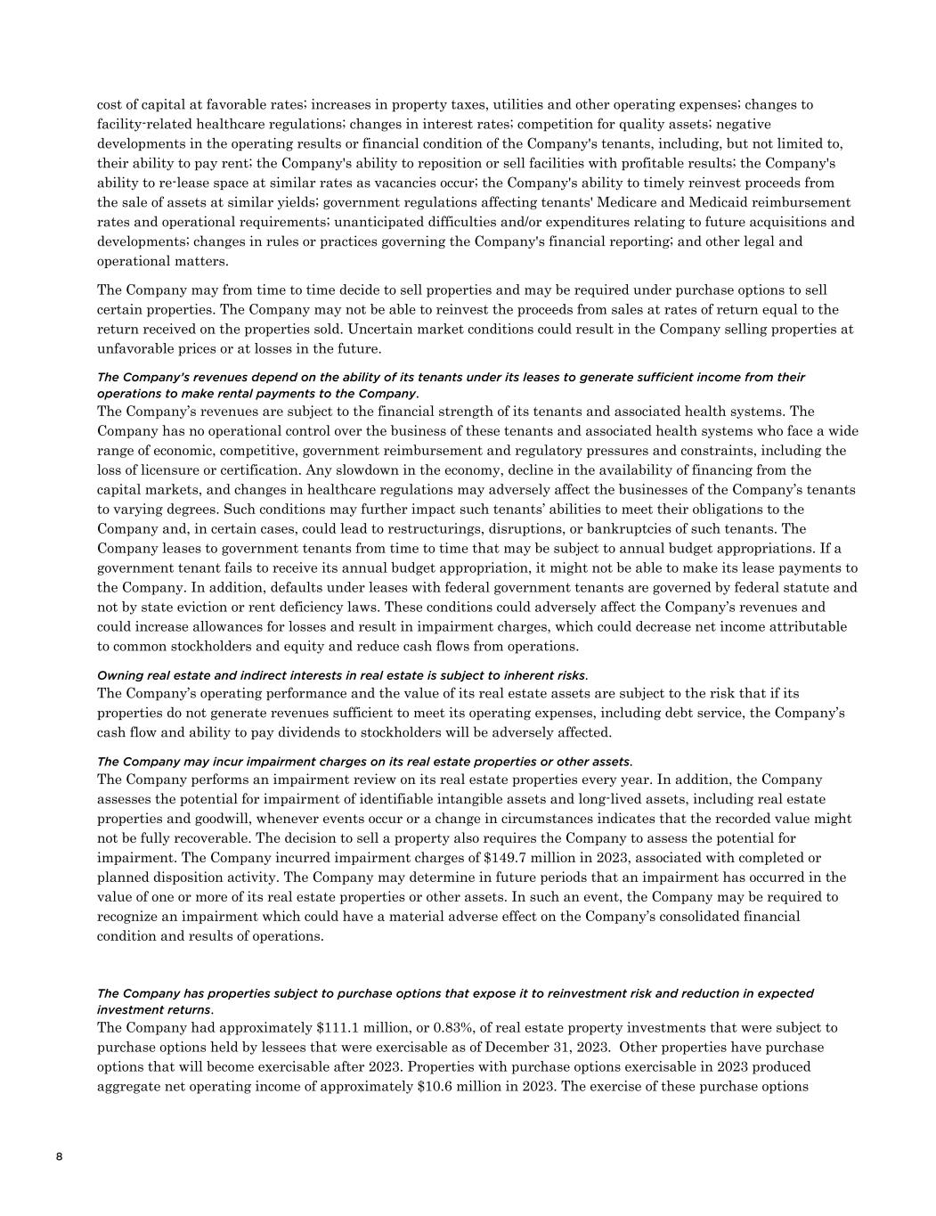 cost of capital at favorable rates; increases in property taxes, utilities and other operating expenses; changes to facility-related healthcare regulations; changes in interest rates; competition for quality assets; negative developments in the operating results or financial condition of the Company's tenants, including, but not limited to, their ability to pay rent; the Company's ability to reposition or sell facilities with profitable results; the Company's ability to re-lease space at similar rates as vacancies occur; the Company's ability to timely reinvest proceeds from the sale of assets at similar yields; government regulations affecting tenants' Medicare and Medicaid reimbursement rates and operational requirements; unanticipated difficulties and/or expenditures relating to future acquisitions and developments; changes in rules or practices governing the Company's financial reporting; and other legal and operational matters. The Company may from time to time decide to sell properties and may be required under purchase options to sell certain properties. The Company may not be able to reinvest the proceeds from sales at rates of return equal to the return received on the properties sold. Uncertain market conditions could result in the Company selling properties at unfavorable prices or at losses in the future. The Company’s revenues depend on the ability of its tenants under its leases to generate sufficient income from their operations to make rental payments to the Company. The Company’s revenues are subject to the financial strength of its tenants and associated health systems. The Company has no operational control over the business of these tenants and associated health systems who face a wide range of economic, competitive, government reimbursement and regulatory pressures and constraints, including the loss of licensure or certification. Any slowdown in the economy, decline in the availability of financing from the capital markets, and changes in healthcare regulations may adversely affect the businesses of the Company’s tenants to varying degrees. Such conditions may further impact such tenants’ abilities to meet their obligations to the Company and, in certain cases, could lead to restructurings, disruptions, or bankruptcies of such tenants. The Company leases to government tenants from time to time that may be subject to annual budget appropriations. If a government tenant fails to receive its annual budget appropriation, it might not be able to make its lease payments to the Company. In addition, defaults under leases with federal government tenants are governed by federal statute and not by state eviction or rent deficiency laws. These conditions could adversely affect the Company’s revenues and could increase allowances for losses and result in impairment charges, which could decrease net income attributable to common stockholders and equity and reduce cash flows from operations. Owning real estate and indirect interests in real estate is subject to inherent risks. The Company’s operating performance and the value of its real estate assets are subject to the risk that if its properties do not generate revenues sufficient to meet its operating expenses, including debt service, the Company’s cash flow and ability to pay dividends to stockholders will be adversely affected. The Company may incur impairment charges on its real estate properties or other assets. The Company performs an impairment review on its real estate properties every year. In addition, the Company assesses the potential for impairment of identifiable intangible assets and long-lived assets, including real estate properties and goodwill, whenever events occur or a change in circumstances indicates that the recorded value might not be fully recoverable. The decision to sell a property also requires the Company to assess the potential for impairment. The Company incurred impairment charges of $149.7 million in 2023, associated with completed or planned disposition activity. The Company may determine in future periods that an impairment has occurred in the value of one or more of its real estate properties or other assets. In such an event, the Company may be required to recognize an impairment which could have a material adverse effect on the Company’s consolidated financial condition and results of operations. The Company has properties subject to purchase options that expose it to reinvestment risk and reduction in expected investment returns. The Company had approximately $111.1 million, or 0.83%, of real estate property investments that were subject to purchase options held by lessees that were exercisable as of December 31, 2023. Other properties have purchase options that will become exercisable after 2023. Properties with purchase options exercisable in 2023 produced aggregate net operating income of approximately $10.6 million in 2023. The exercise of these purchase options 8