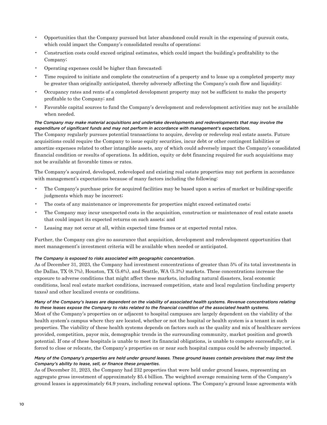 • Opportunities that the Company pursued but later abandoned could result in the expensing of pursuit costs, which could impact the Company’s consolidated results of operations; • Construction costs could exceed original estimates, which could impact the building’s profitability to the Company; • Operating expenses could be higher than forecasted; • Time required to initiate and complete the construction of a property and to lease up a completed property may be greater than originally anticipated, thereby adversely affecting the Company’s cash flow and liquidity; • Occupancy rates and rents of a completed development property may not be sufficient to make the property profitable to the Company; and • Favorable capital sources to fund the Company’s development and redevelopment activities may not be available when needed. The Company may make material acquisitions and undertake developments and redevelopments that may involve the expenditure of significant funds and may not perform in accordance with management’s expectations. The Company regularly pursues potential transactions to acquire, develop or redevelop real estate assets. Future acquisitions could require the Company to issue equity securities, incur debt or other contingent liabilities or amortize expenses related to other intangible assets, any of which could adversely impact the Company’s consolidated financial condition or results of operations. In addition, equity or debt financing required for such acquisitions may not be available at favorable times or rates. The Company’s acquired, developed, redeveloped and existing real estate properties may not perform in accordance with management’s expectations because of many factors including the following: • The Company’s purchase price for acquired facilities may be based upon a series of market or building-specific judgments which may be incorrect; • The costs of any maintenance or improvements for properties might exceed estimated costs; • The Company may incur unexpected costs in the acquisition, construction or maintenance of real estate assets that could impact its expected returns on such assets; and • Leasing may not occur at all, within expected time frames or at expected rental rates. Further, the Company can give no assurance that acquisition, development and redevelopment opportunities that meet management’s investment criteria will be available when needed or anticipated. The Company is exposed to risks associated with geographic concentration. As of December 31, 2023, the Company had investment concentrations of greater than 5% of its total investments in the Dallas, TX (8.7%), Houston, TX (5.6%), and Seattle, WA (5.3%) markets. These concentrations increase the exposure to adverse conditions that might affect these markets, including natural disasters, local economic conditions, local real estate market conditions, increased competition, state and local regulation (including property taxes) and other localized events or conditions. Many of the Company’s leases are dependent on the viability of associated health systems. Revenue concentrations relating to these leases expose the Company to risks related to the financial condition of the associated health systems. Most of the Company’s properties on or adjacent to hospital campuses are largely dependent on the viability of the health system’s campus where they are located, whether or not the hospital or health system is a tenant in such properties. The viability of these health systems depends on factors such as the quality and mix of healthcare services provided, competition, payor mix, demographic trends in the surrounding community, market position and growth potential. If one of these hospitals is unable to meet its financial obligations, is unable to compete successfully, or is forced to close or relocate, the Company’s properties on or near such hospital campus could be adversely impacted. Many of the Company’s properties are held under ground leases. These ground leases contain provisions that may limit the Company’s ability to lease, sell, or finance these properties. As of December 31, 2023, the Company had 232 properties that were held under ground leases, representing an aggregate gross investment of approximately $5.4 billion. The weighted average remaining term of the Company's ground leases is approximately 64.9 years, including renewal options. The Company’s ground lease agreements with 10