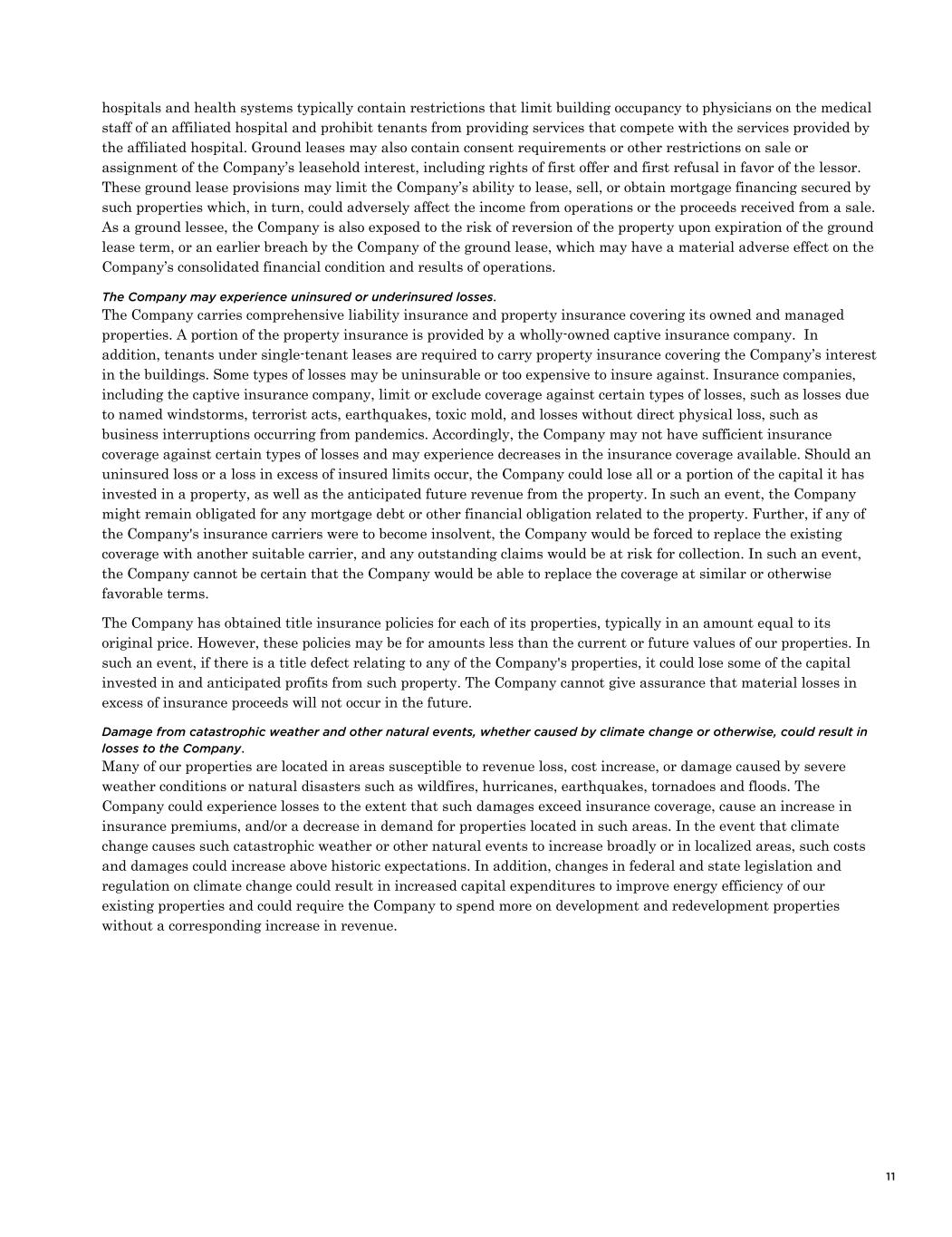• Opportunities that the Company pursued but later abandoned could result in the expensing of pursuit costs, which could impact the Company’s consolidated results of operations; • Construction costs could exceed original estimates, which could impact the building’s profitability to the Company; • Operating expenses could be higher than forecasted; • Time required to initiate and complete the construction of a property and to lease up a completed property may be greater than originally anticipated, thereby adversely affecting the Company’s cash flow and liquidity; • Occupancy rates and rents of a completed development property may not be sufficient to make the property profitable to the Company; and • Favorable capital sources to fund the Company’s development and redevelopment activities may not be available when needed. The Company may make material acquisitions and undertake developments and redevelopments that may involve the expenditure of significant funds and may not perform in accordance with management’s expectations. The Company regularly pursues potential transactions to acquire, develop or redevelop real estate assets. Future acquisitions could require the Company to issue equity securities, incur debt or other contingent liabilities or amortize expenses related to other intangible assets, any of which could adversely impact the Company’s consolidated financial condition or results of operations. In addition, equity or debt financing required for such acquisitions may not be available at favorable times or rates. The Company’s acquired, developed, redeveloped and existing real estate properties may not perform in accordance with management’s expectations because of many factors including the following: • The Company’s purchase price for acquired facilities may be based upon a series of market or building-specific judgments which may be incorrect; • The costs of any maintenance or improvements for properties might exceed estimated costs; • The Company may incur unexpected costs in the acquisition, construction or maintenance of real estate assets that could impact its expected returns on such assets; and • Leasing may not occur at all, within expected time frames or at expected rental rates. Further, the Company can give no assurance that acquisition, development and redevelopment opportunities that meet management’s investment criteria will be available when needed or anticipated. The Company is exposed to risks associated with geographic concentration. As of December 31, 2023, the Company had investment concentrations of greater than 5% of its total investments in the Dallas, TX (8.7%), Houston, TX (5.6%), and Seattle, WA (5.3%) markets. These concentrations increase the exposure to adverse conditions that might affect these markets, including natural disasters, local economic conditions, local real estate market conditions, increased competition, state and local regulation (including property taxes) and other localized events or conditions. Many of the Company’s leases are dependent on the viability of associated health systems. Revenue concentrations relating to these leases expose the Company to risks related to the financial condition of the associated health systems. Most of the Company’s properties on or adjacent to hospital campuses are largely dependent on the viability of the health system’s campus where they are located, whether or not the hospital or health system is a tenant in such properties. The viability of these health systems depends on factors such as the quality and mix of healthcare services provided, competition, payor mix, demographic trends in the surrounding community, market position and growth potential. If one of these hospitals is unable to meet its financial obligations, is unable to compete successfully, or is forced to close or relocate, the Company’s properties on or near such hospital campus could be adversely impacted. Many of the Company’s properties are held under ground leases. These ground leases contain provisions that may limit the Company’s ability to lease, sell, or finance these properties. As of December 31, 2023, the Company had 232 properties that were held under ground leases, representing an aggregate gross investment of approximately $5.4 billion. The weighted average remaining term of the Company's ground leases is approximately 64.9 years, including renewal options. The Company’s ground lease agreements with hospitals and health systems typically contain restrictions that limit building occupancy to physicians on the medical staff of an affiliated hospital and prohibit tenants from providing services that compete with the services provided by the affiliated hospital. Ground leases may also contain consent requirements or other restrictions on sale or assignment of the Company’s leasehold interest, including rights of first offer and first refusal in favor of the lessor. These ground lease provisions may limit the Company’s ability to lease, sell, or obtain mortgage financing secured by such properties which, in turn, could adversely affect the income from operations or the proceeds received from a sale. As a ground lessee, the Company is also exposed to the risk of reversion of the property upon expiration of the ground lease term, or an earlier breach by the Company of the ground lease, which may have a material adverse effect on the Company’s consolidated financial condition and results of operations. The Company may experience uninsured or underinsured losses. The Company carries comprehensive liability insurance and property insurance covering its owned and managed properties. A portion of the property insurance is provided by a wholly-owned captive insurance company. In addition, tenants under single-tenant leases are required to carry property insurance covering the Company’s interest in the buildings. Some types of losses may be uninsurable or too expensive