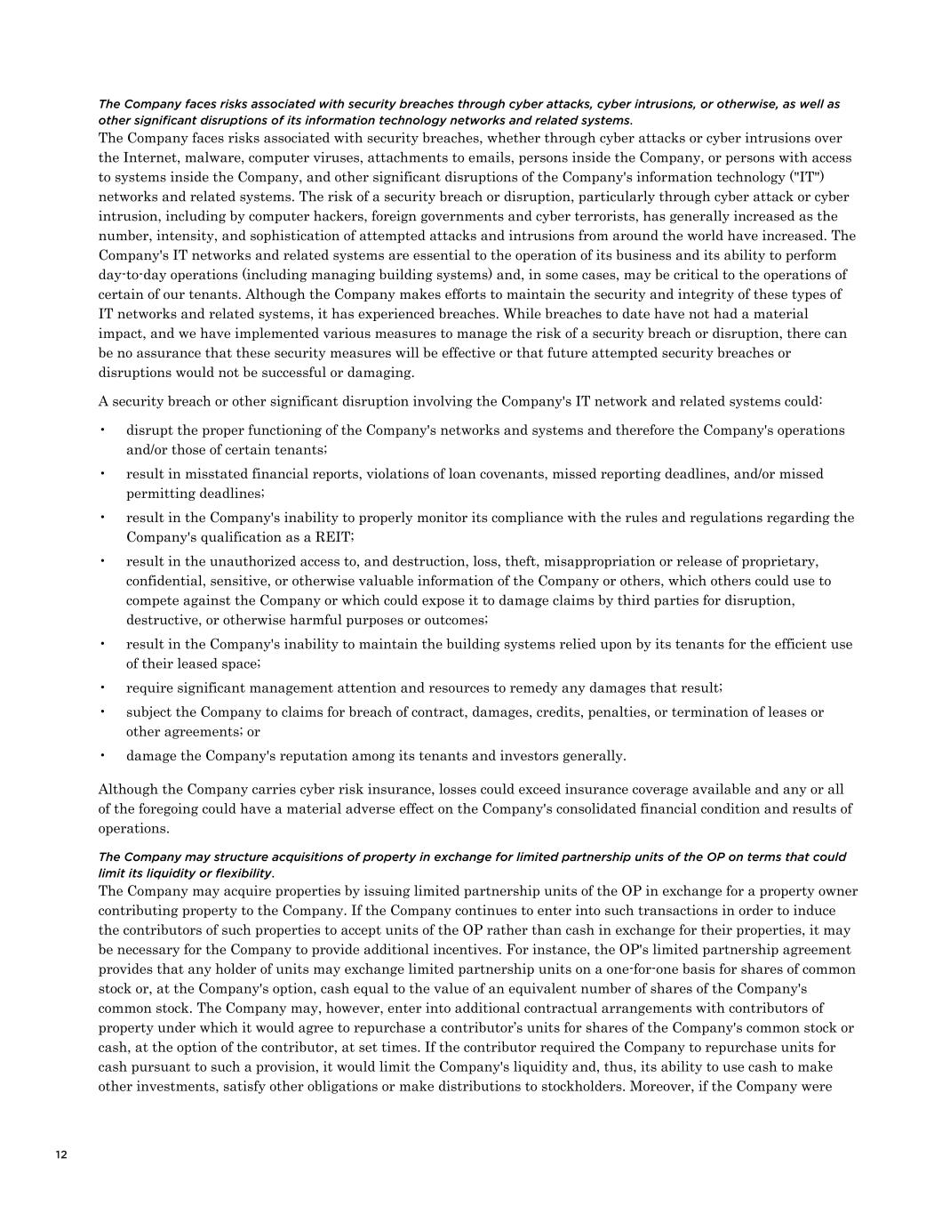 The Company faces risks associated with security breaches through cyber attacks, cyber intrusions, or otherwise, as well as other significant disruptions of its information technology networks and related systems. The Company faces risks associated with security breaches, whether through cyber attacks or cyber intrusions over the Internet, malware, computer viruses, attachments to emails, persons inside the Company, or persons with access to systems inside the Company, and other significant disruptions of the Company's information technology ("IT") networks and related systems. The risk of a security breach or disruption, particularly through cyber attack or cyber intrusion, including by computer hackers, foreign governments and cyber terrorists, has generally increased as the number, intensity, and sophistication of attempted attacks and intrusions from around the world have increased. The Company's IT networks and related systems are essential to the operation of its business and its ability to perform day-to-day operations (including managing building systems) and, in some cases, may be critical to the operations of certain of our tenants. Although the Company makes efforts to maintain the security and integrity of these types of IT networks and related systems, it has experienced breaches. While breaches to date have not had a material impact, and we have implemented various measures to manage the risk of a security breach or disruption, there can be no assurance that these security measures will be effective or that future attempted security breaches or disruptions would not be successful or damaging. A security breach or other significant disruption involving the Company's IT network and related systems could: • disrupt the proper functioning of the Company's networks and systems and therefore the Company's operations and/or those of certain tenants; • result in misstated financial reports, violations of loan covenants, missed reporting deadlines, and/or missed permitting deadlines; • result in the Company's inability to properly monitor its compliance with the rules and regulations regarding the Company's qualification as a REIT; • result in the unauthorized access to, and destruction, loss, theft, misappropriation or release of proprietary, confidential, sensitive, or otherwise valuable information of the Company or others, which others could use to compete against the Company or which could expose it to damage claims by third parties for disruption, destructive, or otherwise harmful purposes or outcomes; • result in the Company's inability to maintain the building systems relied upon by its tenants for the efficient use of their leased space; • require significant management attention and resources to remedy any damages that result; • subject the Company to claims for breach of contract, damages, credits, penalties, or termination of leases or other agreements; or • damage the Company's reputation among its tenants and investors generally. Although the Company carries cyber risk insurance, losses could exceed insurance coverage available and any or all of the foregoing could have a material adverse effect on the Company's consolidated financial condition and results of operations. The Company may structure acquisitions of property in exchange for limited partnership units of the OP on terms that could limit its liquidity or flexibility. The Company may acquire properties by issuing limited partnership units of the OP in exchange for a property owner contributing property to the Company. If the Company continues to enter into such transactions in order to induce the contributors of such properties to accept units of the OP rather than cash in exchange for their properties, it may be necessary for the Company to provide additional incentives. For instance, the OP's limited partnership agreement provides that any holder of units may exchange limited partnership units on a one-for-one basis for shares of common stock or, at the Company's option, cash equal to the value of an equivalent number of shares of the Company's common stock. The Company may, however, enter into additional contractual arrangements with contributors of property under which it would agree to repurchase a contributor’s units for shares of the Company's common stock or cash, at the option of the contributor, at set times. If the contributor required the Company to repurchase units for cash pursuant to such a provision, it would limit the Company's liquidity and, thus, its ability to use cash to make other investments, satisfy other obligations or make distributions to stockholders. Moreover, if the Company were 12