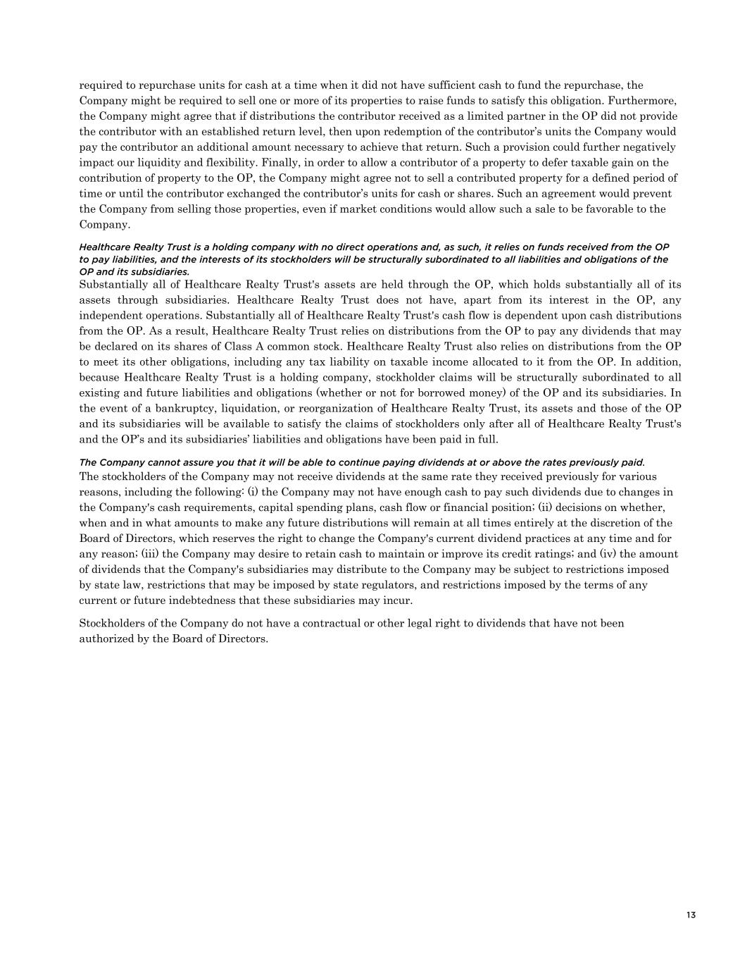 The Company faces risks associated with security breaches through cyber attacks, cyber intrusions, or otherwise, as well as other significant disruptions of its information technology networks and related systems. The Company faces risks associated with security breaches, whether through cyber attacks or cyber intrusions over the Internet, malware, computer viruses, attachments to emails, persons inside the Company, or persons with access to systems inside the Company, and other significant disruptions of the Company's information technology ("IT") networks and related systems. The risk of a security breach or disruption, particularly through cyber attack or cyber intrusion, including by computer hackers, foreign governments and cyber terrorists, has generally increased as the number, intensity, and sophistication of attempted attacks and intrusions from around the world have increased. The Company's IT networks and related systems are essential to the operation of its business and its ability to perform day-to-day operations (including managing building systems) and, in some cases, may be critical to the operations of certain of our tenants. Although the Company makes efforts to maintain the security and integrity of these types of IT networks and related systems, it has experienced breaches. While breaches to date have not had a material impact, and we have implemented various measures to manage the risk of a security breach or disruption, there can be no assurance that these security measures will be effective or that future attempted security breaches or disruptions would not be successful or damaging. A security breach or other significant disruption involving the Company's IT network and related systems could: • disrupt the proper functioning of the Company's networks and systems and therefore the Company's operations and/or those of certain tenants; • result in misstated financial reports, violations of loan covenants, missed reporting deadlines, and/or missed permitting deadlines; • result in the Company's inability to properly monitor its compliance with the rules and regulations regarding the Company's qualification as a REIT; • result in the unauthorized access to, and destruction, loss, theft, misappropriation or release of proprietary, confidential, sensitive, or otherwise valuable information of the Company or others, which others could use to compete against the Company or which could expose it to damage claims by third parties for disruption, destructive, or otherwise harmful purposes or outcomes; • result in the Company's inability to maintain the building systems relied upon by its tenants for the efficient use of their leased space; • require significant management attention and resources to remedy any damages that result; • subject the Company to claims for breach of contract, damages, credits, penalties, or termination of leases or other agreements; or • damage the Company's reputation among its tenants and investors generally. Although the Company carries cyber risk insurance, losses could exceed insurance coverage available and any or all of the foregoing could have a material adverse effect on the Company's consolidated financial condition and results of operations. The Company may structure acquisitions of property in exchange for limited partnership units of the OP on terms that could limit its liquidity or flexibility. The Company may acquire properties by issuing limited partnership units of the OP in exchange for a property owner contributing property to the Company. If the Company continues to enter into such transactions in order to induce the contributors of such properties to accept units of the OP rather than cash in exchange for their properties, it may be necessary for the Company to provide additional incentives. For instance, the OP's limited partnership agreement provides that any holder of units may exchange limited partnership units on a one-for-one basis for shares of common stock or, at the Company's option, cash equal to the value of an equivalent number of shares of the Company's common stock. The Company may, however, enter into additional contractual arrangements with contributors of property under which it would agree to repurchase a contributor’s units for shares of the Company's common stock or cash, at the option of the contributor, at set times. If the contributor required the Company to repurchase units for cash pursuant to such a provision, it would limit the Company's liquidity and, thus, its ability to use cash to make other investments, satisfy other obligations or make distributions to stockholders. Moreover, if the Company were required to repurchase units for cash at a time when it did not have sufficient cash to fund the repurchase, the Company might be required to sell one or more of its properties to raise funds to satisfy this obligation. Furthermore, the Company might agree that if distributions the contributor received as a limited partner in the OP did not provide the contributor with an established return level, then upon redemption of the contributor’s units the Company would pay the contributor an additional amount necessary to achieve that return. Such a provision could further negatively impact our liquidity and flexibility. Finally, in order to allow a contributor of a property to defer taxable gain on the contribution of property to the OP, the Company might agree not to sell a contributed property for a defined period of time or until the contributor exchanged the contributor’s units for cash or shares. Such an agreement would prevent the Company from selling those properties, even if market conditions would allow such a sale to be favorable to the Company. Healthcare Realty Trust is a holding company with no direct operations and, as such, it relies on funds received from the OP to pay liabilities, and the interests of its stockholders will be structurally subordinated to all liabilities and