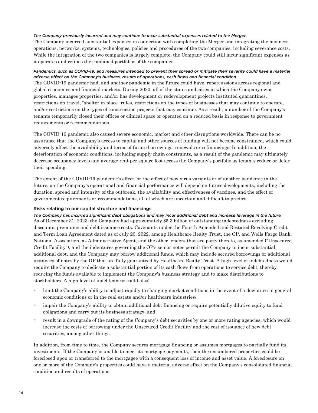 The Company previously incurred and may continue to incur substantial expenses related to the Merger. The Company incurred substantial expenses in connection with completing the Merger and integrating the business, operations, networks, systems, technologies, policies and procedures of the two companies, including severance costs. While the integration of the two companies is largely complete, the Company could still incur significant expenses as it operates and refines the combined portfolios of the companies. Pandemics, such as COVID-19, and measures intended to prevent their spread or mitigate their severity could have a material adverse effect on the Company's business, results of operations, cash flows and financial condition. The COVID-19 pandemic had, and another pandemic in the future could have, repercussions across regional and global economies and financial markets. During 2020, all of the states and cities in which the Company owns properties, manages properties, and/or has development or redevelopment projects instituted quarantines, restrictions on travel, “shelter in place” rules, restrictions on the types of businesses that may continue to operate, and/or restrictions on the types of construction projects that may continue. As a result, a number of the Company's tenants temporarily closed their offices or clinical space or operated on a reduced basis in response to government requirements or recommendations. The COVID-19 pandemic also caused severe economic, market and other disruptions worldwide. There can be no assurance that the Company's access to capital and other sources of funding will not become constrained, which could adversely affect the availability and terms of future borrowings, renewals or refinancings. In addition, the deterioration of economic conditions, including supply chain constraints, as a result of the pandemic may ultimately decrease occupancy levels and average rent per square foot across the Company's portfolio as tenants reduce or defer their spending. The extent of the COVID-19 pandemic’s effect, or the effect of new virus variants or of another pandemic in the future, on the Company's operational and financial performance will depend on future developments, including the duration, spread and intensity of the outbreak, the availability and effectiveness of vaccines, and the effect of government requirements or recommendations, all of which are uncertain and difficult to predict. Risks relating to our capital structure and financings The Company has incurred significant debt obligations and may incur additional debt and increase leverage in the future. As of December 31, 2023, the Company had approximately $5.3 billion of outstanding indebtedness excluding discounts, premiums and debt issuance costs. Covenants under the Fourth Amended and Restated Revolving Credit and Term Loan Agreement dated as of July 20, 2022, among Healthcare Realty Trust, the OP, and Wells Fargo Bank, National Association, as Administrative Agent, and the other lenders that are party thereto, as amended ("Unsecured Credit Facility"), and the indentures governing the OP's senior notes permit the Company to incur substantial, additional debt, and the Company may borrow additional funds, which may include secured borrowings or additional instances of notes by the OP that are fully guaranteed by Healthcare Realty Trust. A high level of indebtedness would require the Company to dedicate a substantial portion of its cash flows from operations to service debt, thereby reducing the funds available to implement the Company's business strategy and to make distributions to stockholders. A high level of indebtedness could also: • limit the Company’s ability to adjust rapidly to changing market conditions in the event of a downturn in general economic conditions or in the real estate and/or healthcare industries; • impair the Company’s ability to obtain additional debt financing or require potentially dilutive equity to fund obligations and carry out its business strategy; and • result in a downgrade of the rating of the Company’s debt securities by one or more rating agencies, which would increase the costs of borrowing under the Unsecured Credit Facility and the cost of issuance of new debt securities, among other things. In addition, from time to time, the Company secures mortgage financing or assumes mortgages to partially fund its investments. If the Company is unable to meet its mortgage payments, then the encumbered properties could be foreclosed upon or transferred to the mortgagee with a consequent loss of income and asset value. A foreclosure on one or more of the Company's properties could have a material adverse effect on the Company’s consolidated financial condition and results of operations. 14