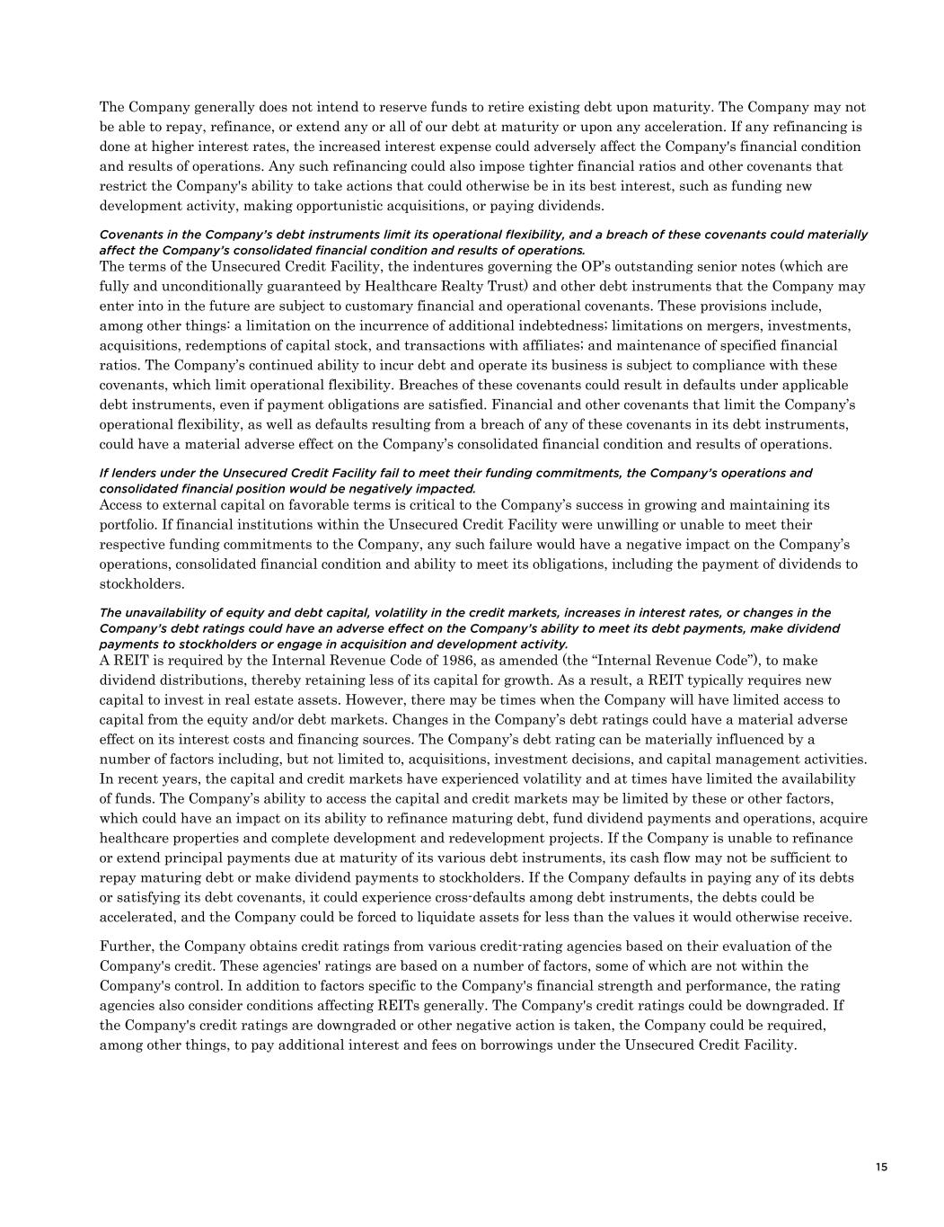 The Company previously incurred and may continue to incur substantial expenses related to the Merger. The Company incurred substantial expenses in connection with completing the Merger and integrating the business, operations, networks, systems, technologies, policies and procedures of the two companies, including severance costs. While the integration of the two companies is largely complete, the Company could still incur significant expenses as it operates and refines the combined portfolios of the companies. Pandemics, such as COVID-19, and measures intended to prevent their spread or mitigate their severity could have a material adverse effect on the Company's business, results of operations, cash flows and financial condition. The COVID-19 pandemic had, and another pandemic in the future could have, repercussions across regional and global economies and financial markets. During 2020, all of the states and cities in which the Company owns properties, manages properties, and/or has development or redevelopment projects instituted quarantines, restrictions on travel, “shelter in place” rules, restrictions on the types of businesses that may continue to operate, and/or restrictions on the types of construction projects that may continue. As a result, a number of the Company's tenants temporarily closed their offices or clinical space or operated on a reduced basis in response to government requirements or recommendations. The COVID-19 pandemic also caused severe economic, market and other disruptions worldwide. There can be no assurance that the Company's access to capital and other sources of funding will not become constrained, which could adversely affect the availability and terms of future borrowings, renewals or refinancings. In addition, the deterioration of economic conditions, including supply chain constraints, as a result of the pandemic may ultimately decrease occupancy levels and average rent per square foot across the Company's portfolio as tenants reduce or defer their spending. The extent of the COVID-19 pandemic’s effect, or the effect of new virus variants or of another pandemic in the future, on the Company's operational and financial performance will depend on future developments, including the duration, spread and intensity of the outbreak, the availability and effectiveness of vaccines, and the effect of government requirements or recommendations, all of which are uncertain and difficult to predict. Risks relating to our capital structure and financings The Company has incurred significant debt obligations and may incur additional debt and increase leverage in the future. As of December 31, 2023, the Company had approximately $5.3 billion of outstanding indebtedness excluding discounts, premiums and debt issuance costs. Covenants under the Fourth Amended and Restated Revolving Credit and Term Loan Agreement dated as of July 20, 2022, among Healthcare Realty Trust, the OP, and Wells Fargo Bank, National Association, as Administrative Agent, and the other lenders that are party thereto, as amended ("Unsecured Credit Facility"), and the indentures governing the OP's senior notes permit the Company to incur substantial, additional debt, and the Company may borrow additional funds, which may include secured borrowings or additional instances of notes by the OP that are fully guaranteed by Healthcare Realty Trust. A high level of indebtedness would require the Company to dedicate a substantial portion of its cash flows from operations to service debt, thereby reducing the funds available to implement the Company's business strategy and to make distributions to stockholders. A high level of indebtedness could also: • limit the Company’s ability to adjust rapidly to changing market conditions in the event of a downturn in general economic conditions or in the real estate and/or healthcare industries; • impair the Company’s ability to obtain additional debt financing or require potentially dilutive equity to fund obligations and carry out its business strategy; and • result in a downgrade of the rating of the Company’s debt securities by one or more rating agencies, which would increase the costs of borrowing under the Unsecured Credit Facility and the cost of issuance of new debt securities, among other things. In addition, from time to time, the Company secures mortgage financing or assumes mortgages to partially fund its investments. If the Company is unable to meet its mortgage payments, then the encumbered properties could be foreclosed upon or transferred to the mortgagee with a consequent loss of income and asset value. A foreclosure on one or more of the Company's properties could have a material adverse effect on the Company’s consolidated financial condition and results of operations. The Company generally does not intend to reserve funds to retire existing debt upon maturity. The Company may not be able to repay, refinance, or extend any or all of our debt at maturity or upon any acceleration. If any refinancing is done at higher interest rates, the increased interest expense could adversely affect the Company's financial condition and results of operations. Any such refinancing could also impose tighter financial ratios and other covenants that restrict the Company's ability to take actions that could otherwise be in its best interest, such as funding new development activity, making opportunistic acquisitions, or paying dividends. Covenants in the Company’s debt instruments limit its operational flexibility, and a breach of these covenants could materially affect the Company’s consolidated financial condition and results of operations. The terms of the Unsecured Credit Facility, the indentures governing the OP’s outstanding senior notes (which are fully and unconditionally guaranteed by Healthcare Realty Trust) and other debt instruments that the Company may enter into in the future are subject to customary financial and operational c