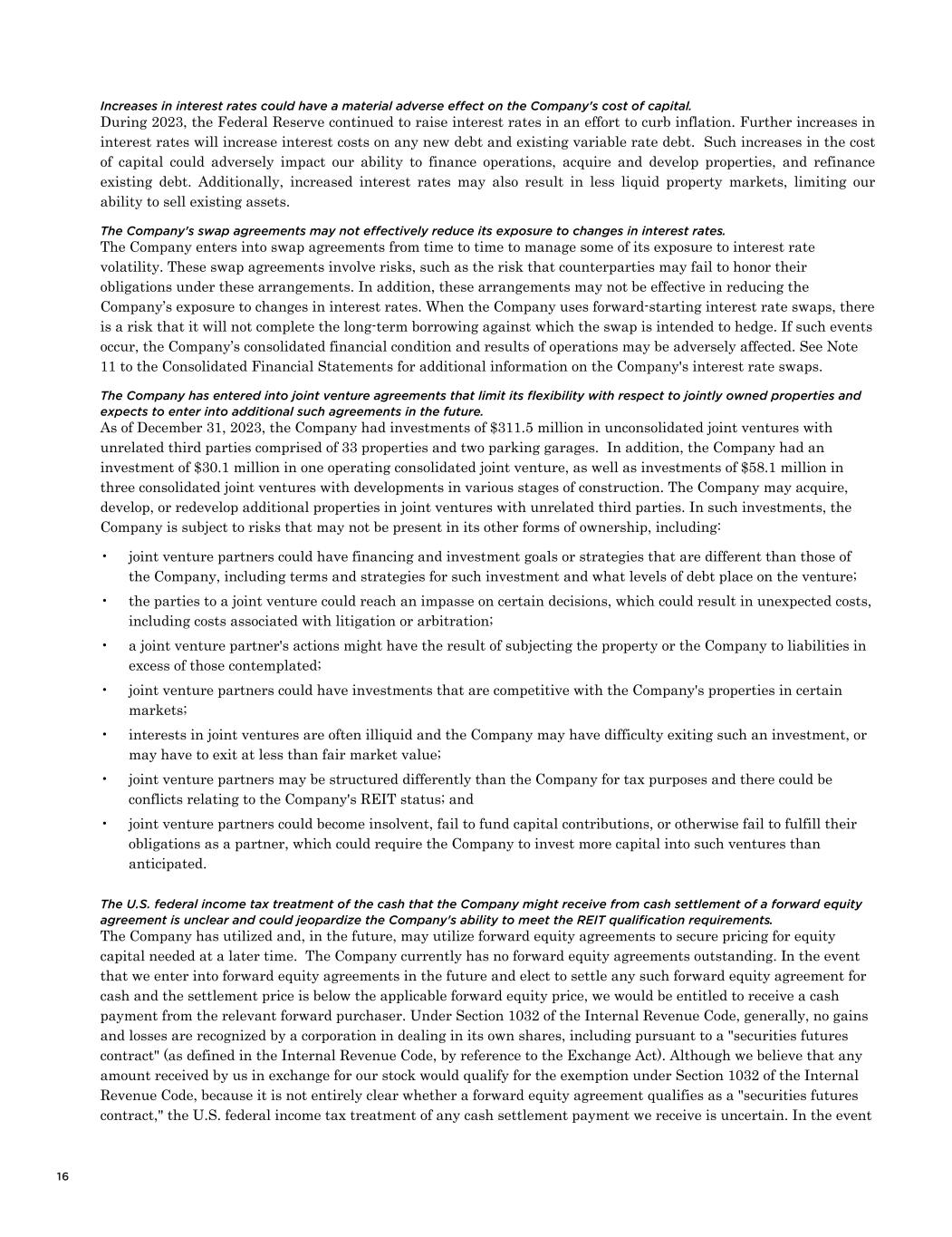 Increases in interest rates could have a material adverse effect on the Company's cost of capital. During 2023, the Federal Reserve continued to raise interest rates in an effort to curb inflation. Further increases in interest rates will increase interest costs on any new debt and existing variable rate debt. Such increases in the cost of capital could adversely impact our ability to finance operations, acquire and develop properties, and refinance existing debt. Additionally, increased interest rates may also result in less liquid property markets, limiting our ability to sell existing assets. The Company's swap agreements may not effectively reduce its exposure to changes in interest rates. The Company enters into swap agreements from time to time to manage some of its exposure to interest rate volatility. These swap agreements involve risks, such as the risk that counterparties may fail to honor their obligations under these arrangements. In addition, these arrangements may not be effective in reducing the Company’s exposure to changes in interest rates. When the Company uses forward-starting interest rate swaps, there is a risk that it will not complete the long-term borrowing against which the swap is intended to hedge. If such events occur, the Company’s consolidated financial condition and results of operations may be adversely affected. See Note 11 to the Consolidated Financial Statements for additional information on the Company's interest rate swaps. The Company has entered into joint venture agreements that limit its flexibility with respect to jointly owned properties and expects to enter into additional such agreements in the future. As of December 31, 2023, the Company had investments of $311.5 million in unconsolidated joint ventures with unrelated third parties comprised of 33 properties and two parking garages. In addition, the Company had an investment of $30.1 million in one operating consolidated joint venture, as well as investments of $58.1 million in three consolidated joint ventures with developments in various stages of construction. The Company may acquire, develop, or redevelop additional properties in joint ventures with unrelated third parties. In such investments, the Company is subject to risks that may not be present in its other forms of ownership, including: • joint venture partners could have financing and investment goals or strategies that are different than those of the Company, including terms and strategies for such investment and what levels of debt place on the venture; • the parties to a joint venture could reach an impasse on certain decisions, which could result in unexpected costs, including costs associated with litigation or arbitration; • a joint venture partner's actions might have the result of subjecting the property or the Company to liabilities in excess of those contemplated; • joint venture partners could have investments that are competitive with the Company's properties in certain markets; • interests in joint ventures are often illiquid and the Company may have difficulty exiting such an investment, or may have to exit at less than fair market value; • joint venture partners may be structured differently than the Company for tax purposes and there could be conflicts relating to the Company's REIT status; and • joint venture partners could become insolvent, fail to fund capital contributions, or otherwise fail to fulfill their obligations as a partner, which could require the Company to invest more capital into such ventures than anticipated. The U.S. federal income tax treatment of the cash that the Company might receive from cash settlement of a forward equity agreement is unclear and could jeopardize the Company's ability to meet the REIT qualification requirements. The Company has utilized and, in the future, may utilize forward equity agreements to secure pricing for equity capital needed at a later time. The Company currently has no forward equity agreements outstanding. In the event that we enter into forward equity agreements in the future and elect to settle any such forward equity agreement for cash and the settlement price is below the applicable forward equity price, we would be entitled to receive a cash payment from the relevant forward purchaser. Under Section 1032 of the Internal Revenue Code, generally, no gains and losses are recognized by a corporation in dealing in its own shares, including pursuant to a "securities futures contract" (as defined in the Internal Revenue Code, by reference to the Exchange Act). Although we believe that any amount received by us in exchange for our stock would qualify for the exemption under Section 1032 of the Internal Revenue Code, because it is not entirely clear whether a forward equity agreement qualifies as a "securities futures contract," the U.S. federal income tax treatment of any cash settlement payment we receive is uncertain. In the event 16
