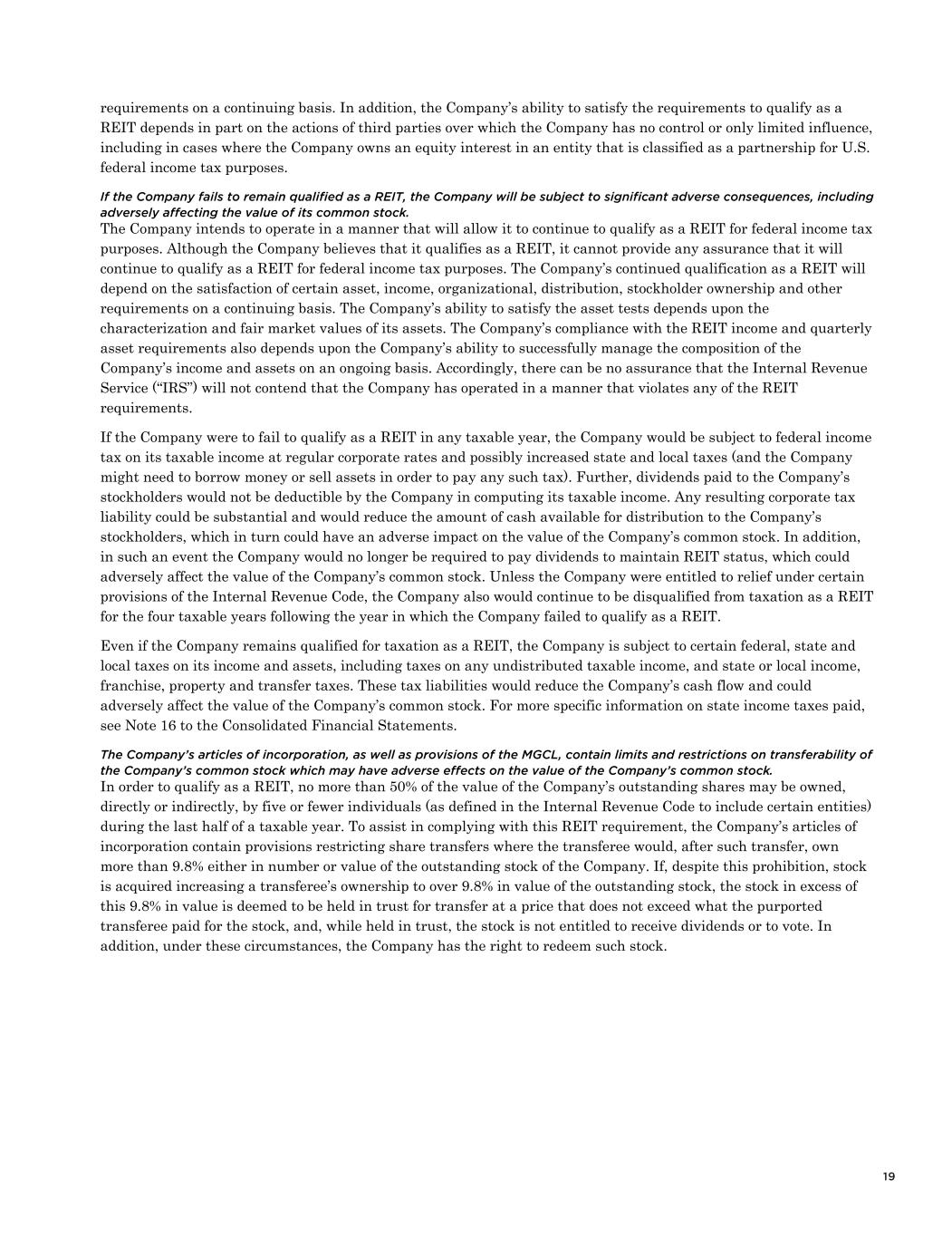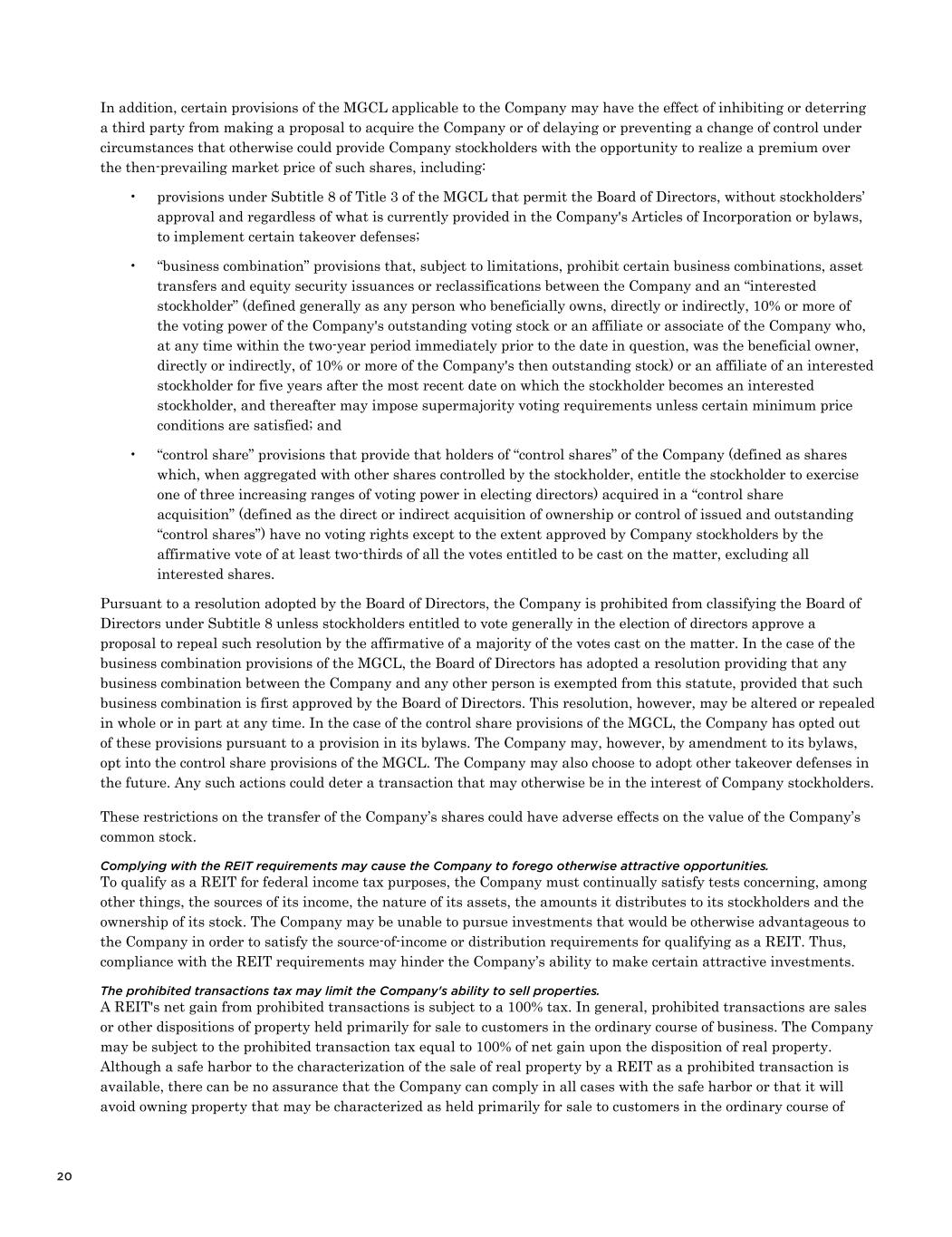 In addition, certain provisions of the MGCL applicable to the Company may have the effect of inhibiting or deterring a third party from making a proposal to acquire the Company or of delaying or preventing a change of control under circumstances that otherwise could provide Company stockholders with the opportunity to realize a premium over the then-prevailing market price of such shares, including: • provisions under Subtitle 8 of Title 3 of the MGCL that permit the Board of Directors, without stockholders’ approval and regardless of what is currently provided in the Company's Articles of Incorporation or bylaws, to implement certain takeover defenses; • “business combination” provisions that, subject to limitations, prohibit certain business combinations, asset transfers and equity security issuances or reclassifications between the Company and an “interested stockholder” (defined generally as any person who beneficially owns, directly or indirectly, 10% or more of the voting power of the Company's outstanding voting stock or an affiliate or associate of the Company who, at any time within the two-year period immediately prior to the date in question, was the beneficial owner, directly or indirectly, of 10% or more of the Company's then outstanding stock) or an affiliate of an interested stockholder for five years after the most recent date on which the stockholder becomes an interested stockholder, and thereafter may impose supermajority voting requirements unless certain minimum price conditions are satisfied; and • “control share” provisions that provide that holders of “control shares” of the Company (defined as shares which, when aggregated with other shares controlled by the stockholder, entitle the stockholder to exercise one of three increasing ranges of voting power in electing directors) acquired in a “control share acquisition” (defined as the direct or indirect acquisition of ownership or control of issued and outstanding “control shares”) have no voting rights except to the extent approved by Company stockholders by the affirmative vote of at least two-thirds of all the votes entitled to be cast on the matter, excluding all interested shares. Pursuant to a resolution adopted by the Board of Directors, the Company is prohibited from classifying the Board of Directors under Subtitle 8 unless stockholders entitled to vote generally in the election of directors approve a proposal to repeal such resolution by the affirmative of a majority of the votes cast on the matter. In the case of the business combination provisions of the MGCL, the Board of Directors has adopted a resolution providing that any business combination between the Company and any other person is exempted from this statute, provided that such business combination is first approved by the Board of Directors. This resolution, however, may be altered or repealed in whole or in part at any time. In the case of the control share provisions of the MGCL, the Company has opted out of these provisions pursuant to a provision in its bylaws. The Company may, however, by amendment to its bylaws, opt into the control share provisions of the MGCL. The Company may also choose to adopt other takeover defenses in the future. Any such actions could deter a transaction that may otherwise be in the interest of Company stockholders. These restrictions on the transfer of the Company’s shares could have adverse effects on the value of the Company’s common stock. Complying with the REIT requirements may cause the Company to forego otherwise attractive opportunities. To qualify as a REIT for federal income tax purposes, the Company must continually satisfy tests concerning, among other things, the sources of its income, the nature of its assets, the amounts it distributes to its stockholders and the ownership of its stock. The Company may be unable to pursue investments that would be otherwise advantageous to the Company in order to satisfy the source-of-income or distribution requirements for qualifying as a REIT. Thus, compliance with the REIT requirements may hinder the Company’s ability to make certain attractive investments. The prohibited transactions tax may limit the Company's ability to sell properties. A REIT's net gain from prohibited transactions is subject to a 100% tax. In general, prohibited transactions are sales or other dispositions of property held primarily for sale to customers in the ordinary course of business. The Company may be subject to the prohibited transaction tax equal to 100% of net gain upon the disposition of real property. Although a safe harbor to the characterization of the sale of real property by a REIT as a prohibited transaction is available, there can be no assurance that the Company can comply in all cases with the safe harbor or that it will avoid owning property that may be characterized as held primarily for sale to customers in the ordinary course of 20