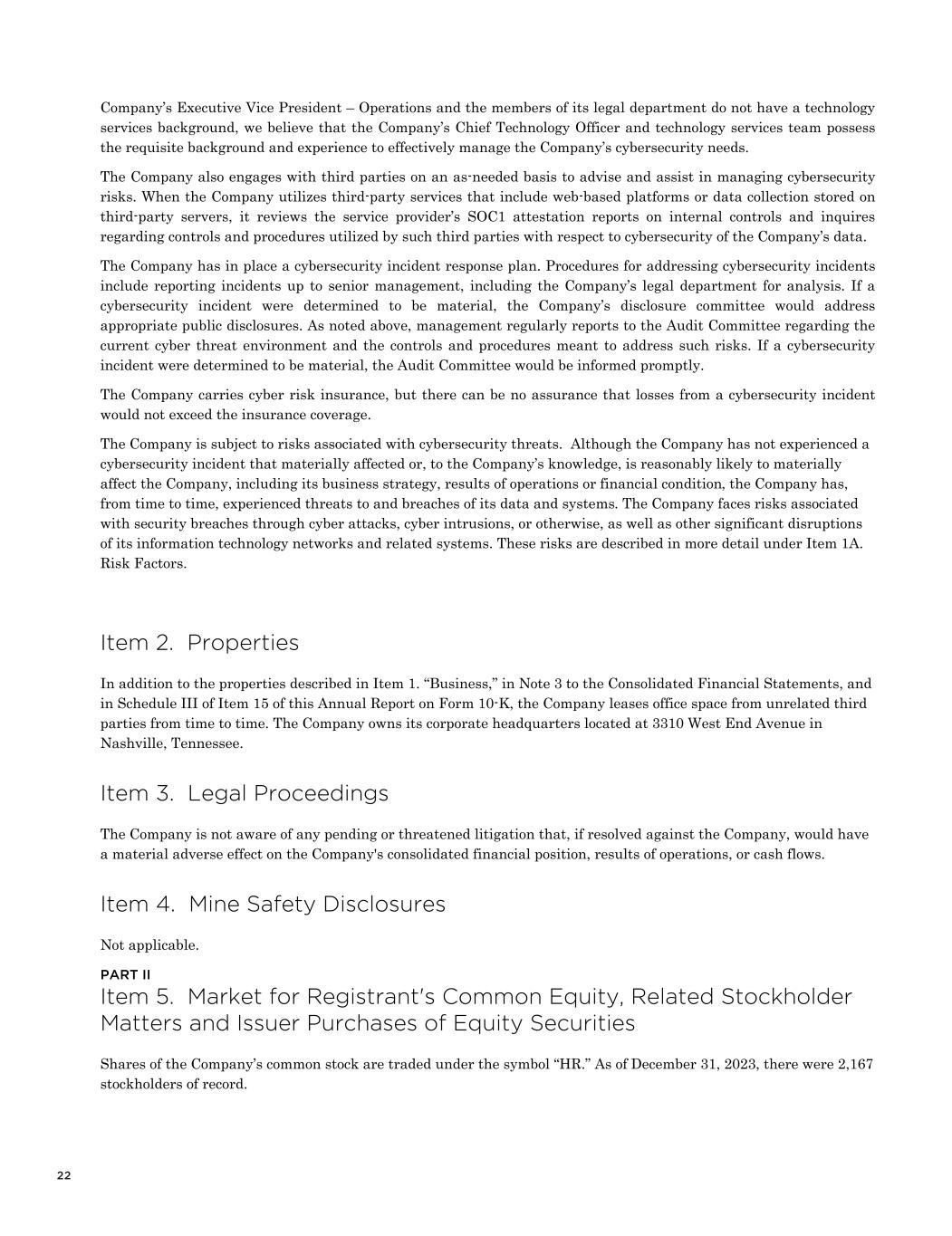 Company’s Executive Vice President – Operations and the members of its legal department do not have a technology services background, we believe that the Company’s Chief Technology Officer and technology services team possess the requisite background and experience to effectively manage the Company’s cybersecurity needs. The Company also engages with third parties on an as-needed basis to advise and assist in managing cybersecurity risks. When the Company utilizes third-party services that include web-based platforms or data collection stored on third-party servers, it reviews the service provider’s SOC1 attestation reports on internal controls and inquires regarding controls and procedures utilized by such third parties with respect to cybersecurity of the Company’s data. The Company has in place a cybersecurity incident response plan. Procedures for addressing cybersecurity incidents include reporting incidents up to senior management, including the Company’s legal department for analysis. If a cybersecurity incident were determined to be material, the Company’s disclosure committee would address appropriate public disclosures. As noted above, management regularly reports to the Audit Committee regarding the current cyber threat environment and the controls and procedures meant to address such risks. If a cybersecurity incident were determined to be material, the Audit Committee would be informed promptly. The Company carries cyber risk insurance, but there can be no assurance that losses from a cybersecurity incident would not exceed the insurance coverage. The Company is subject to risks associated with cybersecurity threats. Although the Company has not experienced a cybersecurity incident that materially affected or, to the Company’s knowledge, is reasonably likely to materially affect the Company, including its business strategy, results of operations or financial condition, the Company has, from time to time, experienced threats to and breaches of its data and systems. The Company faces risks associated with security breaches through cyber attacks, cyber intrusions, or otherwise, as well as other significant disruptions of its information technology networks and related systems. These risks are described in more detail under Item 1A. Risk Factors. Item 2. Properties In addition to the properties described in Item 1. “Business,” in Note 3 to the Consolidated Financial Statements, and in Schedule III of Item 15 of this Annual Report on Form 10-K, the Company leases office space from unrelated third parties from time to time. The Company owns its corporate headquarters located at 3310 West End Avenue in Nashville, Tennessee. Item 3. Legal Proceedings The Company is not aware of any pending or threatened litigation that, if resolved against the Company, would have a material adverse effect on the Company's consolidated financial position, results of operations, or cash flows. Item 4. Mine Safety Disclosures Not applicable. PART II Item 5. Market for Registrant's Common Equity, Related Stockholder Matters and Issuer Purchases of Equity Securities Shares of the Company’s common stock are traded under the symbol “HR.” As of December 31, 2023, there were 2,167 stockholders of record. 22