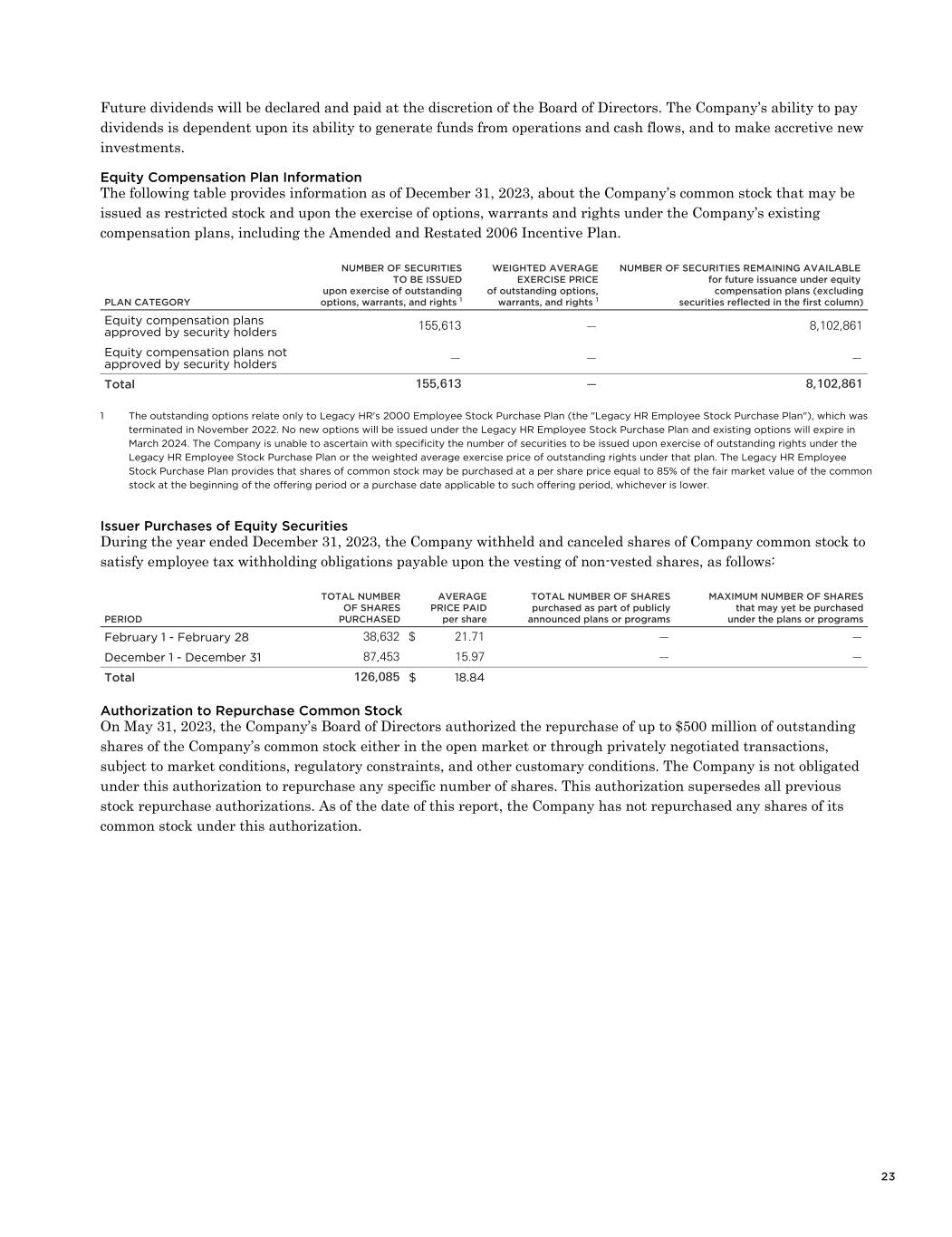 Company’s Executive Vice President – Operations and the members of its legal department do not have a technology services background, we believe that the Company’s Chief Technology Officer and technology services team possess the requisite background and experience to effectively manage the Company’s cybersecurity needs. The Company also engages with third parties on an as-needed basis to advise and assist in managing cybersecurity risks. When the Company utilizes third-party services that include web-based platforms or data collection stored on third-party servers, it reviews the service provider’s SOC1 attestation reports on internal controls and inquires regarding controls and procedures utilized by such third parties with respect to cybersecurity of the Company’s data. The Company has in place a cybersecurity incident response plan. Procedures for addressing cybersecurity incidents include reporting incidents up to senior management, including the Company’s legal department for analysis. If a cybersecurity incident were determined to be material, the Company’s disclosure committee would address appropriate public disclosures. As noted above, management regularly reports to the Audit Committee regarding the current cyber threat environment and the controls and procedures meant to address such risks. If a cybersecurity incident were determined to be material, the Audit Committee would be informed promptly. The Company carries cyber risk insurance, but there can be no assurance that losses from a cybersecurity incident would not exceed the insurance coverage. The Company is subject to risks associated with cybersecurity threats. Although the Company has not experienced a cybersecurity incident that materially affected or, to the Company’s knowledge, is reasonably likely to materially affect the Company, including its business strategy, results of operations or financial condition, the Company has, from time to time, experienced threats to and breaches of its data and systems. The Company faces risks associated with security breaches through cyber attacks, cyber intrusions, or otherwise, as well as other significant disruptions of its information technology networks and related systems. These risks are described in more detail under Item 1A. Risk Factors. Item 2. Properties In addition to the properties described in Item 1. “Business,” in Note 3 to the Consolidated Financial Statements, and in Schedule III of Item 15 of this Annual Report on Form 10-K, the Company leases office space from unrelated third parties from time to time. The Company owns its corporate headquarters located at 3310 West End Avenue in Nashville, Tennessee. Item 3. Legal Proceedings The Company is not aware of any pending or threatened litigation that, if resolved against the Company, would have a material adverse effect on the Company's consolidated financial position, results of operations, or cash flows. Item 4. Mine Safety Disclosures Not applicable. PART II Item 5. Market for Registrant's Common Equity, Related Stockholder Matters and Issuer Purchases of Equity Securities Shares of the Company’s common stock are traded under the symbol “HR.” As of December 31, 2023, there were 2,167 stockholders of record. Future dividends will be declared and paid at the discretion of the Board of Directors. The Company’s ability to pay dividends is dependent upon its ability to generate funds from operations and cash flows, and to make accretive new investments. Equity Compensation Plan Information The following table provides information as of December 31, 2023, about the Company’s common stock that may be issued as restricted stock and upon the exercise of options, warrants and rights under the Company’s existing compensation plans, including the Amended and Restated 2006 Incentive Plan. PLAN CATEGORY NUMBER OF SECURITIES TO BE ISSUED upon exercise of outstanding options, warrants, and rights 1 WEIGHTED AVERAGE EXERCISE PRICE of outstanding options, warrants, and rights 1 NUMBER OF SECURITIES REMAINING AVAILABLE for future issuance under equity compensation plans (excluding securities reflected in the first column) Equity compensation plans approved by security holders 155,613 — 8,102,861 Equity compensation plans not approved by security holders — — — Total 155,613 — 8,102,861 1 The outstanding options relate only to Legacy HR's 2000 Employee Stock Purchase Plan (the "Legacy HR Employee Stock Purchase Plan"), which was terminated in November 2022. No new options will be issued under the Legacy HR Employee Stock Purchase Plan and existing options will expire in March 2024. The Company is unable to ascertain with specificity the number of securities to be issued upon exercise of outstanding rights under the Legacy HR Employee Stock Purchase Plan or the weighted average exercise price of outstanding rights under that plan. The Legacy HR Employee Stock Purchase Plan provides that shares of common stock may be purchased at a per share price equal to 85% of the fair market value of the common stock at the beginning of the offering period or a purchase date applicable to such offering period, whichever is lower. Issuer Purchases of Equity Securities During the year ended December 31, 2023, the Company withheld and canceled shares of Company common stock to satisfy employee tax withholding obligations payable upon the vesting of non-vested shares, as follows: PERIOD TOTAL NUMBER OF SHARES PURCHASED AVERAGE PRICE PAID per share TOTAL NUMBER OF SHARES purchased as part of publicly announced plans or programs MAXIMUM NUMBER OF SHARES that may yet be purchased under the plans or programs February 1 - February 28 38,632 $ 21.71 — — December 1 - December 31 87,453 15.97 — — Total 126,085 $ 18.84 Authorization to Repurchase Common Stock On May 31, 2023, the Company’s Board of Directors authorized the repurchase of up to $500 million of outstanding shares of the Company’s common sto