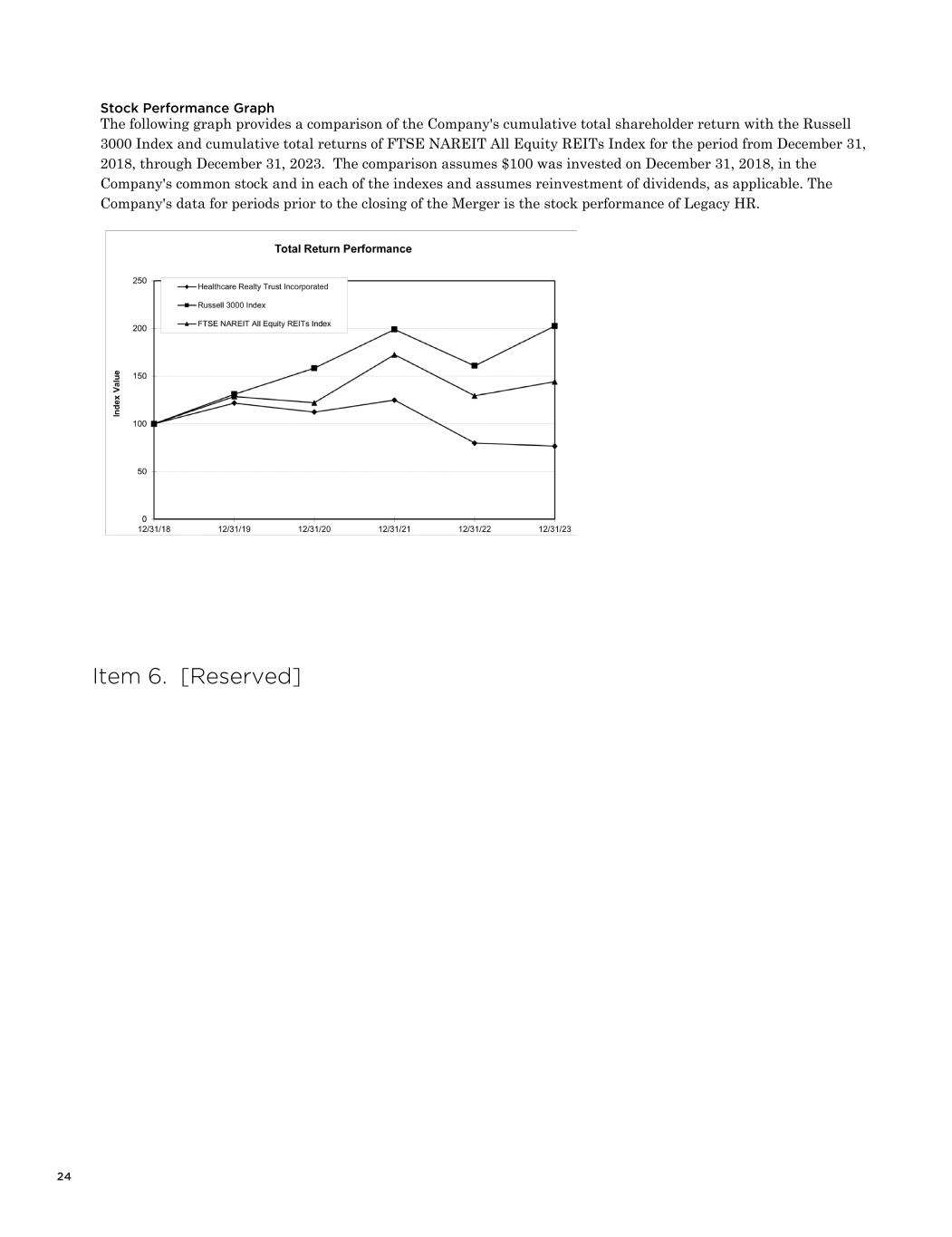 Stock Performance Graph The following graph provides a comparison of the Company's cumulative total shareholder return with the Russell 3000 Index and cumulative total returns of FTSE NAREIT All Equity REITs Index for the period from December 31, 2018, through December 31, 2023. The comparison assumes $100 was invested on December 31, 2018, in the Company's common stock and in each of the indexes and assumes reinvestment of dividends, as applicable. The Company's data for periods prior to the closing of the Merger is the stock performance of Legacy HR. Item 6. [Reserved] Stock Performance Graph The following graph provides a comparison of the Company's cumulative total shareholder return with the Russell 3000 Index and cumulative total returns of FTSE NAREIT All Equity REITs Index for the period from December 31, 2018, through December 31, 2023. The comparison assumes $100 was invested on December 31, 2018, in the Company's common stock and in each of the indexes and assumes reinvestment of dividends, as applicable. The C pany's da a for p ri ds prior to the closing of the Merger is the stock performance of Legacy HR. Item 6. [Reserved] Stock Performance Graph The following graph provides a comparison of the Company's cumulative total shareholder return with the Russell 3000 Index and cumulative total returns of FTSE NAREIT All Equity REITs Index for the period from December 31, 2018, through December 31, 2023. The comparison assumes $100 was invested on December 31, 2018, in the Company's common stock and in each of the indexes and assumes reinvestment of dividends, as applicable. The Company's data for periods prior to the closing of the Merger is the stock performance of Legacy HR. Item 6. [Reserved] 24