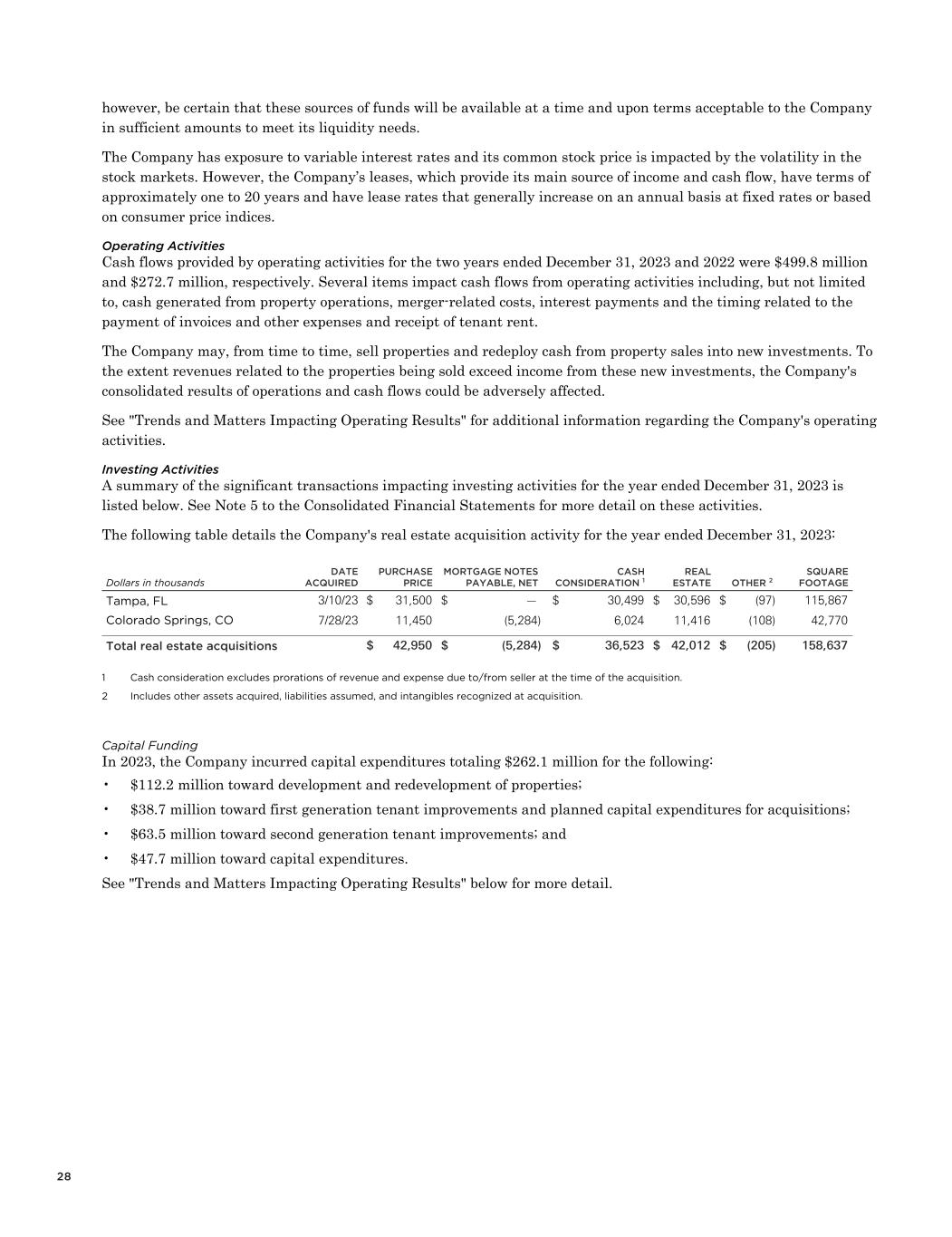 however, be certain that these sources of funds will be available at a time and upon terms acceptable to the Company in sufficient amounts to meet its liquidity needs. The Company has exposure to variable interest rates and its common stock price is impacted by the volatility in the stock markets. However, the Company’s leases, which provide its main source of income and cash flow, have terms of approximately one to 20 years and have lease rates that generally increase on an annual basis at fixed rates or based on consumer price indices. Operating Activities Cash flows provided by operating activities for the two years ended December 31, 2023 and 2022 were $499.8 million and $272.7 million, respectively. Several items impact cash flows from operating activities including, but not limited to, cash generated from property operations, merger-related costs, interest payments and the timing related to the payment of invoices and other expenses and receipt of tenant rent. The Company may, from time to time, sell properties and redeploy cash from property sales into new investments. To the extent revenues related to the properties being sold exceed income from these new investments, the Company's consolidated results of operations and cash flows could be adversely affected. See "Trends and Matters Impacting Operating Results" for additional information regarding the Company's operating activities. Investing Activities A summary of the significant transactions impacting investing activities for the year ended December 31, 2023 is listed below. See Note 5 to the Consolidated Financial Statements for more detail on these activities. The following table details the Company's real estate acquisition activity for the year ended December 31, 2023: Dollars in thousands DATE ACQUIRED PURCHASE PRICE MORTGAGE NOTES PAYABLE, NET CASH CONSIDERATION 1 REAL ESTATE OTHER 2 SQUARE FOOTAGE Tampa, FL 3/10/23 $ 31,500 $ — $ 30,499 $ 30,596 $ (97) 115,867 Colorado Springs, CO 7/28/23 11,450 (5,284) 6,024 11,416 (108) 42,770 Total real estate acquisitions $ 42,950 $ (5,284) $ 36,523 $ 42,012 $ (205) 158,637 1 Cash consideration excludes prorations of revenue and expense due to/from seller at the time of the acquisition. 2 Includes other assets acquired, liabilities assumed, and intangibles recognized at acquisition. Capital Funding In 2023, the Company incurred capital expenditures totaling $262.1 million for the following: • $112.2 million toward development and redevelopment of properties; • $38.7 million toward first generation tenant improvements and planned capital expenditures for acquisitions; • $63.5 million toward second generation tenant improvements; and • $47.7 million toward capital expenditures. See "Trends and Matters Impacting Operating Results" below for more detail. 28
