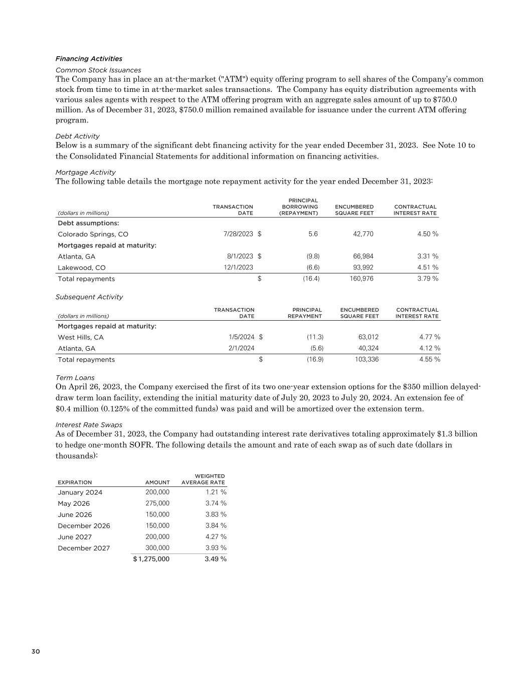 Financing Activities Common Stock Issuances The Company has in place an at-the-market ("ATM") equity offering program to sell shares of the Company’s common stock from time to time in at-the-market sales transactions. The Company has equity distribution agreements with various sales agents with respect to the ATM offering program with an aggregate sales amount of up to $750.0 million. As of December 31, 2023, $750.0 million remained available for issuance under the current ATM offering program. Debt Activity Below is a summary of the significant debt financing activity for the year ended December 31, 2023. See Note 10 to the Consolidated Financial Statements for additional information on financing activities. Mortgage Activity The following table details the mortgage note repayment activity for the year ended December 31, 2023: (dollars in millions) TRANSACTION DATE PRINCIPAL BORROWING (REPAYMENT) ENCUMBERED SQUARE FEET CONTRACTUAL INTEREST RATE Debt assumptions: Colorado Springs, CO 7/28/2023 $ 5.6 42,770 4.50 % Mortgages repaid at maturity: Atlanta, GA 8/1/2023 $ (9.8) 66,984 3.31 % Lakewood, CO 12/1/2023 (6.6) 93,992 4.51 % Total repayments $ (16.4) 160,976 3.79 % Subsequent Activity (dollars in millions) TRANSACTION DATE PRINCIPAL REPAYMENT ENCUMBERED SQUARE FEET CONTRACTUAL INTEREST RATE Mortgages repaid at maturity: West Hills, CA 1/5/2024 $ (11.3) 63,012 4.77 % Atlanta, GA 2/1/2024 (5.6) 40,324 4.12 % Total repayments $ (16.9) 103,336 4.55 % Term Loans On April 26, 2023, the Company exercised the first of its two one-year extension options for the $350 million delayed- draw term loan facility, extending the initial maturity date of July 20, 2023 to July 20, 2024. An extension fee of $0.4 million (0.125% of the committed funds) was paid and will be amortized over the extension term. Interest Rate Swaps As of December 31, 2023, the Company had outstanding interest rate derivatives totaling approximately $1.3 billion to hedge one-month SOFR. The following details the amount and rate of each swap as of such date (dollars in thousands): EXPIRATION AMOUNT WEIGHTED AVERAGE RATE January 2024 200,000 1.21 % May 2026 275,000 3.74 % June 2026 150,000 3.83 % December 2026 150,000 3.84 % June 2027 200,000 4.27 % December 2027 300,000 3.93 % $ 1,275,000 3.49 % 30