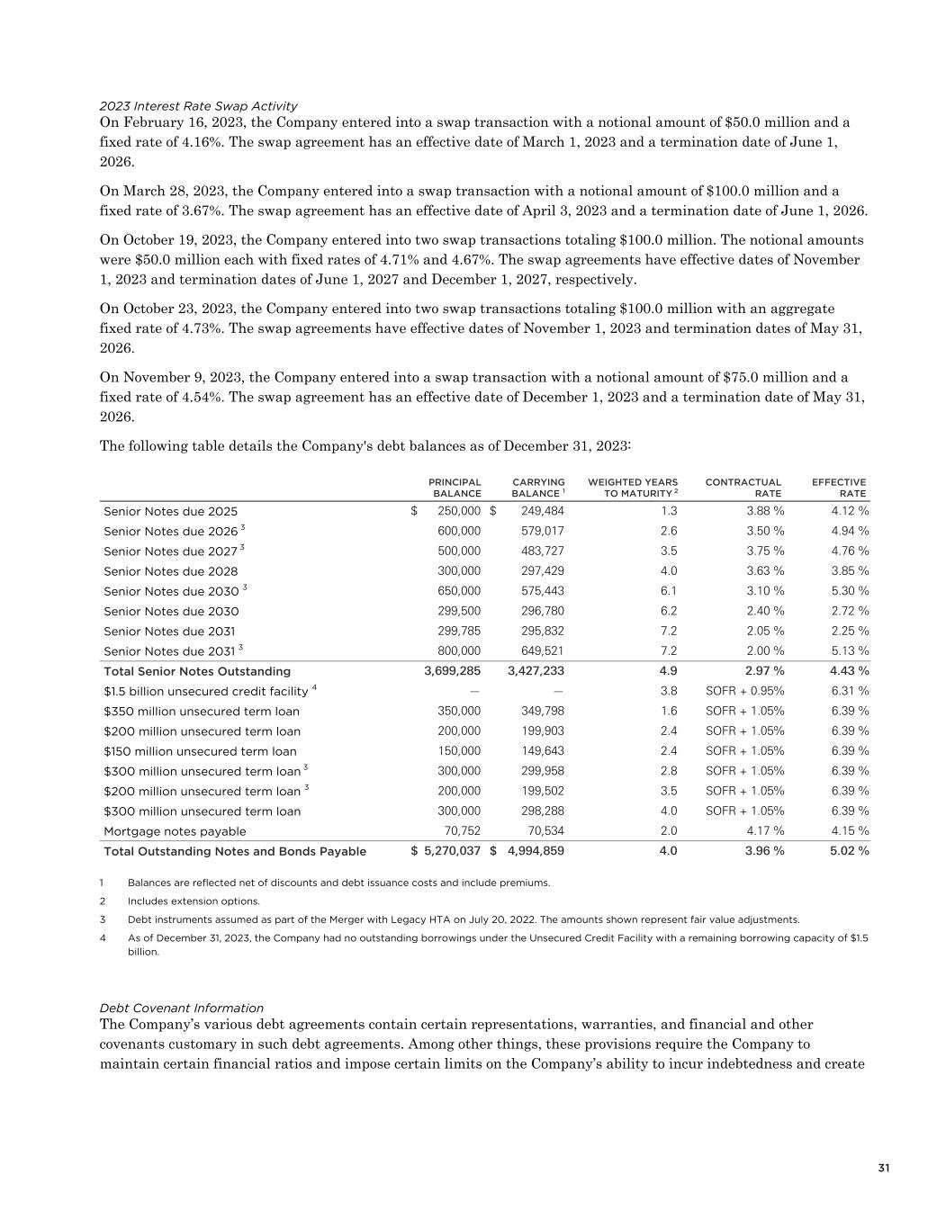 Financing Activities Common Stock Issuances The Company has in place an at-the-market ("ATM") equity offering program to sell shares of the Company’s common stock from time to time in at-the-market sales transactions. The Company has equity distribution agreements with various sales agents with respect to the ATM offering program with an aggregate sales amount of up to $750.0 million. As of December 31, 2023, $750.0 million remained available for issuance under the current ATM offering program. Debt Activity Below is a summary of the significant debt financing activity for the year ended December 31, 2023. See Note 10 to the Consolidated Financial Statements for additional information on financing activities. Mortgage Activity The following table details the mortgage note repayment activity for the year ended December 31, 2023: (dollars in millions) TRANSACTION DATE PRINCIPAL BORROWING (REPAYMENT) ENCUMBERED SQUARE FEET CONTRACTUAL INTEREST RATE Debt assumptions: Colorado Springs, CO 7/28/2023 $ 5.6 42,770 4.50 % Mortgages repaid at maturity: Atlanta, GA 8/1/2023 $ (9.8) 66,984 3.31 % Lakewood, CO 12/1/2023 (6.6) 93,992 4.51 % Total repayments $ (16.4) 160,976 3.79 % Subsequent Activity (dollars in millions) TRANSACTION DATE PRINCIPAL REPAYMENT ENCUMBERED SQUARE FEET CONTRACTUAL INTEREST RATE Mortgages repaid at maturity: West Hills, CA 1/5/2024 $ (11.3) 63,012 4.77 % Atlanta, GA 2/1/2024 (5.6) 40,324 4.12 % Total repayments $ (16.9) 103,336 4.55 % Term Loans On April 26, 2023, the Company exercised the first of its two one-year extension options for the $350 million delayed- draw term loan facility, extending the initial maturity date of July 20, 2023 to July 20, 2024. An extension fee of $0.4 million (0.125% of the committed funds) was paid and will be amortized over the extension term. Interest Rate Swaps As of December 31, 2023, the Company had outstanding interest rate derivatives totaling approximately $1.3 billion to hedge one-month SOFR. The following details the amount and rate of each swap as of such date (dollars in thousands): EXPIRATION AMOUNT WEIGHTED AVERAGE RATE January 2024 200,000 1.21 % May 2026 275,000 3.74 % June 2026 150,000 3.83 % December 2026 150,000 3.84 % June 2027 200,000 4.27 % December 2027 300,000 3.93 % $ 1,275,000 3.49 % 2023 Interest Rate Swap Activity On February 16, 2023, the Company entered into a swap transaction with a notional amount of $50.0 million and a fixed rate of 4.16%. The swap agreement has an effective date of March 1, 2023 and a termination date of June 1, 2026. On March 28, 2023, the Company entered into a swap transaction with a notional amount of $100.0 million and a fixed rate of 3.67%. The swap agreement has an effective date of April 3, 2023 and a termination date of June 1, 2026. On October 19, 2023, the Company entered into two swap transactions totaling $100.0 million. The notional amounts were $50.0 million each with fixed rates of 4.71% and 4.67%. The swap agreements have effective dates of November 1, 2023 and termination dates of June 1, 2027 and December 1, 2027, respectively. On October 23, 2023, the Company entered into two swap transactions totaling $100.0 million with an aggregate fixed rate of 4.73%. The swap agreements have effective dates of November 1, 2023 and termination dates of May 31, 2026. On November 9, 2023, the Company entered into a swap transaction with a notional amount of $75.0 million and a fixed rate of 4.54%. The swap agreement has an effective date of December 1, 2023 and a termination date of May 31, 2026. The following table details the Company's debt balances as of December 31, 2023: PRINCIPAL BALANCE CARRYING BALANCE 1 WEIGHTED YEARS TO MATURITY 2 CONTRACTUAL RATE EFFECTIVE RATE Senior Notes due 2025 $ 250,000 $ 249,484 1.3 3.88 % 4.12 % Senior Notes due 2026 3 600,000 579,017 2.6 3.50 % 4.94 % Senior Notes due 2027 3 500,000 483,727 3.5 3.75 % 4.76 % Senior Notes due 2028 300,000 297,429 4.0 3.63 % 3.85 % Senior Notes due 2030 3 650,000 575,443 6.1 3.10 % 5.30 % Senior Notes due 2030 299,500 296,780 6.2 2.40 % 2.72 % Senior Notes due 2031 299,785 295,832 7.2 2.05 % 2.25 % Senior Notes due 2031 3 800,000 649,521 7.2 2.00 % 5.13 % Total Senior Notes Outstanding 3,699,285 3,427,233 4.9 2.97 % 4.43 % $1.5 billion unsecured credit facility 4 — — 3.8 SOFR + 0.95% 6.31 % $350 million unsecured term loan 350,000 349,798 1.6 SOFR + 1.05% 6.39 % $200 million unsecured term loan 200,000 199,903 2.4 SOFR + 1.05% 6.39 % $150 million unsecured term loan 150,000 149,643 2.4 SOFR + 1.05% 6.39 % $300 million unsecured term loan 3 300,000 299,958 2.8 SOFR + 1.05% 6.39 % $200 million unsecured term loan 3 200,000 199,502 3.5 SOFR + 1.05% 6.39 % $300 million unsecured term loan 300,000 298,288 4.0 SOFR + 1.05% 6.39 % Mortgage notes payable 70,752 70,534 2.0 4.17 % 4.15 % Total Outstanding Notes and Bonds Payable $ 5,270,037 $ 4,994,859 4.0 3.96 % 5.02 % 1 Balances are reflected net of discounts and debt issuance costs and include premiums. 2 Includes extension options. 3 Debt instruments assumed as part of the Merger with Legacy HTA on July 20, 2022. The amounts shown represent fair value adjustments. 4 As of December 31, 2023, the Company had no outstanding borrowings under the Unsecured Credit Facility with a remaining borrowing capacity of $1.5 billion. Debt Covenant Information The Company’s various debt agreements contain certain representations, warranties, and financial and other covenants customary in such debt agreements. Among other things, these provisions require the Company to maintain certain financial ratios and impose certain limits on the Company’s ability to incur indebtedness and create 31