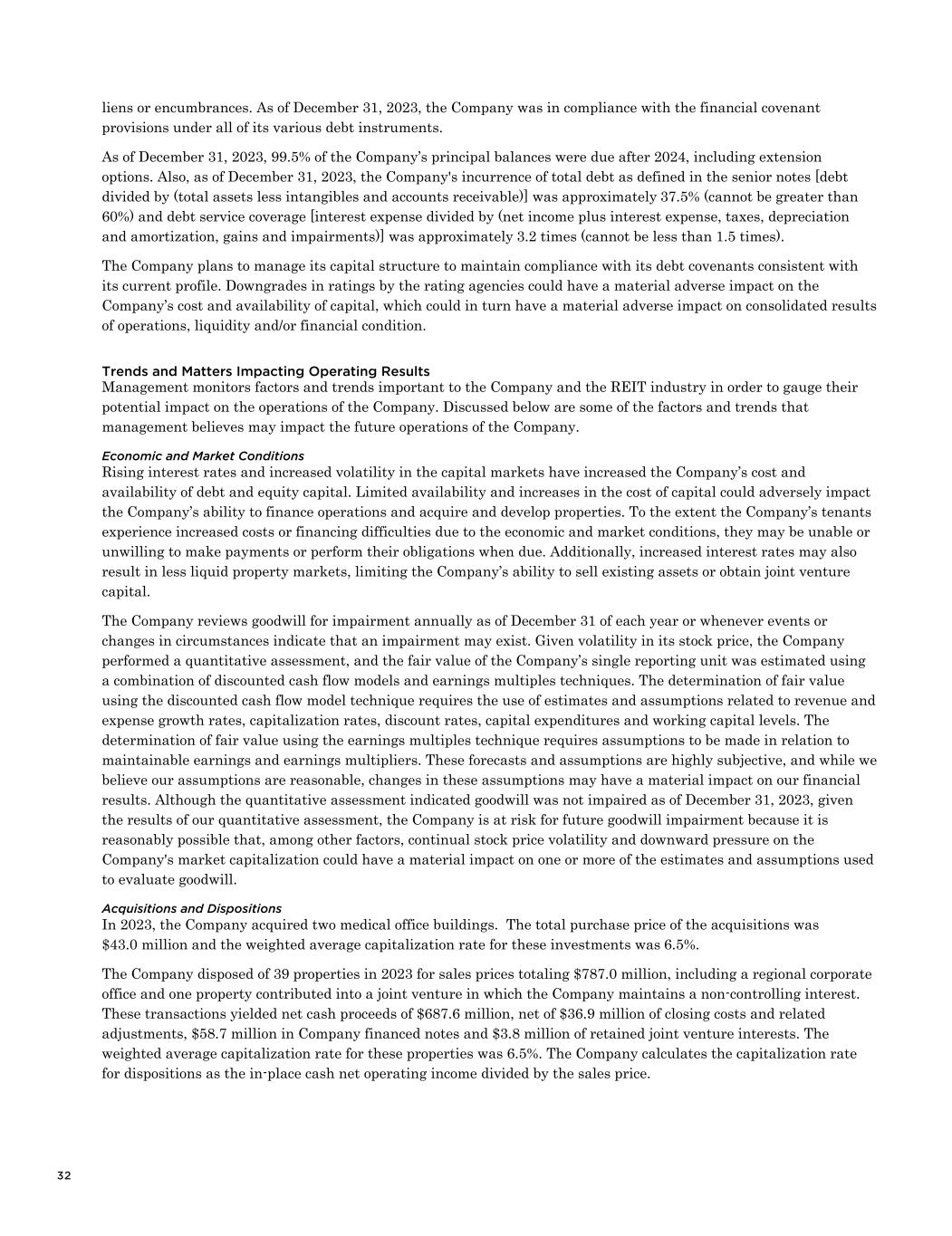 liens or encumbrances. As of December 31, 2023, the Company was in compliance with the financial covenant provisions under all of its various debt instruments. As of December 31, 2023, 99.5% of the Company’s principal balances were due after 2024, including extension options. Also, as of December 31, 2023, the Company's incurrence of total debt as defined in the senior notes [debt divided by (total assets less intangibles and accounts receivable)] was approximately 37.5% (cannot be greater than 60%) and debt service coverage [interest expense divided by (net income plus interest expense, taxes, depreciation and amortization, gains and impairments)] was approximately 3.2 times (cannot be less than 1.5 times). The Company plans to manage its capital structure to maintain compliance with its debt covenants consistent with its current profile. Downgrades in ratings by the rating agencies could have a material adverse impact on the Company’s cost and availability of capital, which could in turn have a material adverse impact on consolidated results of operations, liquidity and/or financial condition. Trends and Matters Impacting Operating Results Management monitors factors and trends important to the Company and the REIT industry in order to gauge their potential impact on the operations of the Company. Discussed below are some of the factors and trends that management believes may impact the future operations of the Company. Economic and Market Conditions Rising interest rates and increased volatility in the capital markets have increased the Company’s cost and availability of debt and equity capital. Limited availability and increases in the cost of capital could adversely impact the Company’s ability to finance operations and acquire and develop properties. To the extent the Company’s tenants experience increased costs or financing difficulties due to the economic and market conditions, they may be unable or unwilling to make payments or perform their obligations when due. Additionally, increased interest rates may also result in less liquid property markets, limiting the Company’s ability to sell existing assets or obtain joint venture capital. The Company reviews goodwill for impairment annually as of December 31 of each year or whenever events or changes in circumstances indicate that an impairment may exist. Given volatility in its stock price, the Company performed a quantitative assessment, and the fair value of the Company’s single reporting unit was estimated using a combination of discounted cash flow models and earnings multiples techniques. The determination of fair value using the discounted cash flow model technique requires the use of estimates and assumptions related to revenue and expense growth rates, capitalization rates, discount rates, capital expenditures and working capital levels. The determination of fair value using the earnings multiples technique requires assumptions to be made in relation to maintainable earnings and earnings multipliers. These forecasts and assumptions are highly subjective, and while we believe our assumptions are reasonable, changes in these assumptions may have a material impact on our financial results. Although the quantitative assessment indicated goodwill was not impaired as of December 31, 2023, given the results of our quantitative assessment, the Company is at risk for future goodwill impairment because it is reasonably possible that, among other factors, continual stock price volatility and downward pressure on the Company's market capitalization could have a material impact on one or more of the estimates and assumptions used to evaluate goodwill. Acquisitions and Dispositions In 2023, the Company acquired two medical office buildings. The total purchase price of the acquisitions was $43.0 million and the weighted average capitalization rate for these investments was 6.5%. The Company disposed of 39 properties in 2023 for sales prices totaling $787.0 million, including a regional corporate office and one property contributed into a joint venture in which the Company maintains a non-controlling interest. These transactions yielded net cash proceeds of $687.6 million, net of $36.9 million of closing costs and related adjustments, $58.7 million in Company financed notes and $3.8 million of retained joint venture interests. The weighted average capitalization rate for these properties was 6.5%. The Company calculates the capitalization rate for dispositions as the in-place cash net operating income divided by the sales price. 32