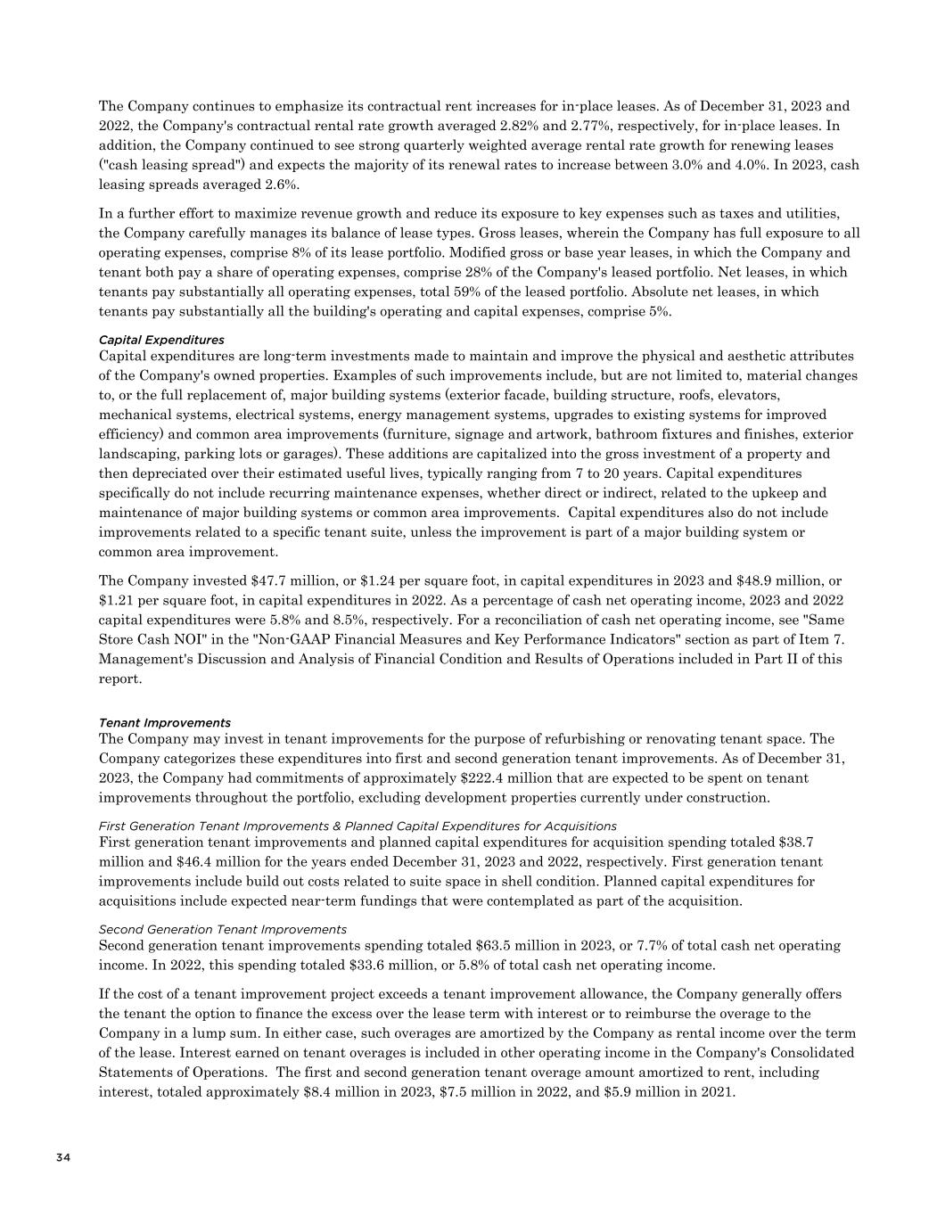 The Company continues to emphasize its contractual rent increases for in-place leases. As of December 31, 2023 and 2022, the Company's contractual rental rate growth averaged 2.82% and 2.77%, respectively, for in-place leases. In addition, the Company continued to see strong quarterly weighted average rental rate growth for renewing leases ("cash leasing spread") and expects the majority of its renewal rates to increase between 3.0% and 4.0%. In 2023, cash leasing spreads averaged 2.6%. In a further effort to maximize revenue growth and reduce its exposure to key expenses such as taxes and utilities, the Company carefully manages its balance of lease types. Gross leases, wherein the Company has full exposure to all operating expenses, comprise 8% of its lease portfolio. Modified gross or base year leases, in which the Company and tenant both pay a share of operating expenses, comprise 28% of the Company's leased portfolio. Net leases, in which tenants pay substantially all operating expenses, total 59% of the leased portfolio. Absolute net leases, in which tenants pay substantially all the building's operating and capital expenses, comprise 5%. Capital Expenditures Capital expenditures are long-term investments made to maintain and improve the physical and aesthetic attributes of the Company's owned properties. Examples of such improvements include, but are not limited to, material changes to, or the full replacement of, major building systems (exterior facade, building structure, roofs, elevators, mechanical systems, electrical systems, energy management systems, upgrades to existing systems for improved efficiency) and common area improvements (furniture, signage and artwork, bathroom fixtures and finishes, exterior landscaping, parking lots or garages). These additions are capitalized into the gross investment of a property and then depreciated over their estimated useful lives, typically ranging from 7 to 20 years. Capital expenditures specifically do not include recurring maintenance expenses, whether direct or indirect, related to the upkeep and maintenance of major building systems or common area improvements. Capital expenditures also do not include improvements related to a specific tenant suite, unless the improvement is part of a major building system or common area improvement. The Company invested $47.7 million, or $1.24 per square foot, in capital expenditures in 2023 and $48.9 million, or $1.21 per square foot, in capital expenditures in 2022. As a percentage of cash net operating income, 2023 and 2022 capital expenditures were 5.8% and 8.5%, respectively. For a reconciliation of cash net operating income, see "Same Store Cash NOI" in the "Non-GAAP Financial Measures and Key Performance Indicators" section as part of Item 7. Management's Discussion and Analysis of Financial Condition and Results of Operations included in Part II of this report. Tenant Improvements The Company may invest in tenant improvements for the purpose of refurbishing or renovating tenant space. The Company categorizes these expenditures into first and second generation tenant improvements. As of December 31, 2023, the Company had commitments of approximately $222.4 million that are expected to be spent on tenant improvements throughout the portfolio, excluding development properties currently under construction. First Generation Tenant Improvements & Planned Capital Expenditures for Acquisitions First generation tenant improvements and planned capital expenditures for acquisition spending totaled $38.7 million and $46.4 million for the years ended December 31, 2023 and 2022, respectively. First generation tenant improvements include build out costs related to suite space in shell condition. Planned capital expenditures for acquisitions include expected near-term fundings that were contemplated as part of the acquisition. Second Generation Tenant Improvements Second generation tenant improvements spending totaled $63.5 million in 2023, or 7.7% of total cash net operating income. In 2022, this spending totaled $33.6 million, or 5.8% of total cash net operating income. If the cost of a tenant improvement project exceeds a tenant improvement allowance, the Company generally offers the tenant the option to finance the excess over the lease term with interest or to reimburse the overage to the Company in a lump sum. In either case, such overages are amortized by the Company as rental income over the term of the lease. Interest earned on tenant overages is included in other operating income in the Company's Consolidated Statements of Operations. The first and second generation tenant overage amount amortized to rent, including interest, totaled approximately $8.4 million in 2023, $7.5 million in 2022, and $5.9 million in 2021. 34