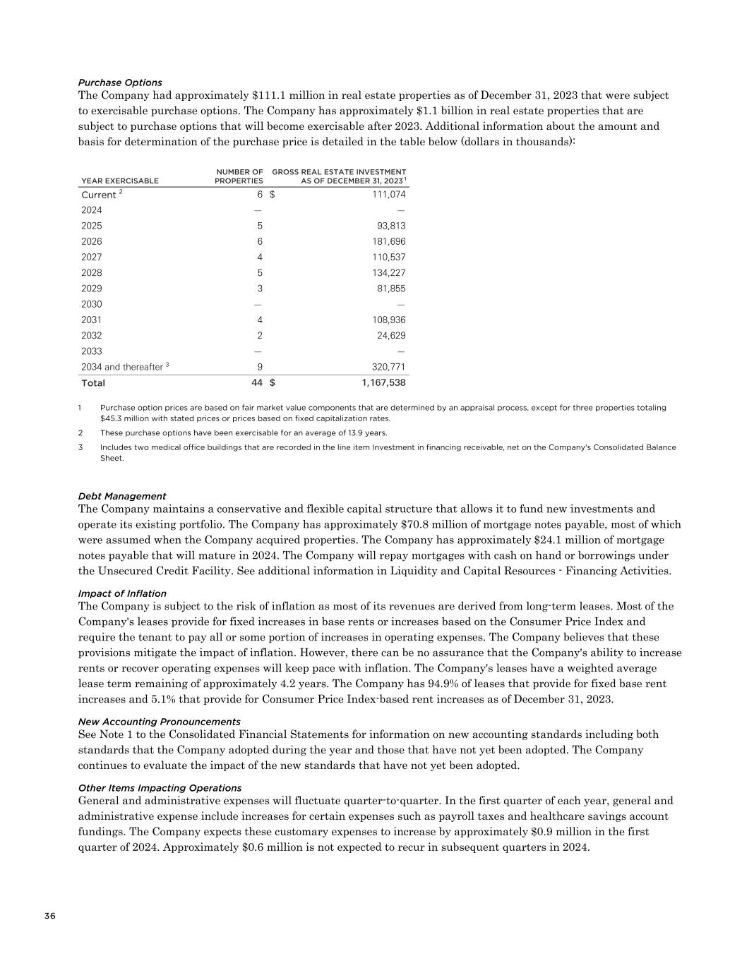 Purchase Options The Company had approximately $111.1 million in real estate properties as of December 31, 2023 that were subject to exercisable purchase options. The Company has approximately $1.1 billion in real estate properties that are subject to purchase options that will become exercisable after 2023. Additional information about the amount and basis for determination of the purchase price is detailed in the table below (dollars in thousands): YEAR EXERCISABLE NUMBER OF PROPERTIES GROSS REAL ESTATE INVESTMENT AS OF DECEMBER 31, 2023 1 Current 2 6 $ 111,074 2024 — — 2025 5 93,813 2026 6 181,696 2027 4 110,537 2028 5 134,227 2029 3 81,855 2030 — — 2031 4 108,936 2032 2 24,629 2033 — — 2034 and thereafter 3 9 320,771 Total 44 $ 1,167,538 1 Purchase option prices are based on fair market value components that are determined by an appraisal process, except for three properties totaling $45.3 million with stated prices or prices based on fixed capitalization rates. 2 These purchase options have been exercisable for an average of 13.9 years. 3 Includes two medical office buildings that are recorded in the line item Investment in financing receivable, net on the Company's Consolidated Balance Sheet. Debt Management The Company maintains a conservative and flexible capital structure that allows it to fund new investments and operate its existing portfolio. The Company has approximately $70.8 million of mortgage notes payable, most of which were assumed when the Company acquired properties. The Company has approximately $24.1 million of mortgage notes payable that will mature in 2024. The Company will repay mortgages with cash on hand or borrowings under the Unsecured Credit Facility. See additional information in Liquidity and Capital Resources - Financing Activities. Impact of Inflation The Company is subject to the risk of inflation as most of its revenues are derived from long-term leases. Most of the Company's leases provide for fixed increases in base rents or increases based on the Consumer Price Index and require the tenant to pay all or some portion of increases in operating expenses. The Company believes that these provisions mitigate the impact of inflation. However, there can be no assurance that the Company's ability to increase rents or recover operating expenses will keep pace with inflation. The Company's leases have a weighted average lease term remaining of approximately 4.2 years. The Company has 94.9% of leases that provide for fixed base rent increases and 5.1% that provide for Consumer Price Index-based rent increases as of December 31, 2023. New Accounting Pronouncements See Note 1 to the Consolidated Financial Statements for information on new accounting standards including both standards that the Company adopted during the year and those that have not yet been adopted. The Company continues to evaluate the impact of the new standards that have not yet been adopted. Other Items Impacting Operations General and administrative expenses will fluctuate quarter-to-quarter. In the first quarter of each year, general and administrative expense include increases for certain expenses such as payroll taxes and healthcare savings account fundings. The Company expects these customary expenses to increase by approximately $0.9 million in the first quarter of 2024. Approximately $0.6 million is not expected to recur in subsequent quarters in 2024. 36