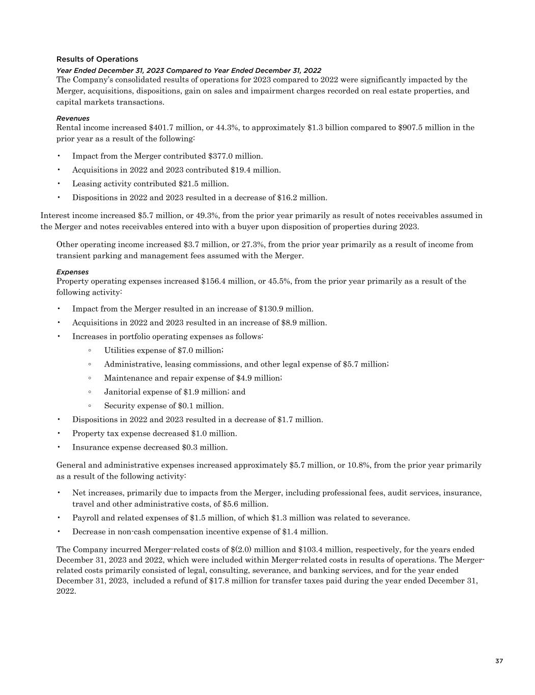 Purchase Options The Company had approximately $111.1 million in real estate properties as of December 31, 2023 that were subject to exercisable purchase options. The Company has approximately $1.1 billion in real estate properties that are subject to purchase options that will become exercisable after 2023. Additional information about the amount and basis for determination of the purchase price is detailed in the table below (dollars in thousands): YEAR EXERCISABLE NUMBER OF PROPERTIES GROSS REAL ESTATE INVESTMENT AS OF DECEMBER 31, 2023 1 Current 2 6 $ 111,074 2024 — — 2025 5 93,813 2026 6 181,696 2027 4 110,537 2028 5 134,227 2029 3 81,855 2030 — — 2031 4 108,936 2032 2 24,629 2033 — — 2034 and thereafter 3 9 320,771 Total 44 $ 1,167,538 1 Purchase option prices are based on fair market value components that are determined by an appraisal process, except for three properties totaling $45.3 million with stated prices or prices based on fixed capitalization rates. 2 These purchase options have been exercisable for an average of 13.9 years. 3 Includes two medical office buildings that are recorded in the line item Investment in financing receivable, net on the Company's Consolidated Balance Sheet. Debt Management The Company maintains a conservative and flexible capital structure that allows it to fund new investments and operate its existing portfolio. The Company has approximately $70.8 million of mortgage notes payable, most of which were assumed when the Company acquired properties. The Company has approximately $24.1 million of mortgage notes payable that will mature in 2024. The Company will repay mortgages with cash on hand or borrowings under the Unsecured Credit Facility. See additional information in Liquidity and Capital Resources - Financing Activities. Impact of Inflation The Company is subject to the risk of inflation as most of its revenues are derived from long-term leases. Most of the Company's leases provide for fixed increases in base rents or increases based on the Consumer Price Index and require the tenant to pay all or some portion of increases in operating expenses. The Company believes that these provisions mitigate the impact of inflation. However, there can be no assurance that the Company's ability to increase rents or recover operating expenses will keep pace with inflation. The Company's leases have a weighted average lease term remaining of approximately 4.2 years. The Company has 94.9% of leases that provide for fixed base rent increases and 5.1% that provide for Consumer Price Index-based rent increases as of December 31, 2023. New Accounting Pronouncements See Note 1 to the Consolidated Financial Statements for information on new accounting standards including both standards that the Company adopted during the year and those that have not yet been adopted. The Company continues to evaluate the impact of the new standards that have not yet been adopted. Other Items Impacting Operations General and administrative expenses will fluctuate quarter-to-quarter. In the first quarter of each year, general and administrative expense include increases for certain expenses such as payroll taxes and healthcare savings account fundings. The Company expects these customary expenses to increase by approximately $0.9 million in the first quarter of 2024. Approximately $0.6 million is not expected to recur in subsequent quarters in 2024. Results of Operations Year Ended December 31, 2023 Compared to Year Ended December 31, 2022 The Company’s consolidated results of operations for 2023 compared to 2022 were significantly impacted by the Merger, acquisitions, dispositions, gain on sales and impairment charges recorded on real estate properties, and capital markets transactions. Revenues Rental income increased $401.7 million, or 44.3%, to approximately $1.3 billion compared to $907.5 million in the prior year as a result of the following: • Impact from the Merger contributed $377.0 million. • Acquisitions in 2022 and 2023 contributed $19.4 million. • Leasing activity contributed $21.5 million. • Dispositions in 2022 and 2023 resulted in a decrease of $16.2 million. Interest income increased $5.7 million, or 49.3%, from the prior year primarily as result of notes receivables assumed in the Merger and notes receivables entered into with a buyer upon disposition of properties during 2023. Other operating income increased $3.7 million, or 27.3%, from the prior year primarily as a result of income from transient parking and management fees assumed with the Merger. Expenses Property operating expenses increased $156.4 million, or 45.5%, from the prior year primarily as a result of the following activity: • Impact from the Merger resulted in an increase of $130.9 million. • Acquisitions in 2022 and 2023 resulted in an increase of $8.9 million. • Increases in portfolio operating expenses as follows: ◦ Utilities expense of $7.0 million; ◦ Administrative, leasing commissions, and other legal expense of $5.7 million; ◦ Maintenance and repair expense of $4.9 million; ◦ Janitorial expense of $1.9 million; and ◦ Security expense of $0.1 million. • Dispositions in 2022 and 2023 resulted in a decrease of $1.7 million. • Property tax expense decreased $1.0 million. • Insurance expense decreased $0.3 million. General and administrative expenses increased approximately $5.7 million, or 10.8%, from the prior year primarily as a result of the following activity: • Net increases, primarily due to impacts from the Merger, including professional fees, audit services, insurance, travel and other administrative costs, of $5.6 million. • Payroll and related expenses of $1.5 million, of which $1.3 million was related to severance. • Decrease in non-cash compensation incentive expense of $1.4 million. The Company incurred Merger-related costs of $(2.0) million and $103.4 million, respectively, for the years ended December 31, 2023 and 2022, which were 