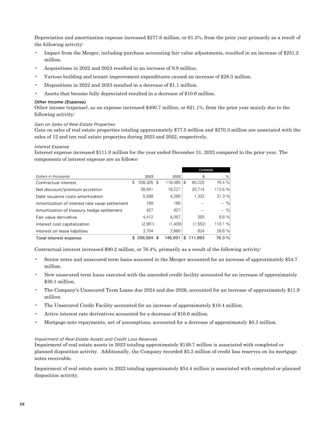 Depreciation and amortization expense increased $277.6 million, or 61.3%, from the prior year primarily as a result of the following activity: • Impact from the Merger, including purchase accounting fair value adjustments, resulted in an increase of $251.2 million. • Acquisitions in 2022 and 2023 resulted in an increase of 9.8 million. • Various building and tenant improvement expenditures caused an increase of $28.3 million. • Dispositions in 2022 and 2023 resulted in a decrease of $1.1 million. • Assets that became fully depreciated resulted in a decrease of $10.6 million. Other Income (Expense) Other income (expense), as an expense increased $400.7 million, or 621.1%, from the prior year mainly due to the following activity: Gain on Sales of Real Estate Properties Gain on sales of real estate properties totaling approximately $77.5 million and $270.3 million are associated with the sales of 12 and ten real estate properties during 2023 and 2022, respectively. Interest Expense Interest expense increased $111.9 million for the year ended December 31, 2023 compared to the prior year. The components of interest expense are as follows: CHANGE Dollars in thousands 2023 2022 $ % Contractual interest $ 208,305 $ 118,085 $ 90,220 76.4 % Net discount/premium accretion 38,941 18,227 20,714 113.6 % Debt issuance costs amortization 5,588 4,256 1,332 31.3 % Amortization of interest rate swap settlement 168 168 — — % Amortization of treasury hedge settlement 427 427 — — % Fair value derivative 4,412 4,057 355 8.8 % Interest cost capitalization (2,961) (1,409) (1,552) 110.1 % Interest on lease liabilities 3,704 2,880 824 28.6 % Total interest expense $ 258,584 $ 146,691 $ 111,893 76.3 % Contractual interest increased $90.2 million, or 76.4%, primarily as a result of the following activity: • Senior notes and unsecured term loans assumed in the Merger accounted for an increase of approximately $54.7 million. • New unsecured term loans executed with the amended credit facility accounted for an increase of approximately $30.1 million. • The Company's Unsecured Term Loans due 2024 and due 2026, accounted for an increase of approximately $11.9 million. • The Unsecured Credit Facility accounted for an increase of approximately $10.4 million. • Active interest rate derivatives accounted for a decrease of $16.6 million. • Mortgage note repayments, net of assumptions, accounted for a decrease of approximately $0.3 million. Impairment of Real Estate Assets and Credit Loss Reserves Impairment of real estate assets in 2023 totaling approximately $149.7 million is associated with completed or planned disposition activity. Additionally, the Company recorded $5.2 million of credit loss reserves on its mortgage notes receivable. Impairment of real estate assets in 2022 totaling approximately $54.4 million is associated with completed or planned disposition activity. 38