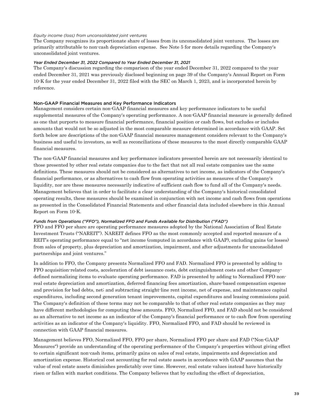 Depreciation and amortization expense increased $277.6 million, or 61.3%, from the prior year primarily as a result of the following activity: • Impact from the Merger, including purchase accounting fair value adjustments, resulted in an increase of $251.2 million. • Acquisitions in 2022 and 2023 resulted in an increase of 9.8 million. • Various building and tenant improvement expenditures caused an increase of $28.3 million. • Dispositions in 2022 and 2023 resulted in a decrease of $1.1 million. • Assets that became fully depreciated resulted in a decrease of $10.6 million. Other Income (Expense) Other income (expense), as an expense increased $400.7 million, or 621.1%, from the prior year mainly due to the following activity: Gain on Sales of Real Estate Properties Gain on sales of real estate properties totaling approximately $77.5 million and $270.3 million are associated with the sales of 12 and ten real estate properties during 2023 and 2022, respectively. Interest Expense Interest expense increased $111.9 million for the year ended December 31, 2023 compared to the prior year. The components of interest expense are as follows: CHANGE Dollars in thousands 2023 2022 $ % Contractual interest $ 208,305 $ 118,085 $ 90,220 76.4 % Net discount/premium accretion 38,941 18,227 20,714 113.6 % Debt issuance costs amortization 5,588 4,256 1,332 31.3 % Amortization of interest rate swap settlement 168 168 — — % Amortization of treasury hedge settlement 427 427 — — % Fair value derivative 4,412 4,057 355 8.8 % Interest cost capitalization (2,961) (1,409) (1,552) 110.1 % Interest on lease liabilities 3,704 2,880 824 28.6 % Total interest expense $ 258,584 $ 146,691 $ 111,893 76.3 % Contractual interest increased $90.2 million, or 76.4%, primarily as a result of the following activity: • Senior notes and unsecured term loans assumed in the Merger accounted for an increase of approximately $54.7 million. • New unsecured term loans executed with the amended credit facility accounted for an increase of approximately $30.1 million. • The Company's Unsecured Term Loans due 2024 and due 2026, accounted for an increase of approximately $11.9 million. • The Unsecured Credit Facility accounted for an increase of approximately $10.4 million. • Active interest rate derivatives accounted for a decrease of $16.6 million. • Mortgage note repayments, net of assumptions, accounted for a decrease of approximately $0.3 million. Impairment of Real Estate Assets and Credit Loss Reserves Impairment of real estate assets in 2023 totaling approximately $149.7 million is associated with completed or planned disposition activity. Additionally, the Company recorded $5.2 million of credit loss reserves on its mortgage notes receivable. Impairment of real estate assets in 2022 totaling approximately $54.4 million is associated with completed or planned disposition activity. Equity income (loss) from unconsolidated joint ventures The Company recognizes its proportionate share of losses from its unconsolidated joint ventures. The losses are primarily attributable to non-cash depreciation expense. See Note 5 for more details regarding the Company's unconsolidated joint ventures. Year Ended December 31, 2022 Compared to Year Ended December 31, 2021 The Company's discussion regarding the comparison of the year ended December 31, 2022 compared to the year ended December 31, 2021 was previously disclosed beginning on page 39 of the Company's Annual Report on Form 10-K for the year ended December 31, 2022 filed with the SEC on March 1, 2023, and is incorporated herein by reference. Non-GAAP Financial Measures and Key Performance Indicators Management considers certain non-GAAP financial measures and key performance indicators to be useful supplemental measures of the Company's operating performance. A non-GAAP financial measure is generally defined as one that purports to measure financial performance, financial position or cash flows, but excludes or includes amounts that would not be so adjusted in the most comparable measure determined in accordance with GAAP. Set forth below are descriptions of the non-GAAP financial measures management considers relevant to the Company's business and useful to investors, as well as reconciliations of these measures to the most directly comparable GAAP financial measures. The non-GAAP financial measures and key performance indicators presented herein are not necessarily identical to those presented by other real estate companies due to the fact that not all real estate companies use the same definitions. These measures should not be considered as alternatives to net income, as indicators of the Company's financial performance, or as alternatives to cash flow from operating activities as measures of the Company's liquidity, nor are these measures necessarily indicative of sufficient cash flow to fund all of the Company's needs. Management believes that in order to facilitate a clear understanding of the Company's historical consolidated operating results, these measures should be examined in conjunction with net income and cash flows from operations as presented in the Consolidated Financial Statements and other financial data included elsewhere in this Annual Report on Form 10-K. Funds from Operations ("FFO"), Normalized FFO and Funds Available for Distribution ("FAD") FFO and FFO per share are operating performance measures adopted by the National Association of Real Estate Investment Trusts (“NAREIT”). NAREIT defines FFO as the most commonly accepted and reported measure of a REIT’s operating performance equal to “net income (computed in accordance with GAAP), excluding gains (or losses) from sales of property, plus depreciation and amortization, impairment, and after adjustments for unconsolidated partnerships and joint ventures.” In addition to FFO, the Company presents Normalized FFO and FAD. Normalized FFO is presented by adding to FFO acquisition-r