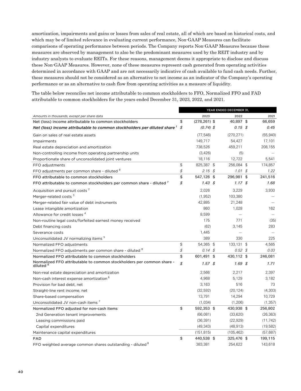 amortization, impairments and gains or losses from sales of real estate, all of which are based on historical costs, and which may be of limited relevance in evaluating current performance, Non-GAAP Measures can facilitate comparisons of operating performance between periods. The Company reports Non-GAAP Measures because these measures are observed by management to also be the predominant measures used by the REIT industry and by industry analysts to evaluate REITs. For these reasons, management deems it appropriate to disclose and discuss these Non-GAAP Measures. However, none of these measures represent cash generated from operating activities determined in accordance with GAAP and are not necessarily indicative of cash available to fund cash needs. Further, these measures should not be considered as an alternative to net income as an indicator of the Company’s operating performance or as an alternative to cash flow from operating activities as a measure of liquidity. The table below reconciles net income attributable to common stockholders to FFO, Normalized FFO and FAD attributable to common stockholders for the years ended December 31, 2023, 2022, and 2021. YEAR ENDED DECEMBER 31, Amounts in thousands, except per share data 2023 2022 2021 Net (loss) income attributable to common stockholders $ (278,261) $ 40,897 $ 66,659 Net (loss) income attributable to common stockholders per diluted share 1 $ (0.74) $ 0.15 $ 0.45 Gain on sales of real estate assets (77,546) (270,271) (55,940) Impairments 149,717 54,427 17,101 Real estate depreciation and amortization 738,526 459,211 208,155 Non-controlling income from operating partnership units (3,426) (5) — Proportionate share of unconsolidated joint ventures 18,116 12,722 5,541 FFO adjustments $ 825,387 $ 256,084 $ 174,857 FFO adjustments per common share - diluted 8 $ 2.15 $ 1.01 $ 1.22 FFO attributable to common stockholders $ 547,126 $ 296,981 $ 241,516 FFO attributable to common stockholders per common share - diluted 7 $ 1.43 $ 1.17 $ 1.68 Acquisition and pursuit costs 2 2,026 3,229 3,930 Merger-related costs 3 (1,952) 103,380 — Merger-related fair value of debt instruments 42,885 21,248 — Lease intangible amortization 860 1,028 162 Allowance for credit losses 4 8,599 — — Non-routine legal costs/forfeited earnest money received 175 771 (35) Debt financing costs (62) 3,145 283 Severance costs 1,445 — — Unconsolidated JV normalizing items 5 389 330 225 Normalized FFO adjustments $ 54,365 $ 133,131 $ 4,565 Normalized FFO adjustments per common share - diluted 8 $ 0.14 $ 0.52 $ 0.03 Normalized FFO attributable to common stockholders $ 601,491 $ 430,112 $ 246,081 Normalized FFO attributable to common stockholders per common share - diluted 8 $ 1.57 $ 1.69 $ 1.71 Non-real estate depreciation and amortization 2,566 2,217 2,397 Non-cash interest expense amortization 6 4,968 5,129 3,182 Provision for bad debt, net 3,163 516 73 Straight-line rent income, net (32,592) (20,124) (4,303) Share-based compensation 13,791 14,294 10,729 Unconsolidated JV non-cash items 7 (1,034) (1,206) (1,357) Normalized FFO adjusted for non-cash items $ 592,353 $ 430,938 $ 256,802 2nd Generation tenant improvements (66,081) (33,620) (26,363) Leasing commissions paid (36,391) (22,929) (11,742) Capital expenditures (49,343) (48,913) (19,582) Maintenance capital expenditures (151,815) (105,462) (57,687) FAD $ 440,538 $ 325,476 $ 199,115 FFO weighted average common shares outstanding - diluted 8 383,381 254,622 143,618 40