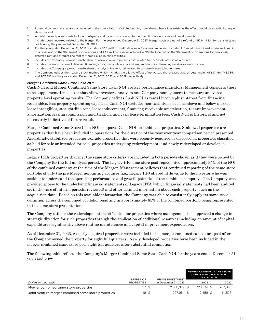 The following tables reconcile net income to Merger Combined Same Store NOI and the merger combined same store property metrics to the total owned real estate portfolio for the years ended December 31, 2023 and 2022: Reconciliations of Legacy HR and Merger Combined Same Store Cash NOI YEAR ENDED DECEMBER 31, Dollars in thousands 2023 2022 Net (loss) income attributable to common stockholders $ (278,261) $ 40,897 Other expense (income) 336,227 (64,519) General and administrative expense 58,405 52,734 Depreciation and amortization expense 730,709 453,082 Other expenses 1 12,653 120,576 Straight-line rent revenue, net (32,592) (23,498) Joint venture properties 19,176 15,222 Other revenue 2 (20,311) (16,577) 826,006 577,917 Pre-Merger Legacy HTA NOI — 280,421 Cash NOI 826,006 858,338 Cash NOI not included in same store (87,282) (139,430) Merger combined same store cash NOI, including joint ventures 738,724 718,908 Same store joint venture properties (12,150) (11,523) Wholly-owned merger combined same store cash NOI $ 726,574 $ 707,385 MERGER COMBINED SAME STORE RECONCILIATION 1 Includes acquisition and pursuit costs, Merger-related costs, rent reserves, above and below market ground lease intangible amortization, leasing commission amortization and ground lease straight-line rent expense. 2 Includes management fee income, interest, above and below market lease intangible amortization, lease inducement amortization, lease terminations and tenant improvement overage amortization. YEAR ENDED DECEMBER 31, Dollars in thousands 2023 2022 Net (loss) income attributable to common stockholders $ (278,261) $ 40,897 Other expense (income) 336,227 (64,519) General and administrative expense 58,405 52,734 Depreciation and amortization expense 730,709 453,082 Other expenses 1 12,653 120,576 Straight-line rent revenue, net (32,592) (23,498) Joint venture properties 19,176 15,222 Other revenue 2 (20,311) (16,577) 826,006 577,917 Cash NOI not included in same store (482,779) (250,066) Legacy HR same store cash NOI, including joint ventures 343,227 327,851 Legacy HR same store joint venture properties (7,745) (7,275) Legacy HR same store cash NOI 3 $ 335,482 $ 320,576 LEGACY HR SAME STORE RECONCILIATION 1 Includes acquisition and pursuit costs, Merger-related costs, rent reserves, above and below market ground lease intangible amortization, leasing commission amortization and ground lease straight-line rent expense. 2 Includes management fee income, interest, above and below market lease intangible amortization, lease inducement amortization, lease terminations and tenant improvement overage amortization. 3 Legacy HR same store cash NOI includes 240 properties. 42