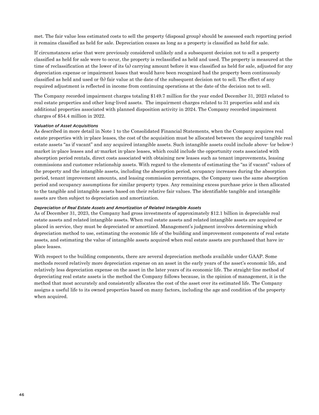met. The fair value less estimated costs to sell the property (disposal group) should be assessed each reporting period it remains classified as held for sale. Depreciation ceases as long as a property is classified as held for sale. If circumstances arise that were previously considered unlikely and a subsequent decision not to sell a property classified as held for sale were to occur, the property is reclassified as held and used. The property is measured at the time of reclassification at the lower of its (a) carrying amount before it was classified as held for sale, adjusted for any depreciation expense or impairment losses that would have been recognized had the property been continuously classified as held and used or (b) fair value at the date of the subsequent decision not to sell. The effect of any required adjustment is reflected in income from continuing operations at the date of the decision not to sell. The Company recorded impairment charges totaling $149.7 million for the year ended December 31, 2023 related to real estate properties and other long-lived assets. The impairment charges related to 31 properties sold and six additional properties associated with planned disposition activity in 2024. The Company recorded impairment charges of $54.4 million in 2022. Valuation of Asset Acquisitions As described in more detail in Note 1 to the Consolidated Financial Statements, when the Company acquires real estate properties with in-place leases, the cost of the acquisition must be allocated between the acquired tangible real estate assets “as if vacant” and any acquired intangible assets. Such intangible assets could include above- (or below-) market in-place leases and at-market in-place leases, which could include the opportunity costs associated with absorption period rentals, direct costs associated with obtaining new leases such as tenant improvements, leasing commissions and customer relationship assets. With regard to the elements of estimating the “as if vacant” values of the property and the intangible assets, including the absorption period, occupancy increases during the absorption period, tenant improvement amounts, and leasing commission percentages, the Company uses the same absorption period and occupancy assumptions for similar property types. Any remaining excess purchase price is then allocated to the tangible and intangible assets based on their relative fair values. The identifiable tangible and intangible assets are then subject to depreciation and amortization. Depreciation of Real Estate Assets and Amortization of Related Intangible Assets As of December 31, 2023, the Company had gross investments of approximately $12.1 billion in depreciable real estate assets and related intangible assets. When real estate assets and related intangible assets are acquired or placed in service, they must be depreciated or amortized. Management’s judgment involves determining which depreciation method to use, estimating the economic life of the building and improvement components of real estate assets, and estimating the value of intangible assets acquired when real estate assets are purchased that have in- place leases. With respect to the building components, there are several depreciation methods available under GAAP. Some methods record relatively more depreciation expense on an asset in the early years of the asset’s economic life, and relatively less depreciation expense on the asset in the later years of its economic life. The straight-line method of depreciating real estate assets is the method the Company follows because, in the opinion of management, it is the method that most accurately and consistently allocates the cost of the asset over its estimated life. The Company assigns a useful life to its owned properties based on many factors, including the age and condition of the property when acquired. 46