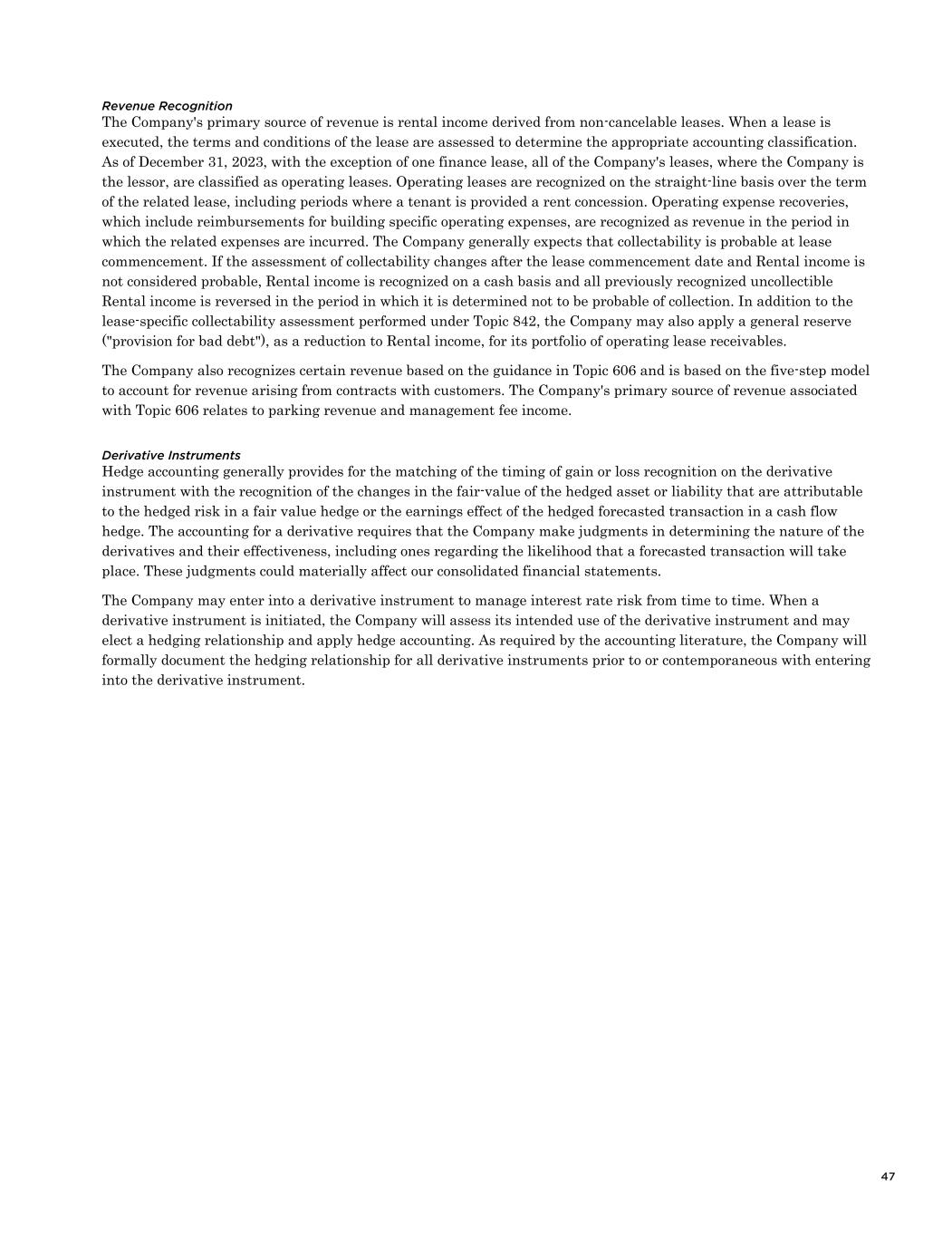 met. The fair value less estimated costs to sell the property (disposal group) should be assessed each reporting period it remains classified as held for sale. Depreciation ceases as long as a property is classified as held for sale. If circumstances arise that were previously considered unlikely and a subsequent decision not to sell a property classified as held for sale were to occur, the property is reclassified as held and used. The property is measured at the time of reclassification at the lower of its (a) carrying amount before it was classified as held for sale, adjusted for any depreciation expense or impairment losses that would have been recognized had the property been continuously classified as held and used or (b) fair value at the date of the subsequent decision not to sell. The effect of any required adjustment is reflected in income from continuing operations at the date of the decision not to sell. The Company recorded impairment charges totaling $149.7 million for the year ended December 31, 2023 related to real estate properties and other long-lived assets. The impairment charges related to 31 properties sold and six additional properties associated with planned disposition activity in 2024. The Company recorded impairment charges of $54.4 million in 2022. Valuation of Asset Acquisitions As described in more detail in Note 1 to the Consolidated Financial Statements, when the Company acquires real estate properties with in-place leases, the cost of the acquisition must be allocated between the acquired tangible real estate assets “as if vacant” and any acquired intangible assets. Such intangible assets could include above- (or below-) market in-place leases and at-market in-place leases, which could include the opportunity costs associated with absorption period rentals, direct costs associated with obtaining new leases such as tenant improvements, leasing commissions and customer relationship assets. With regard to the elements of estimating the “as if vacant” values of the property and the intangible assets, including the absorption period, occupancy increases during the absorption period, tenant improvement amounts, and leasing commission percentages, the Company uses the same absorption period and occupancy assumptions for similar property types. Any remaining excess purchase price is then allocated to the tangible and intangible assets based on their relative fair values. The identifiable tangible and intangible assets are then subject to depreciation and amortization. Depreciation of Real Estate Assets and Amortization of Related Intangible Assets As of December 31, 2023, the Company had gross investments of approximately $12.1 billion in depreciable real estate assets and related intangible assets. When real estate assets and related intangible assets are acquired or placed in service, they must be depreciated or amortized. Management’s judgment involves determining which depreciation method to use, estimating the economic life of the building and improvement components of real estate assets, and estimating the value of intangible assets acquired when real estate assets are purchased that have in- place leases. With respect to the building components, there are several depreciation methods available under GAAP. Some methods record relatively more depreciation expense on an asset in the early years of the asset’s economic life, and relatively less depreciation expense on the asset in the later years of its economic life. The straight-line method of depreciating real estate assets is the method the Company follows because, in the opinion of management, it is the method that most accurately and consistently allocates the cost of the asset over its estimated life. The Company assigns a useful life to its owned properties based on many factors, including the age and condition of the property when acquired. Revenue Recognition The Company's primary source of revenue is rental income derived from non-cancelable leases. When a lease is executed, the terms and conditions of the lease are assessed to determine the appropriate accounting classification. As of December 31, 2023, with the exception of one finance lease, all of the Company's leases, where the Company is the lessor, are classified as operating leases. Operating leases are recognized on the straight-line basis over the term of the related lease, including periods where a tenant is provided a rent concession. Operating expense recoveries, which include reimbursements for building specific operating expenses, are recognized as revenue in the period in which the related expenses are incurred. The Company generally expects that collectability is probable at lease commencement. If the assessment of collectability changes after the lease commencement date and Rental income is not considered probable, Rental income is recognized on a cash basis and all previously recognized uncollectible Rental income is reversed in the period in which it is determined not to be probable of collection. In addition to the lease-specific collectability assessment performed under Topic 842, the Company may also apply a general reserve ("provision for bad debt"), as a reduction to Rental income, for its portfolio of operating lease receivables. The Company also recognizes certain revenue based on the guidance in Topic 606 and is based on the five-step model to account for revenue arising from contracts with customers. The Company's primary source of revenue associated with Topic 606 relates to parking revenue and management fee income. Derivative Instruments Hedge accounting generally provides for the matching of the timing of gain or loss recognition on the derivative instrument with the recognition of the changes in the fair-value of the hedged asset or liability that are attributable to the hedged risk in a fair value hedge or the earnings effect of the hedged forecasted transaction in a cash flow hedge. The accounting for 
