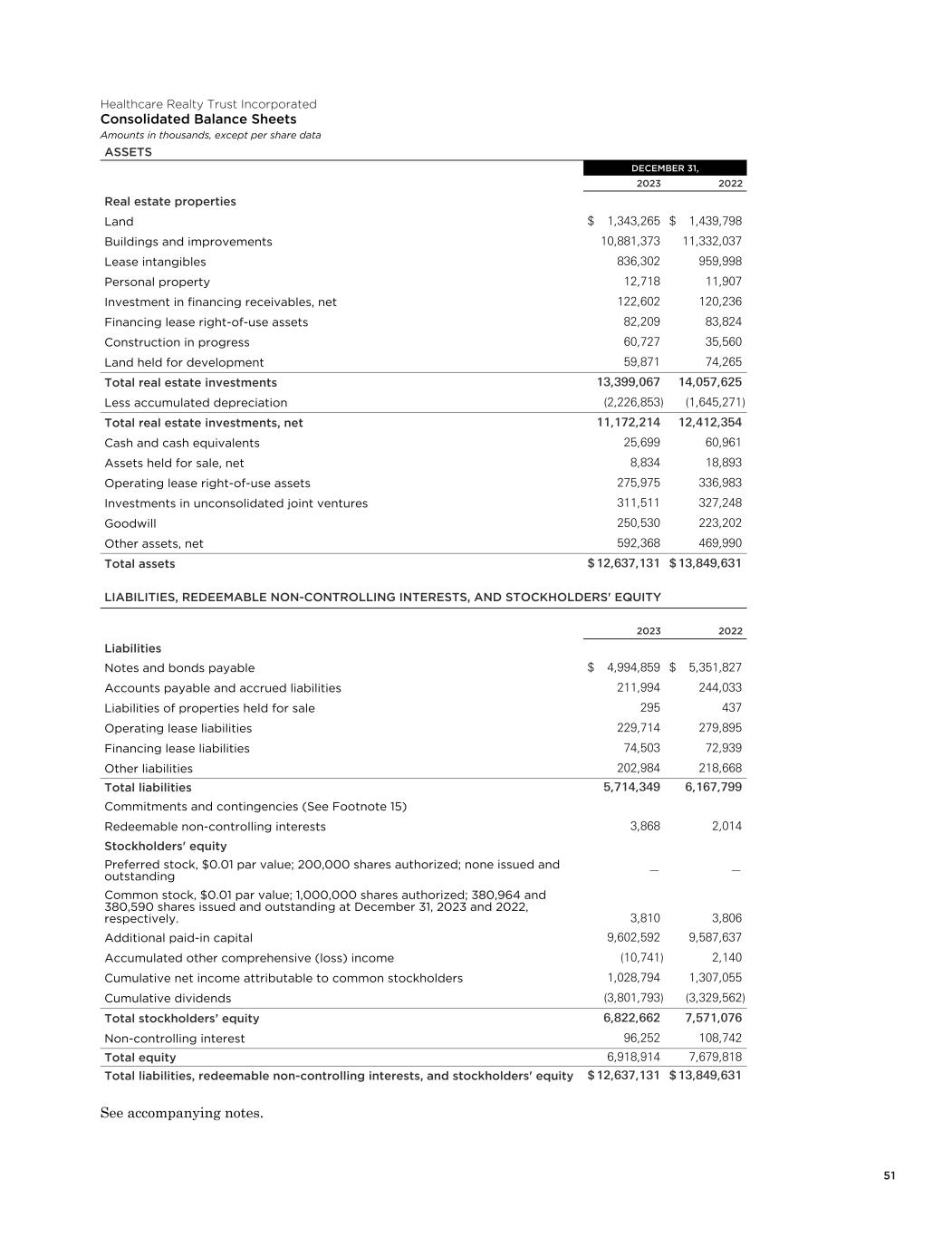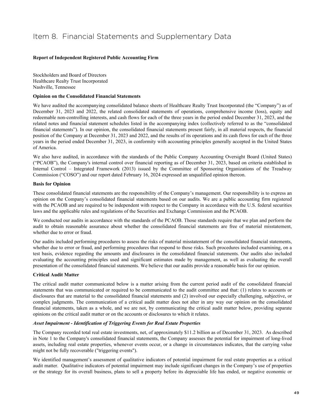 industry trends for the Company or its tenants. Auditing these elements involved especially challenging auditor judgment due to the nature and extent of audit effort required to address these matters. The primary procedures we performed to address this critical audit matter included: • Testing the design and operating effectiveness of controls over management’s identification of changes in circumstances that could indicate the carrying amounts of real estate properties may not be fully recoverable. • Assessing the reasonableness of management’s key assumptions with respect to qualitative factors, including potential sales of properties based on offers received and changes in the use of the Company’s properties, used to determine whether triggering events had occurred. • Examining internal documentation to assess whether additional triggering events were present. /s/ BDO USA, P.C. We have served as the Company's auditor since 2005. Nashville, Tennessee February 16, 2024 Healthcare Realty Trust Incorporated Consolidated Balance Sheets Amounts in thousands, except per share data ASSETS DECEMBER 31, 2023 2022 Real estate properties Land $ 1,343,265 $ 1,439,798 Buildings and improvements 10,881,373 11,332,037 Lease intangibles 836,302 959,998 Personal property 12,718 11,907 Investment in financing receivables, net 122,602 120,236 Financing lease right-of-use assets 82,209 83,824 Construction in progress 60,727 35,560 Land held for development 59,871 74,265 Total real estate investments 13,399,067 14,057,625 Less accumulated depreciation (2,226,853) (1,645,271) Total real estate investments, net 11,172,214 12,412,354 Cash and cash equivalents 25,699 60,961 Assets held for sale, net 8,834 18,893 Operating lease right-of-use assets 275,975 336,983 Investments in unconsolidated joint ventures 311,511 327,248 Goodwill 250,530 223,202 Other assets, net 592,368 469,990 Total assets $ 12,637,131 $ 13,849,631 LIABILITIES, REDEEMABLE NON-CONTROLLING INTERESTS, AND STOCKHOLDERS' EQUITY DECEMBER 31, 2023 2022 Liabilities Notes and bonds payable $ 4,994,859 $ 5,351,827 Accounts payable and accrued liabilities 211,994 244,033 Liabilities of properties held for sale 295 437 Operating lease liabilities 229,714 279,895 Financing lease liabilities 74,503 72,939 Other liabilities 202,984 218,668 Total liabilities 5,714,349 6,167,799 Commitments and contingencies (See Footnote 15) Redeemable non-controlling interests 3,868 2,014 Stockholders' equity Preferred stock, $0.01 par value; 200,000 shares authorized; none issued and outstanding — — Common stock, $0.01 par value; 1,000,000 shares authorized; 380,964 and 380,590 shares issued and outstanding at December 31, 2023 and 2022, respectively. 3,810 3,806 Additional paid-in capital 9,602,592 9,587,637 Accumulated other comprehensive (loss) income (10,741) 2,140 Cumulative net income attributable to common stockholders 1,028,794 1,307,055 Cumulative dividends (3,801,793) (3,329,562) Total stockholders’ equity 6,822,662 7,571,076 Non-controlling interest 96,252 108,742 Total equity 6,918,914 7,679,818 Total liabilities, redeemable non-controlling interests, and stockholders' equity $ 12,637,131 $ 13,849,631 See accompanying notes. 51