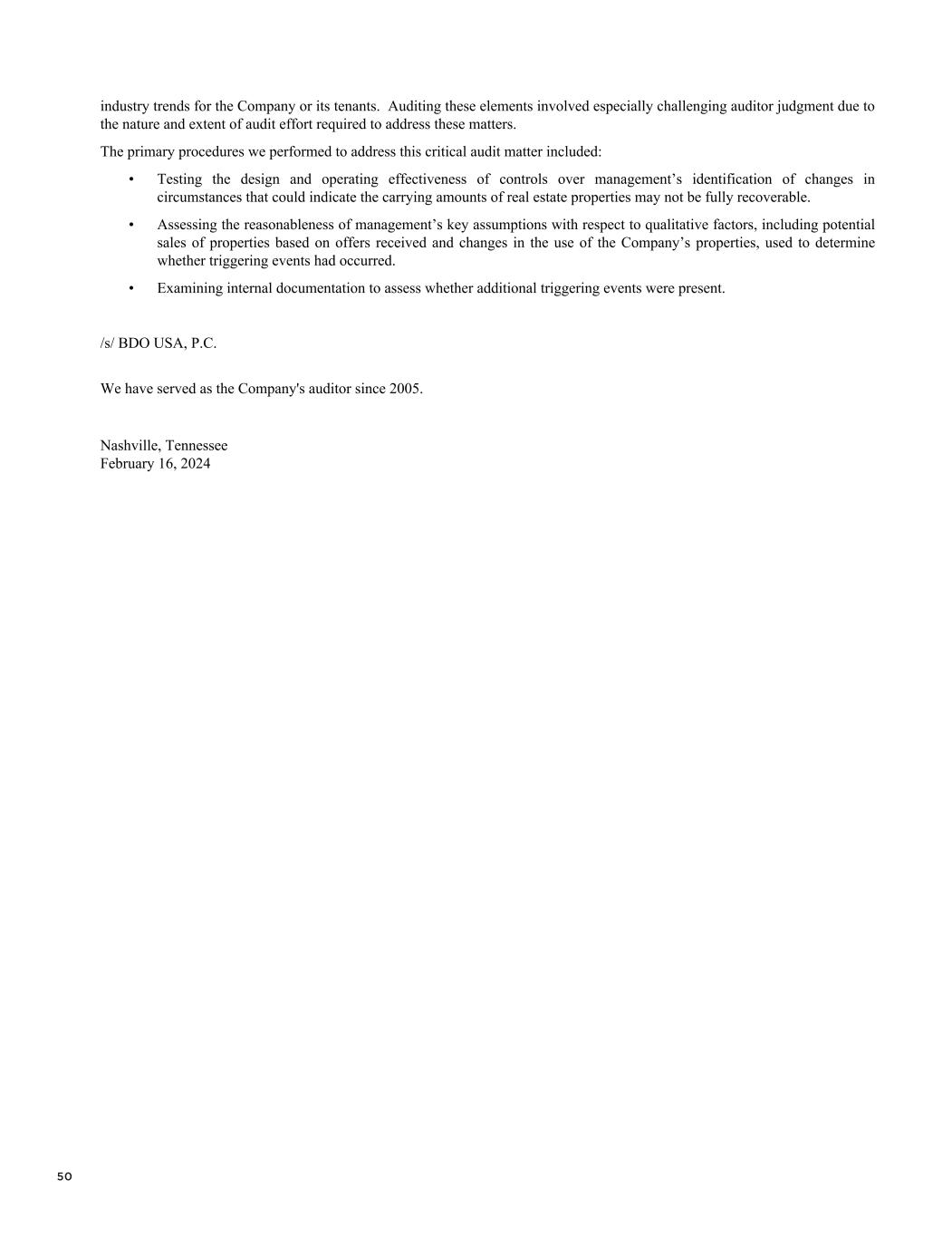 industry trends for the Company or its tenants. Auditing these elements involved especially challenging auditor judgment due to the nature and extent of audit effort required to address these matters. The primary procedures we performed to address this critical audit matter included: • Testing the design and operating effectiveness of controls over management’s identification of changes in circumstances that could indicate the carrying amounts of real estate properties may not be fully recoverable. • Assessing the reasonableness of management’s key assumptions with respect to qualitative factors, including potential sales of properties based on offers received and changes in the use of the Company’s properties, used to determine whether triggering events had occurred. • Examining internal documentation to assess whether additional triggering events were present. /s/ BDO USA, P.C. We have served as the Company's auditor since 2005. Nashville, Tennessee February 16, 2024 50
