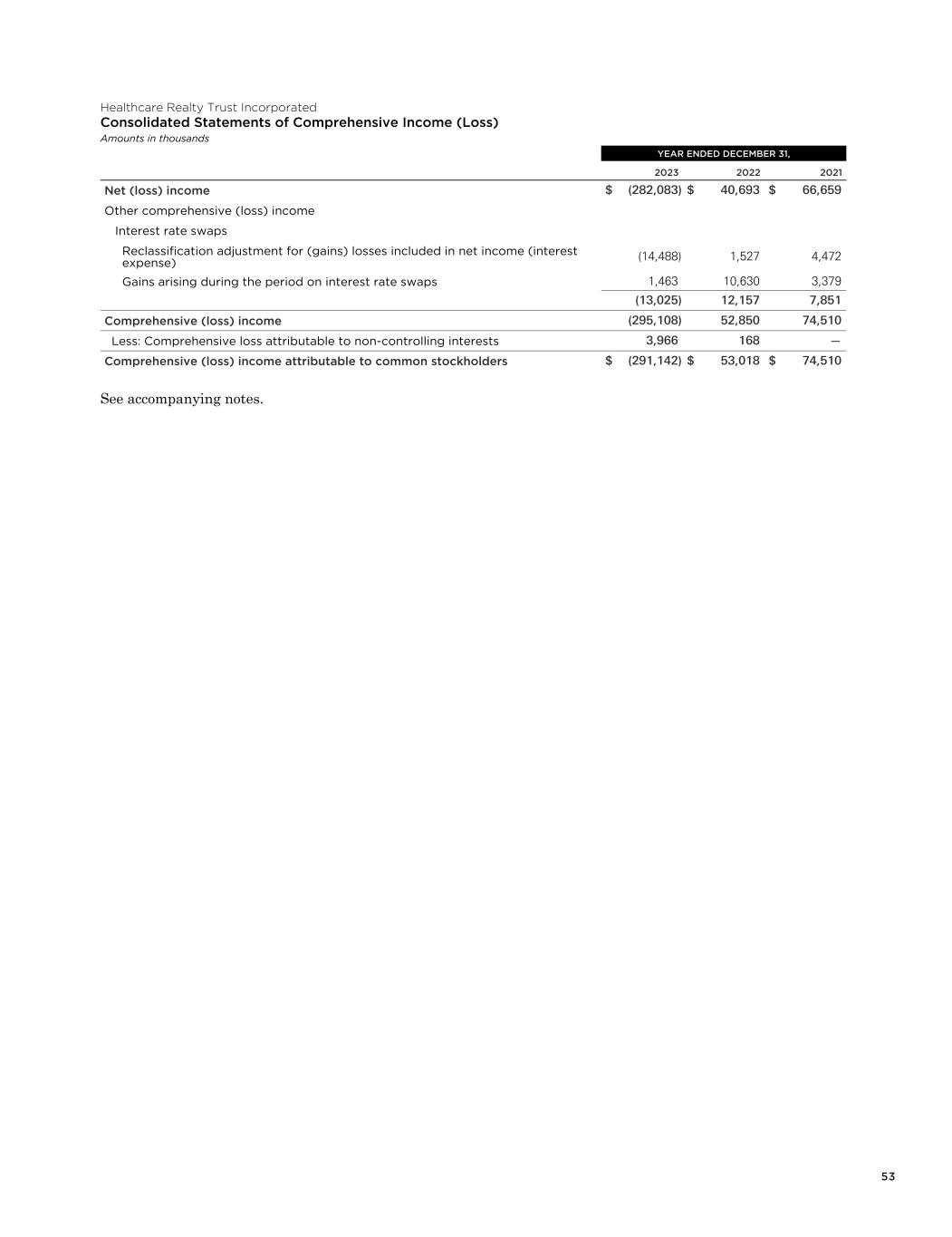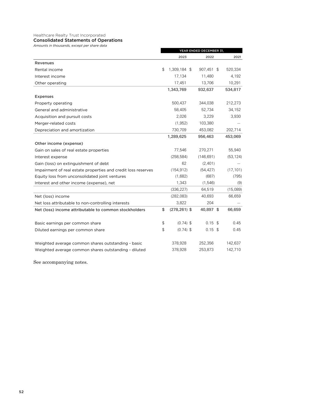 Healthcare Realty Trust Incorporated Consolidated Statements of Operations Amounts in thousands, except per share data YEAR ENDED DECEMBER 31, 2023 2022 2021 Revenues Rental income $ 1,309,184 $ 907,451 $ 520,334 Interest income 17,134 11,480 4,192 Other operating 17,451 13,706 10,291 1,343,769 932,637 534,817 Expenses Property operating 500,437 344,038 212,273 General and administrative 58,405 52,734 34,152 Acquisition and pursuit costs 2,026 3,229 3,930 Merger-related costs (1,952) 103,380 — Depreciation and amortization 730,709 453,082 202,714 1,289,625 956,463 453,069 Other income (expense) Gain on sales of real estate properties 77,546 270,271 55,940 Interest expense (258,584) (146,691) (53,124) Gain (loss) on extinguishment of debt 62 (2,401) — Impairment of real estate properties and credit loss reserves (154,912) (54,427) (17,101) Equity loss from unconsolidated joint ventures (1,682) (687) (795) Interest and other income (expense), net 1,343 (1,546) (9) (336,227) 64,519 (15,089) Net (loss) income (282,083) 40,693 66,659 Net loss attributable to non-controlling interests 3,822 204 — Net (loss) income attributable to common stockholders $ (278,261) $ 40,897 $ 66,659 Basic earnings per common share $ (0.74) $ 0.15 $ 0.45 Diluted earnings per common share $ (0.74) $ 0.15 $ 0.45 Weighted average common shares outstanding - basic 378,928 252,356 142,637 Weighted average common shares outstanding - diluted 378,928 253,873 142,710 See accompanying notes. Healthcare Realty Trust Incorporated Consolidated Statements of Comprehensive Income (Loss) Amounts in thousands YEAR ENDED DECEMBER 31, 2023 2022 2021 Net (loss) income $ (282,083) $ 40,693 $ 66,659 Other comprehensive (loss) income Interest rate swaps Reclassification adjustment for (gains) losses included in net income (interest expense) (14,488) 1,527 4,472 Gains arising during the period on interest rate swaps 1,463 10,630 3,379 (13,025) 12,157 7,851 Comprehensive (loss) income (295,108) 52,850 74,510 Less: Comprehensive loss attributable to non-controlling interests 3,966 168 — Comprehensive (loss) income attributable to common stockholders $ (291,142) $ 53,018 $ 74,510 See accompanying notes. 53